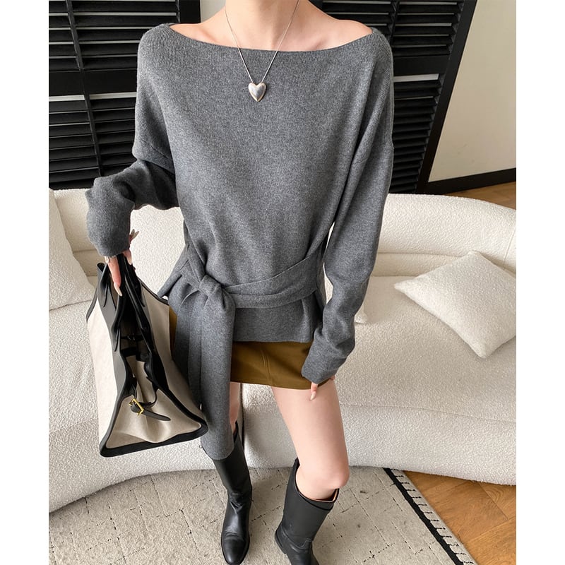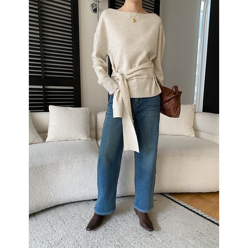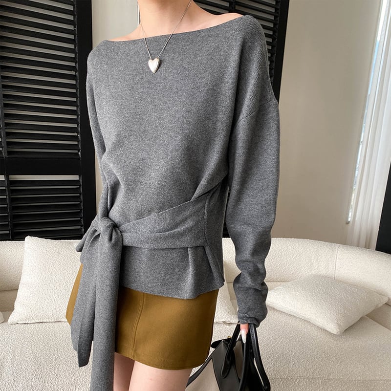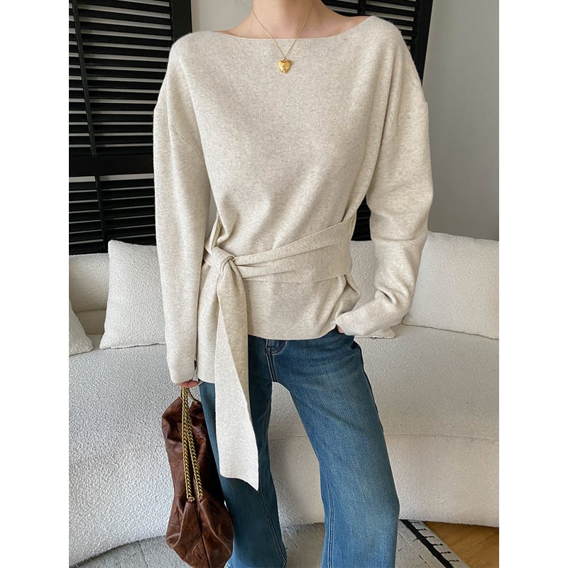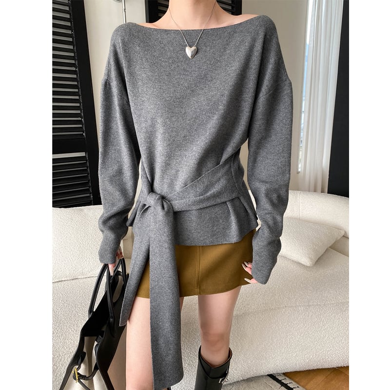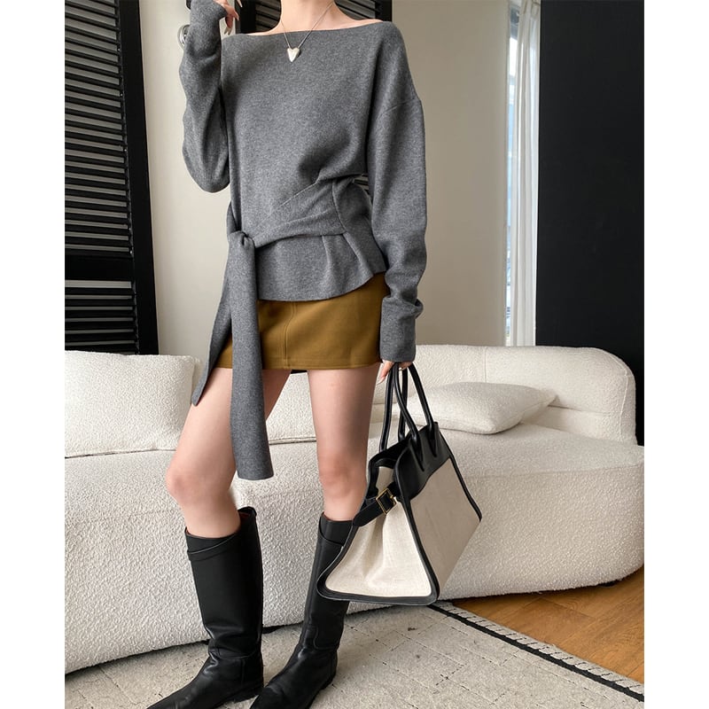 トップス ニットセーター タイで絡む すっきりシルエット グレー ベージュ
