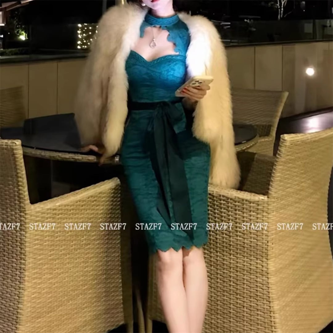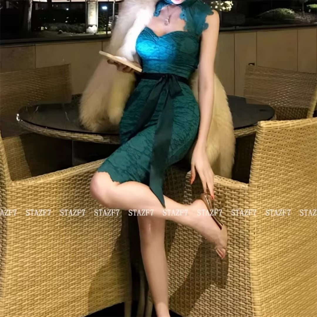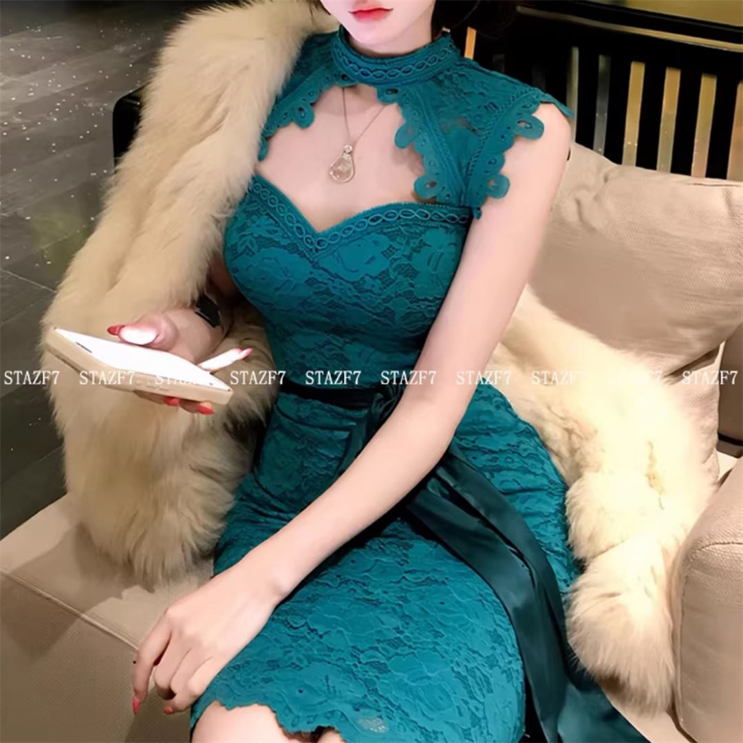 ワンピース レース リボン ボディコンな 透かし彫り 美人度アップ ブルー S M L XL 2XL