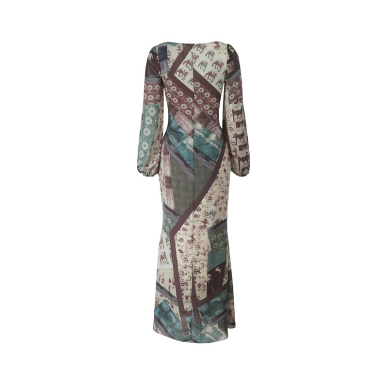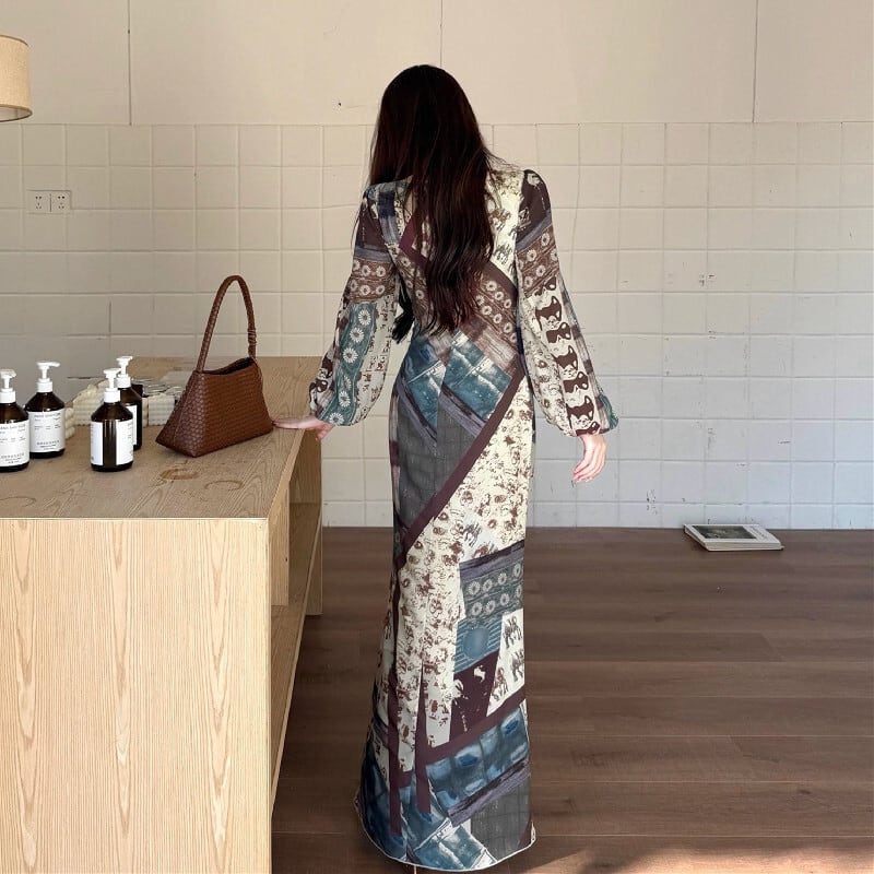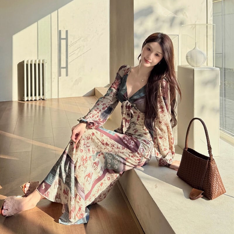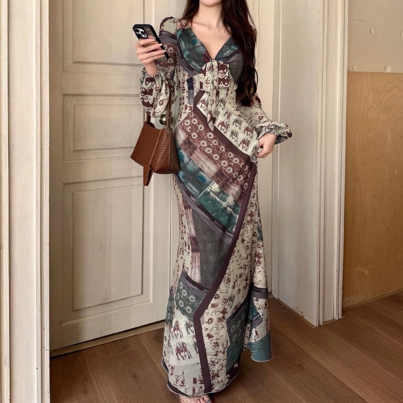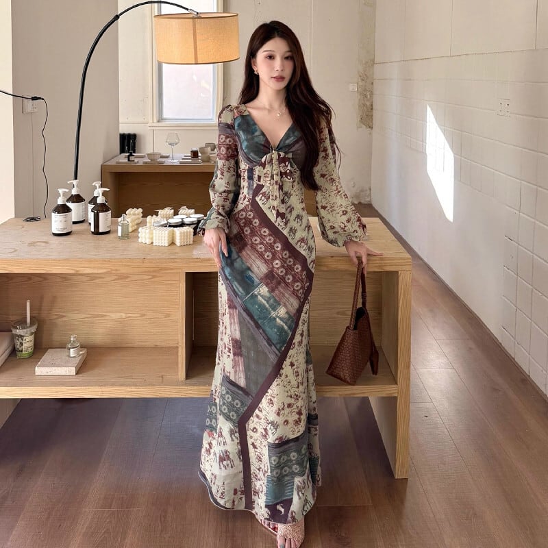 ロングワンピース プリント エキゾチック Vネック 大人っぽい S M L
