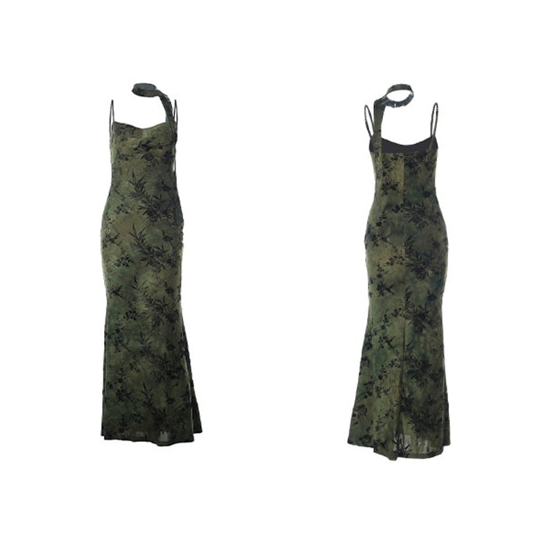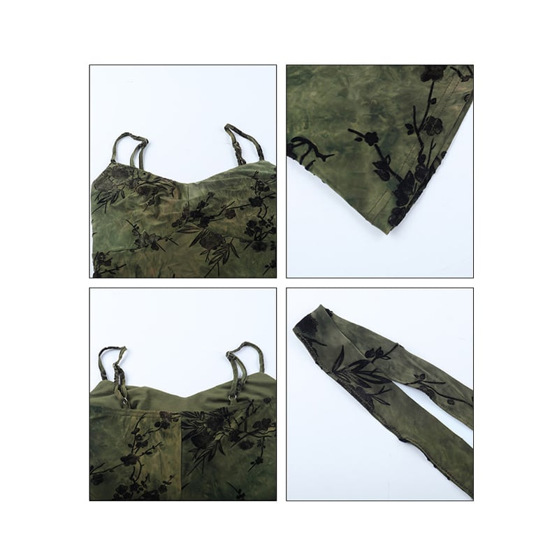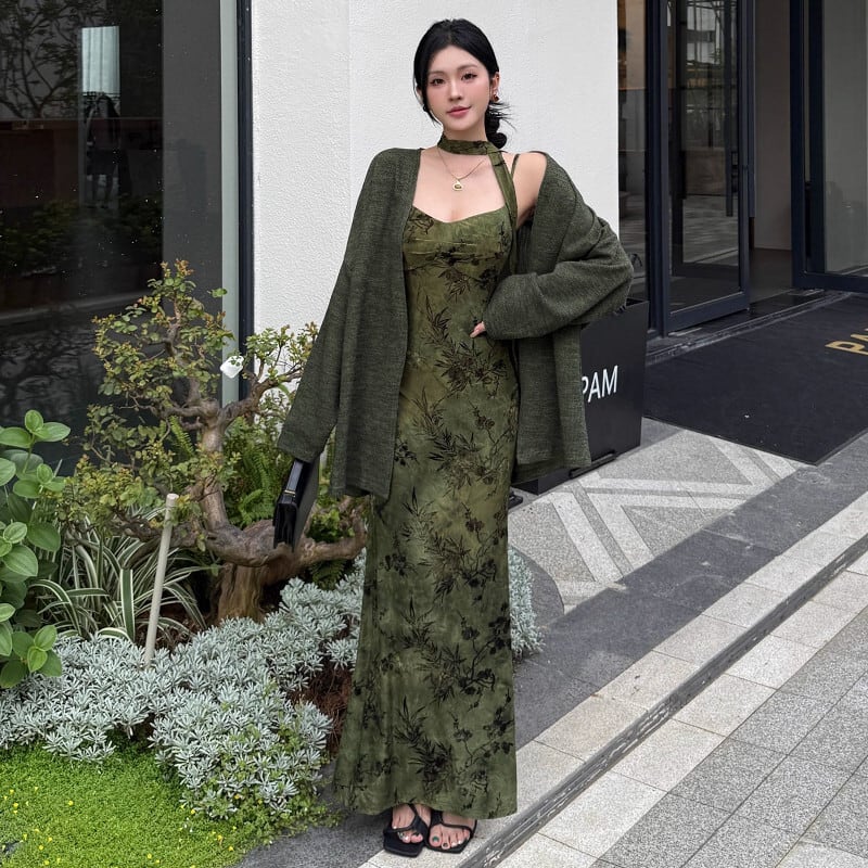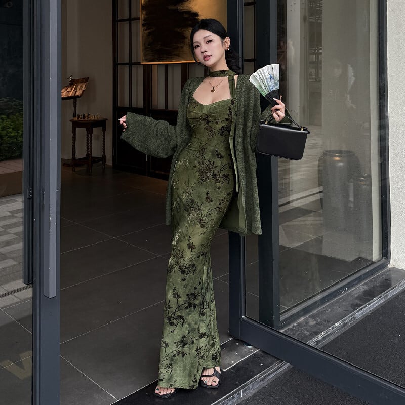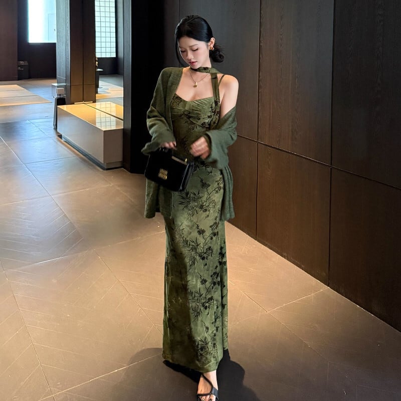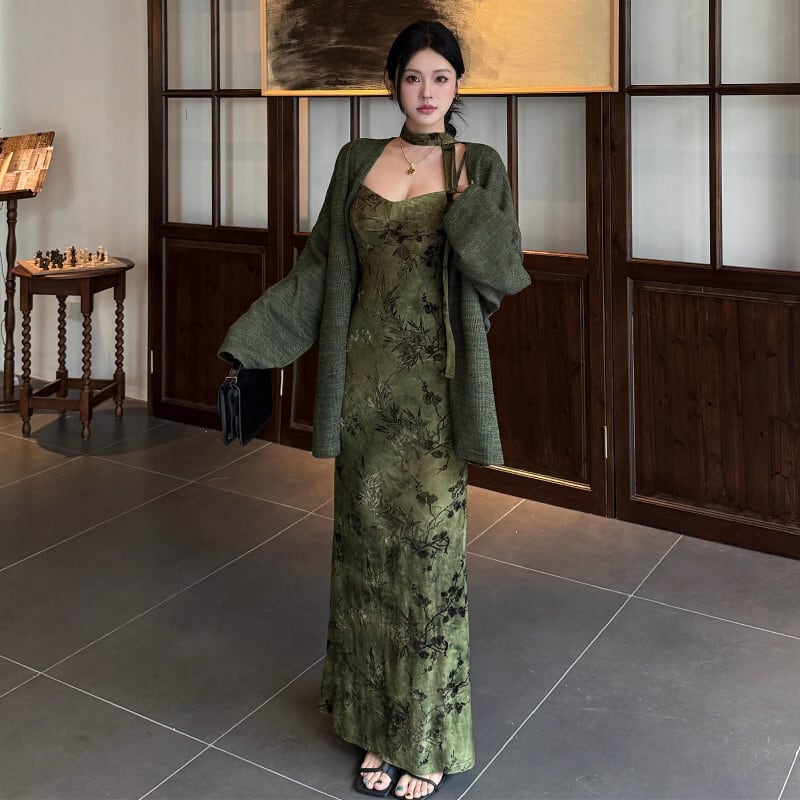 セットアップ チャイナ風 カーディガン+プリント ワンピース ダークグリーン S M L