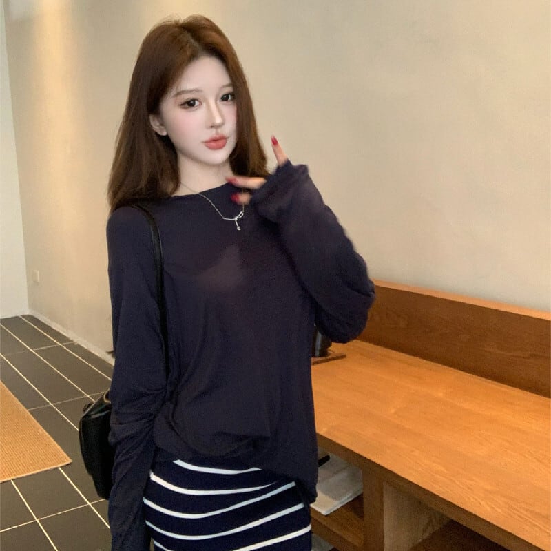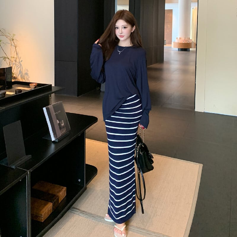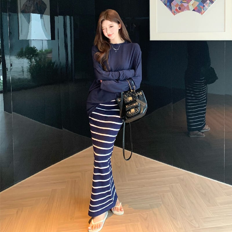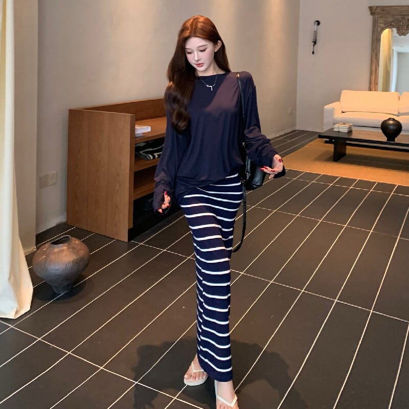 セットアップ 無地 長袖 Tシャツ+ストライプ柄 スカート ダークブルー S M L