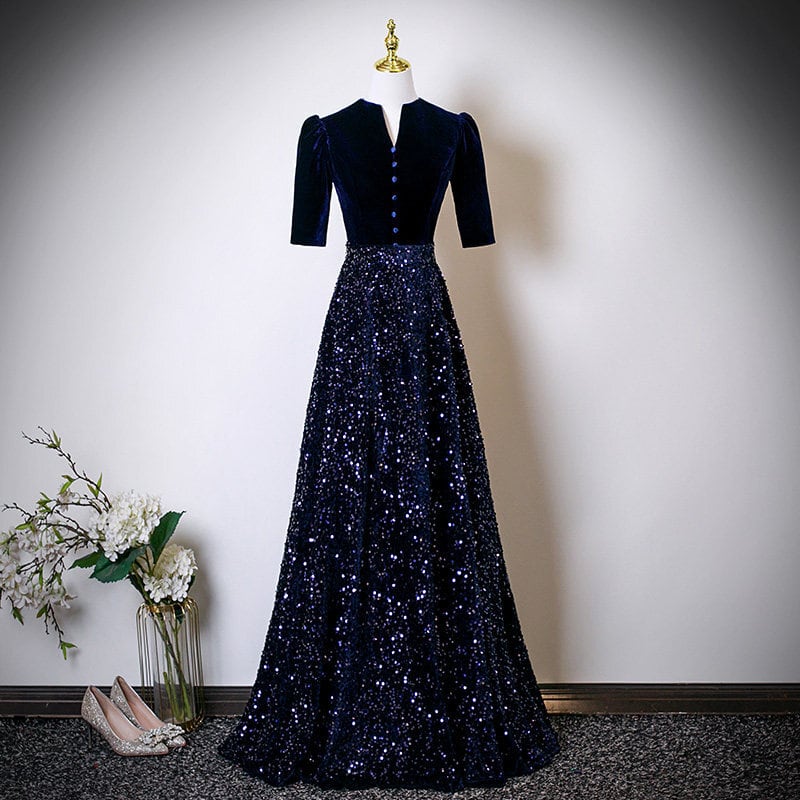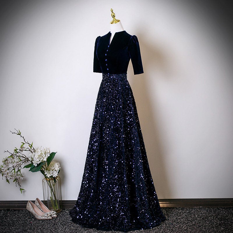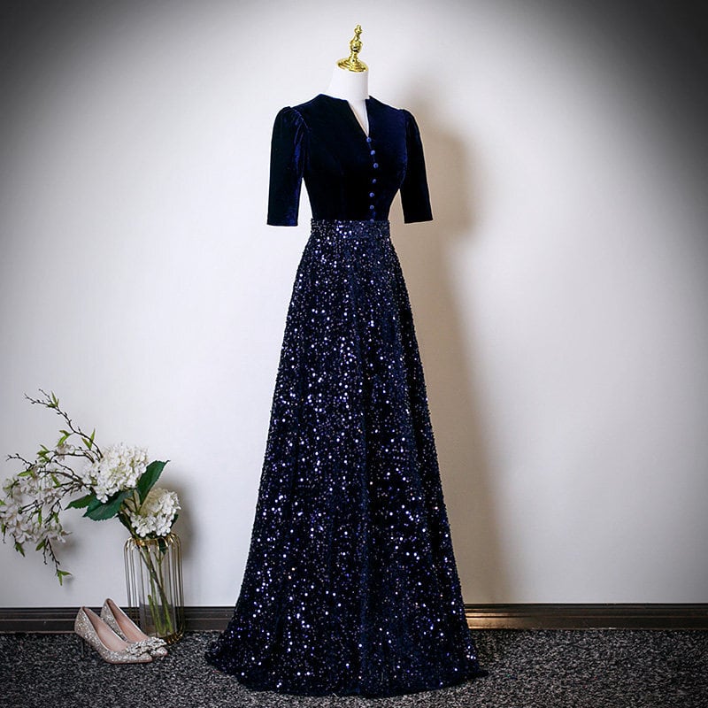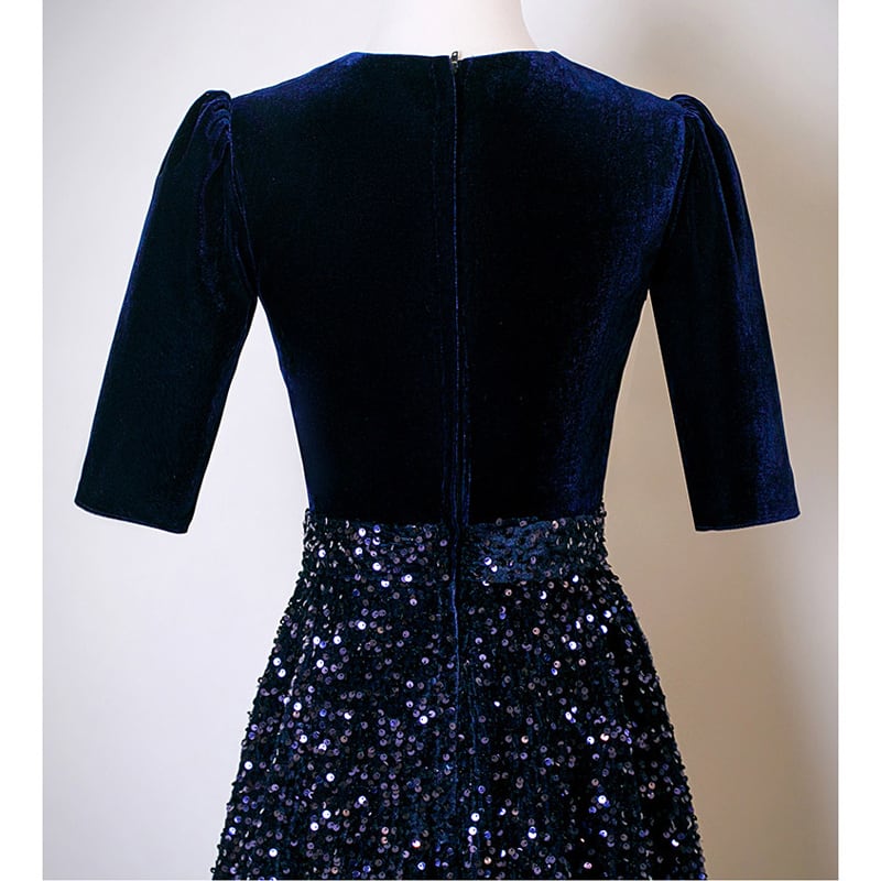 パーティードレス ベルベット スパンコール 目を奪われる キラキラ ダークブルー