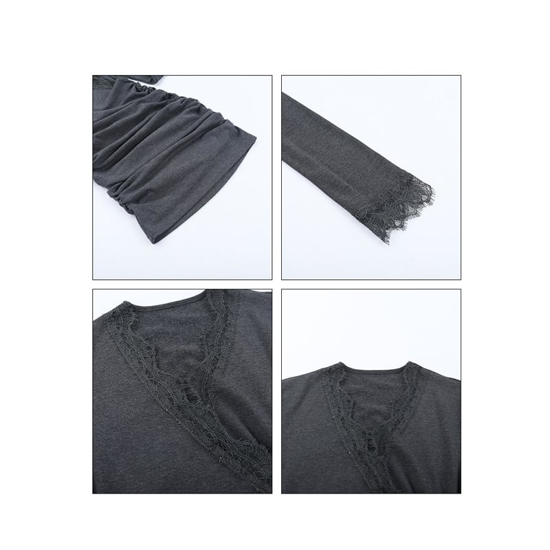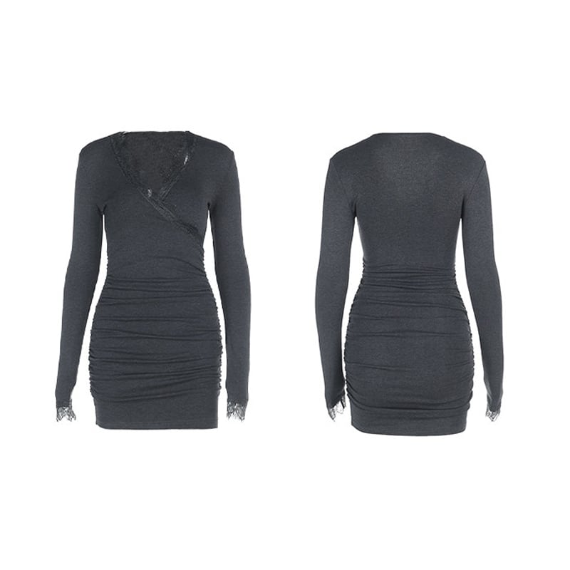 ワンピース セクシー レース Vネック 長袖 膝上 シルエット ダークグレー S M L