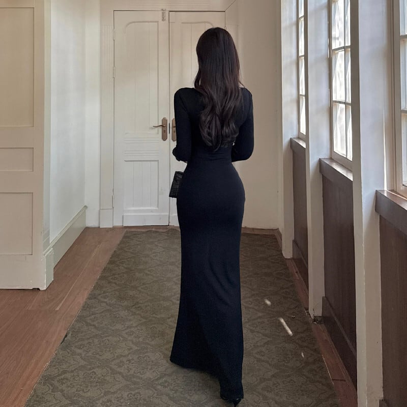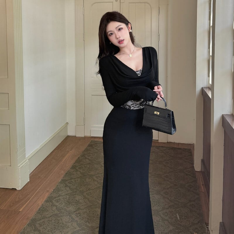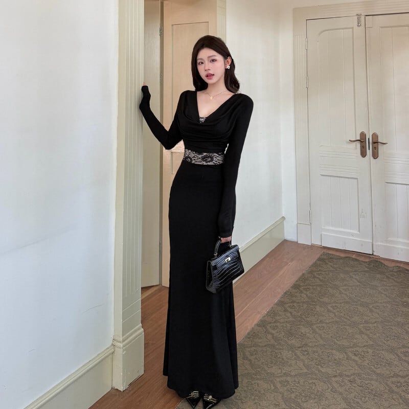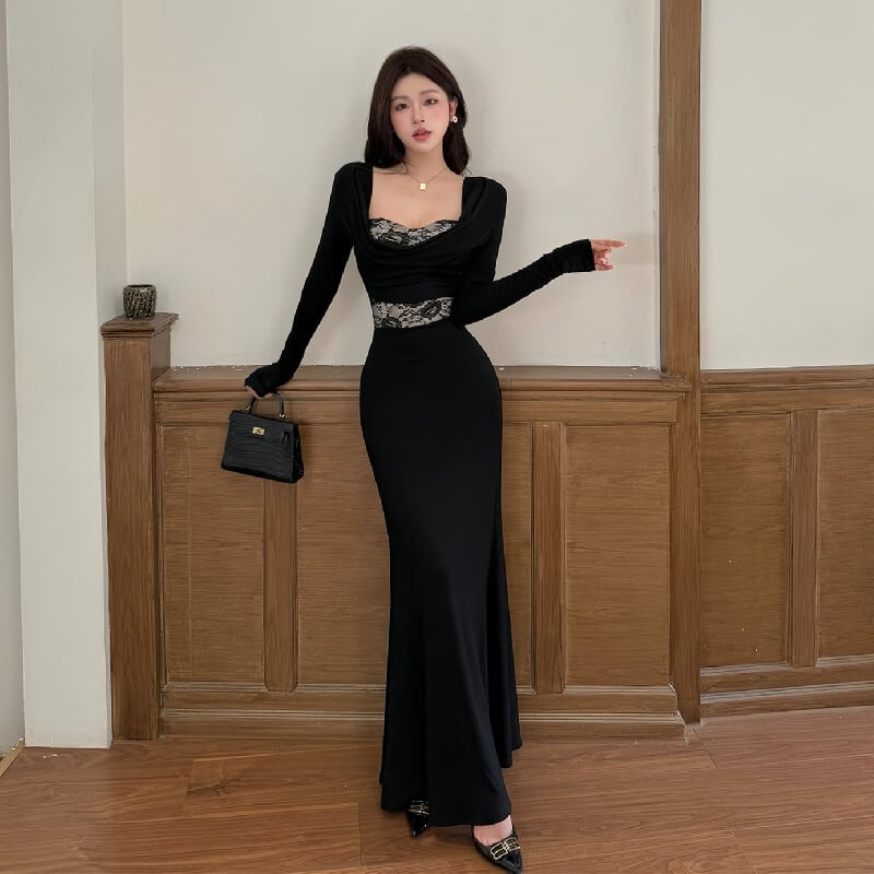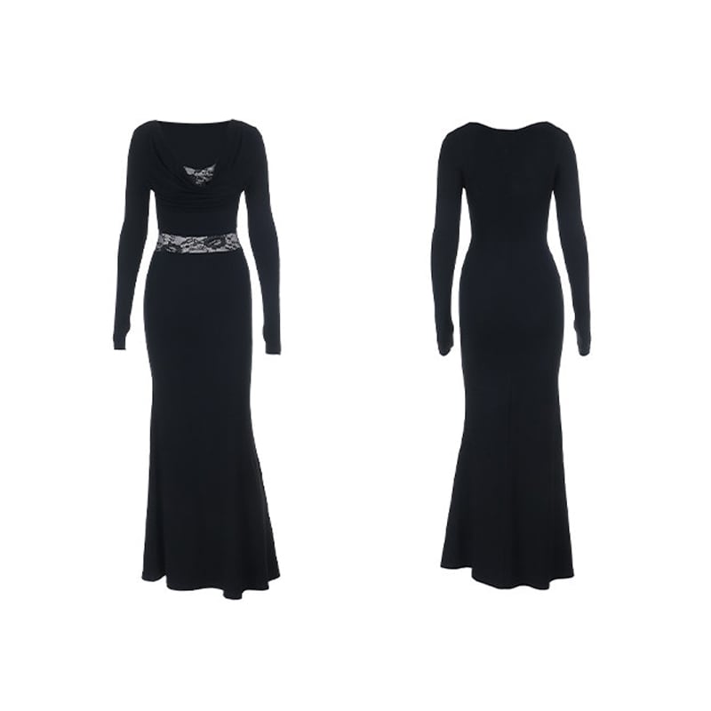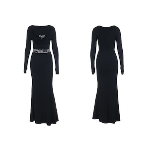 ロングワンピース レース 魅せられる 細見え効果抜群 ブラック S M L