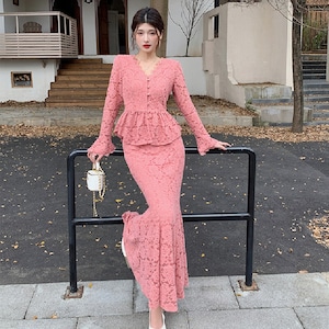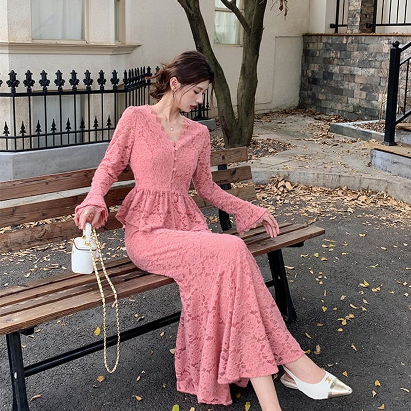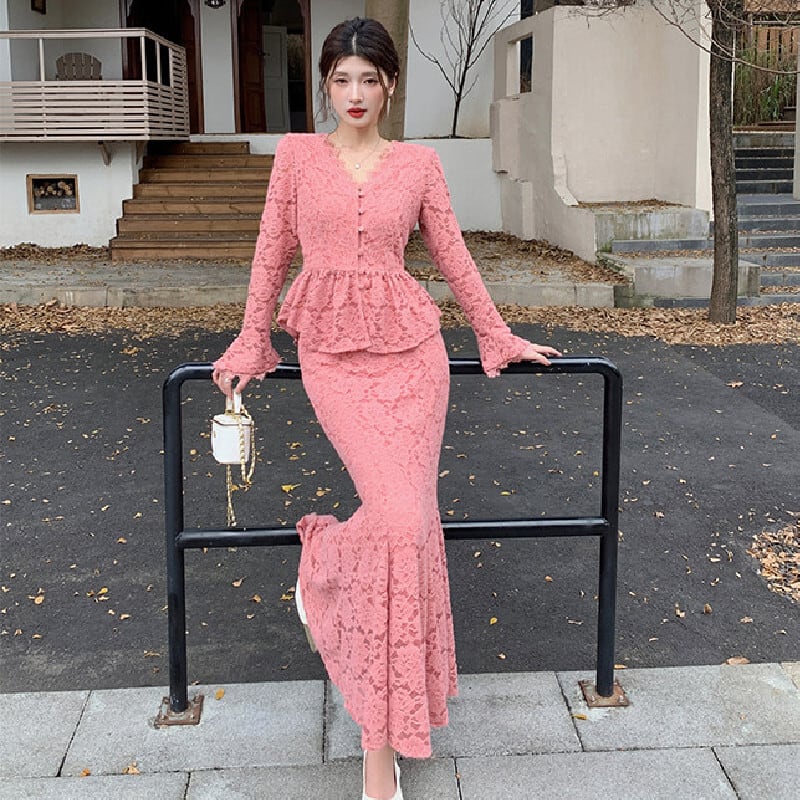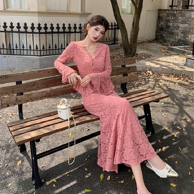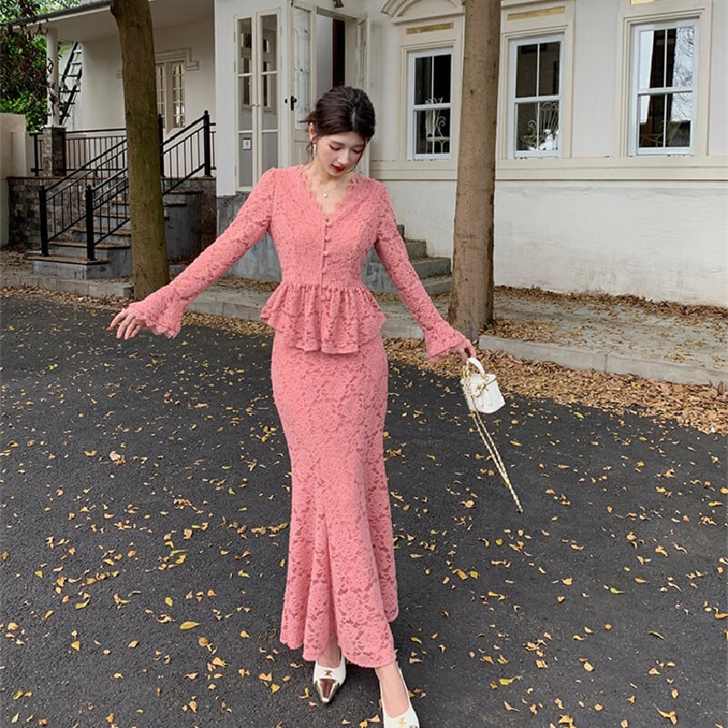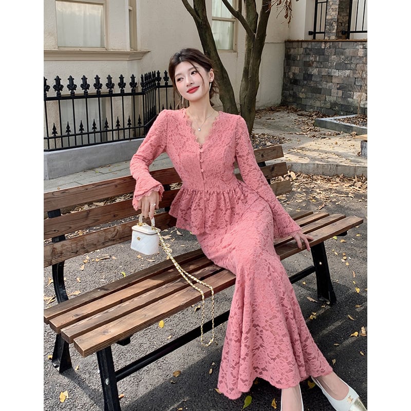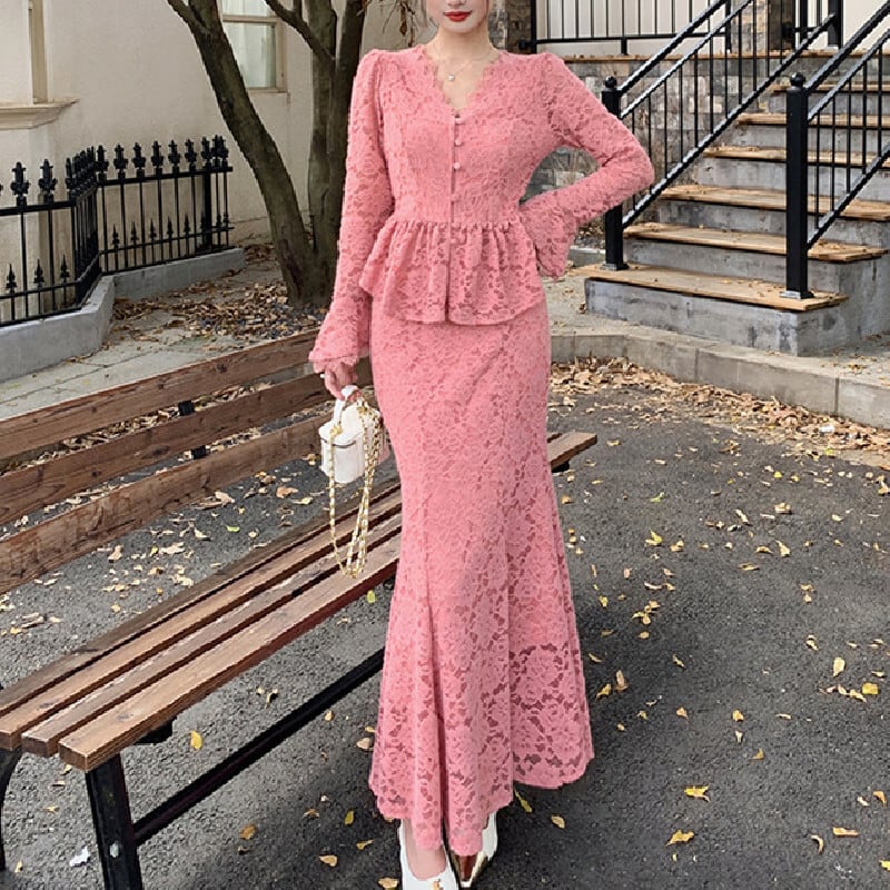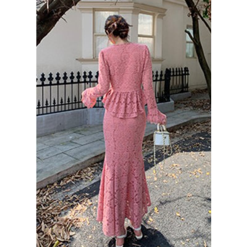 セットアップ トップス+スカート レース Vネック フェミニン 長袖 ピンク S M L XL 2XL
