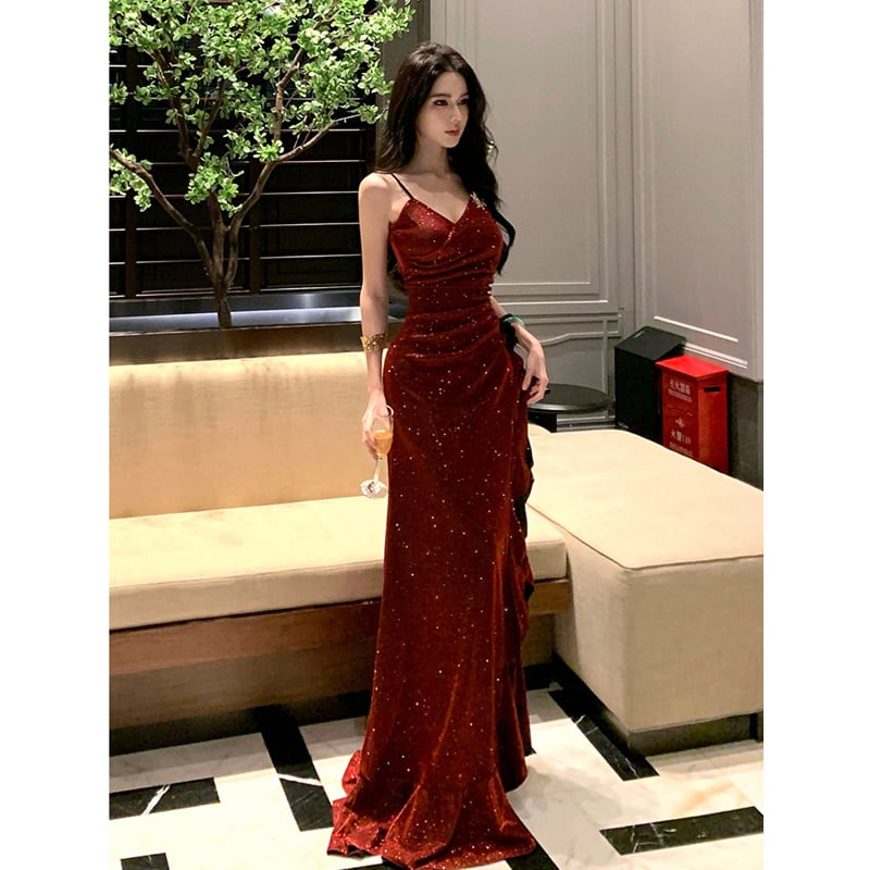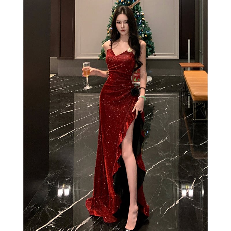 パーティードレス 魅せる スリット ペプラム 着まわし抜群 ワインレッド S M L