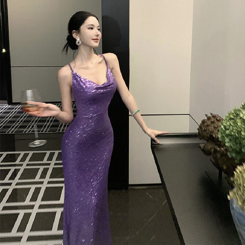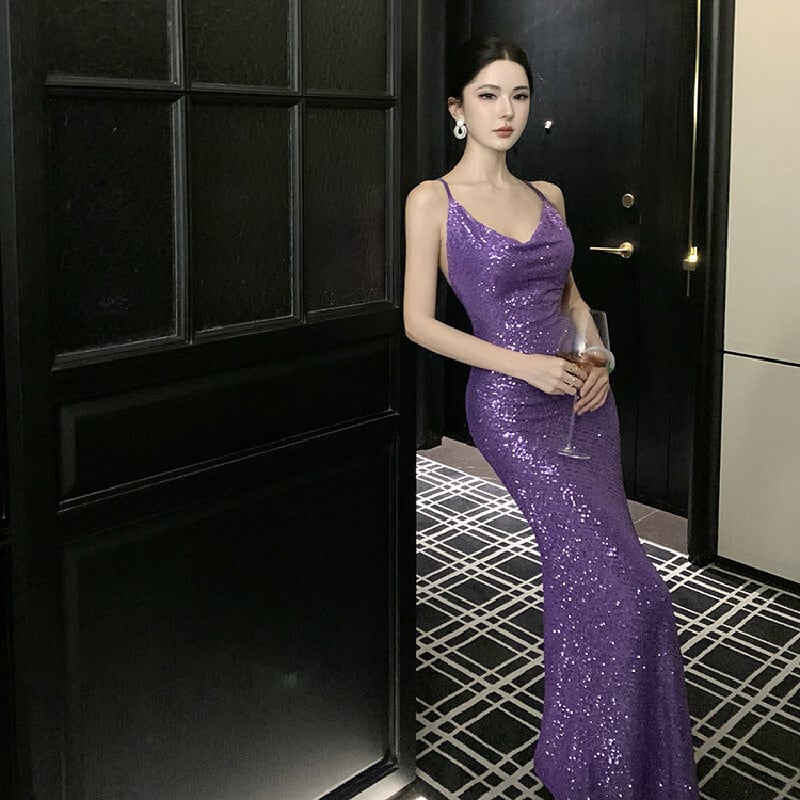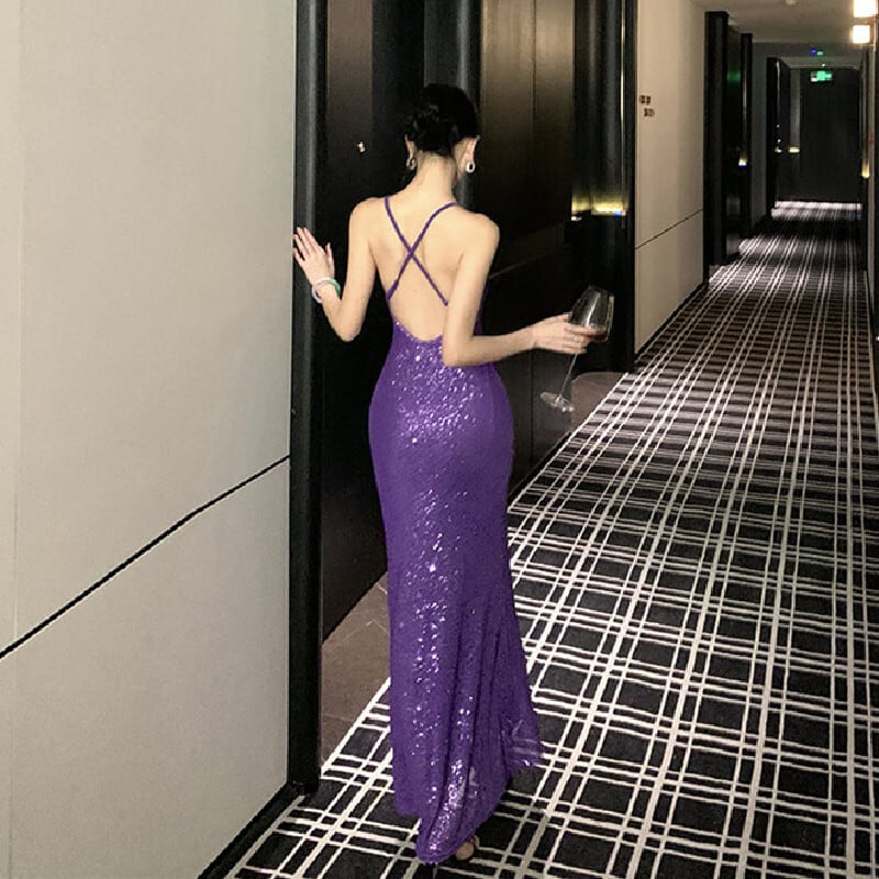 ワンピース スパンコール バックレス 目を奪われる パープル S M L