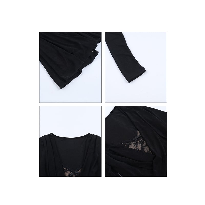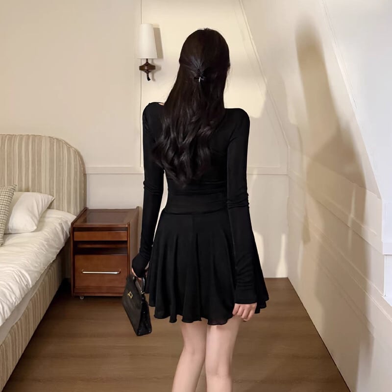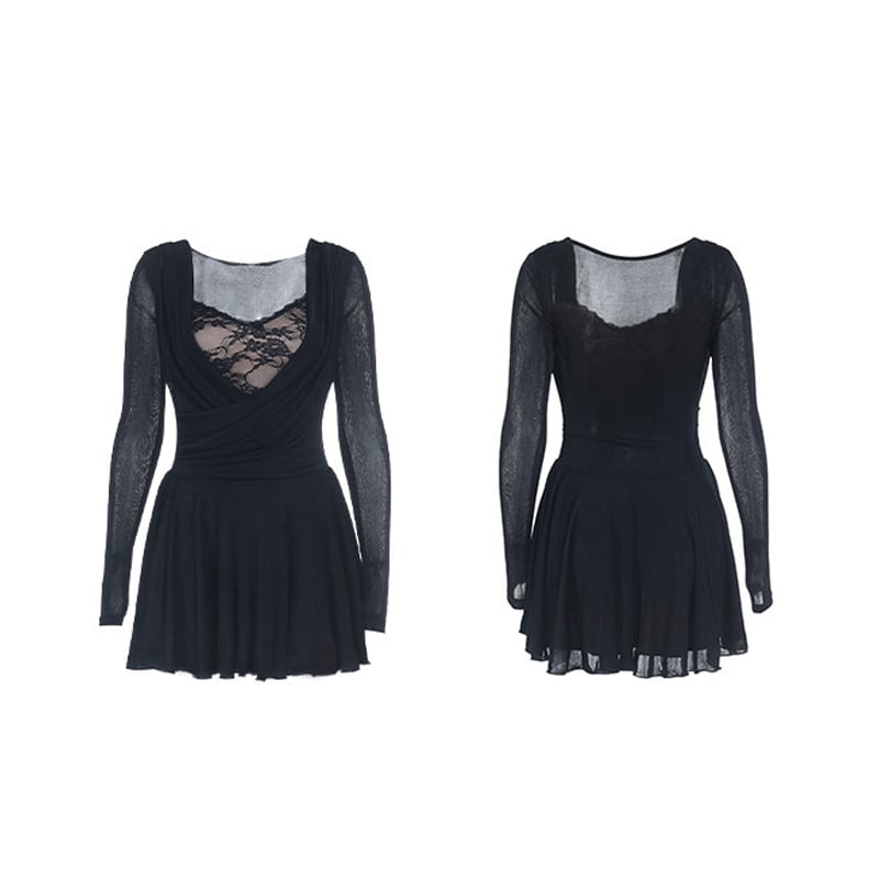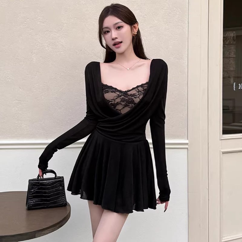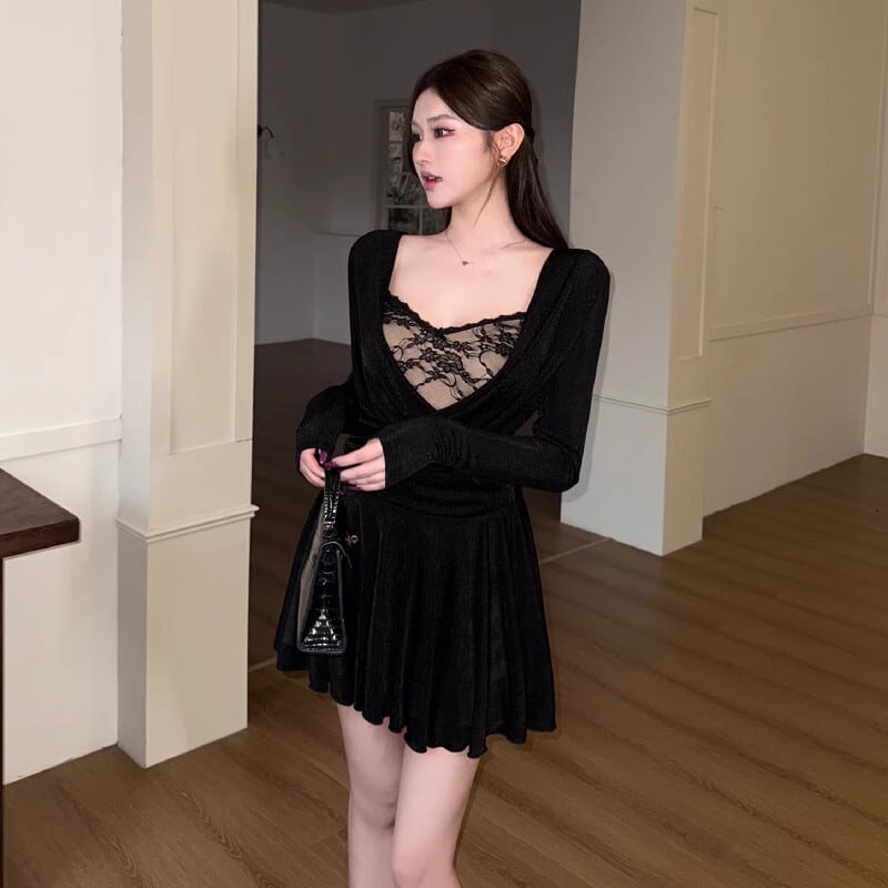 ワンピース レース 長袖 フィットウエスト Aライン ブラック S M L