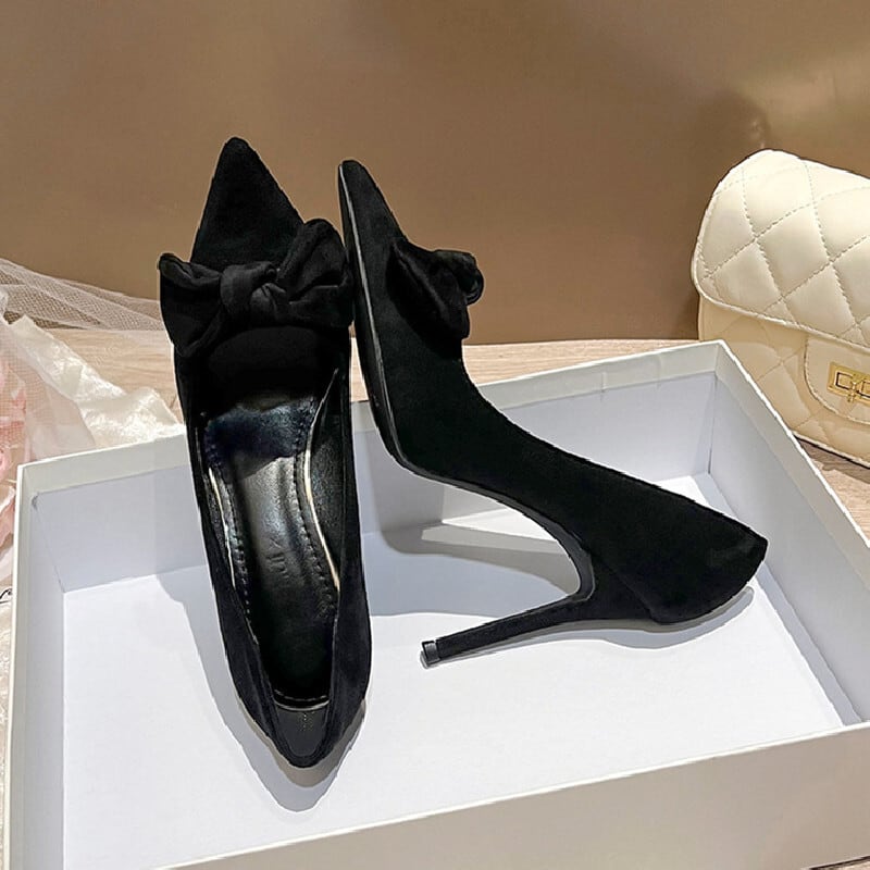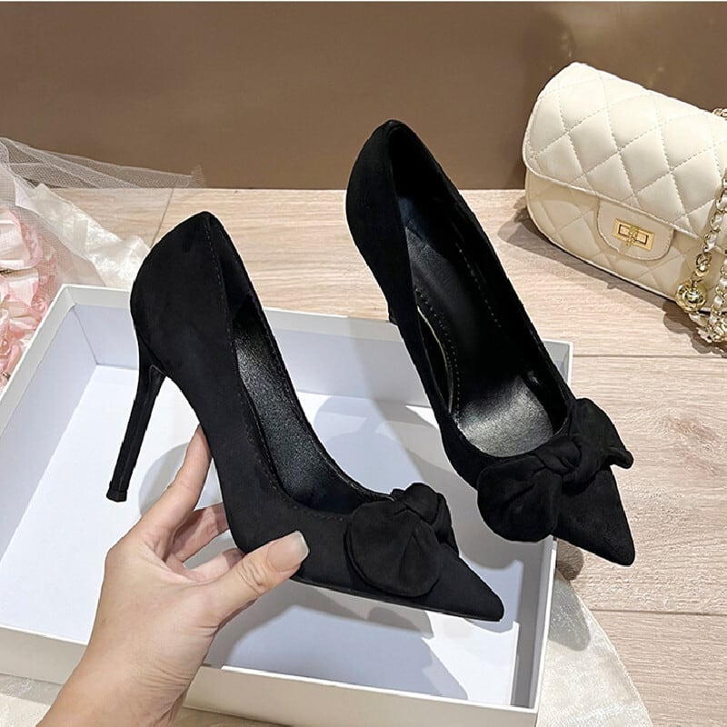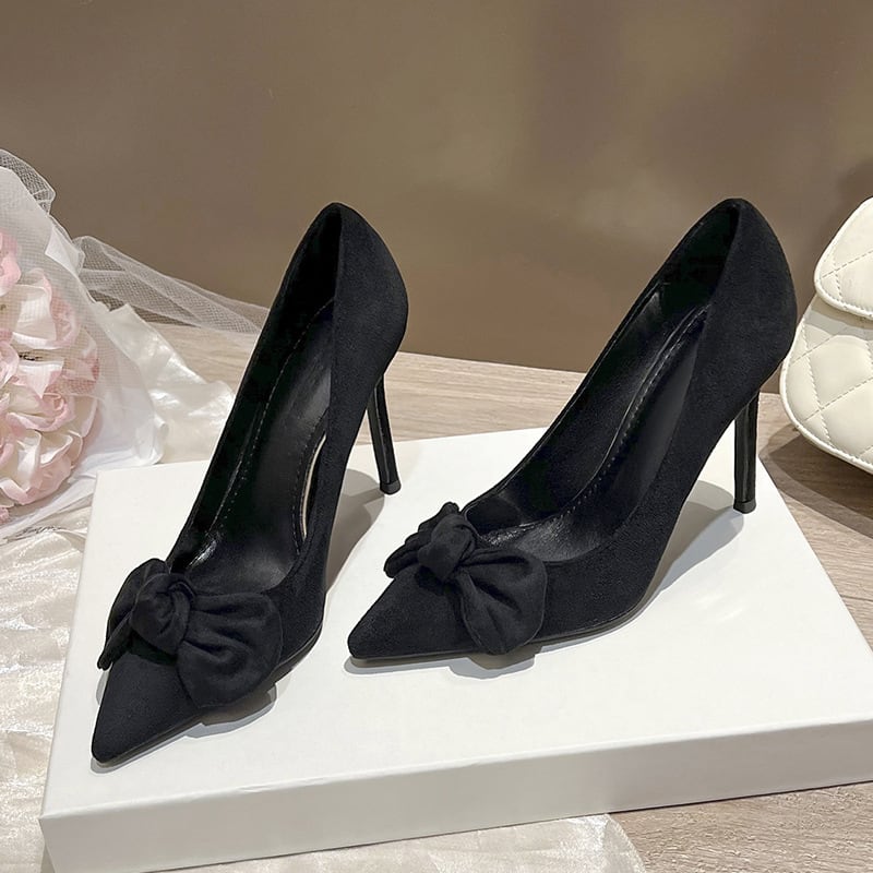 シューズ パンプス スエード 高さ2種 蝶リボン ブラック 8CM/10CM
