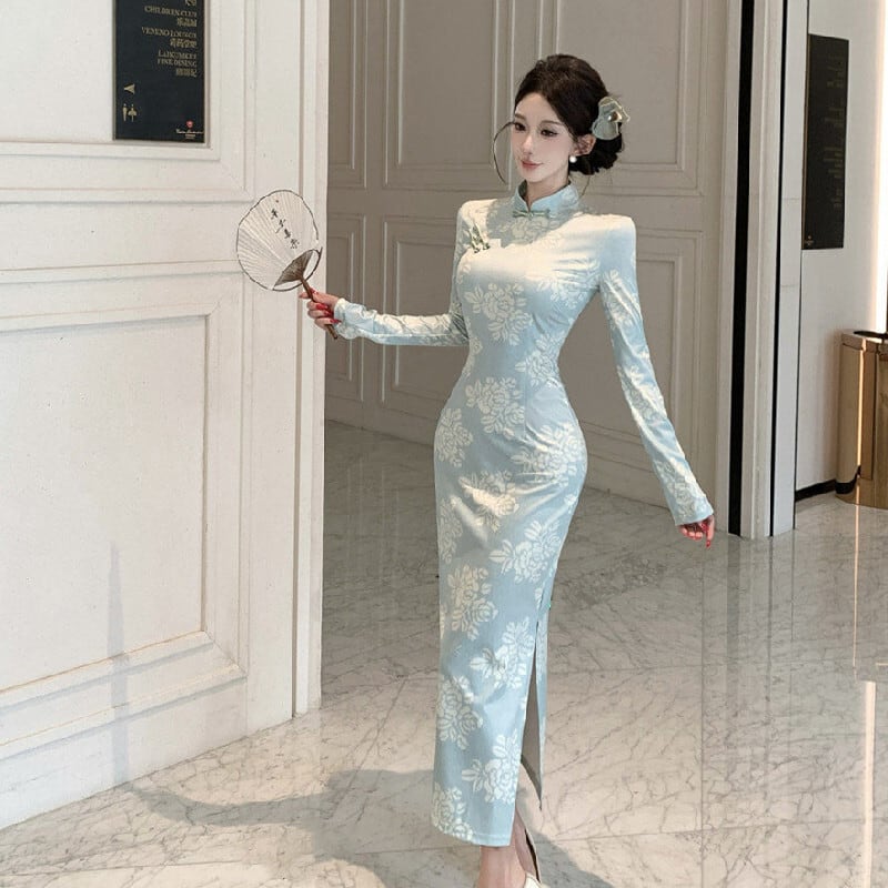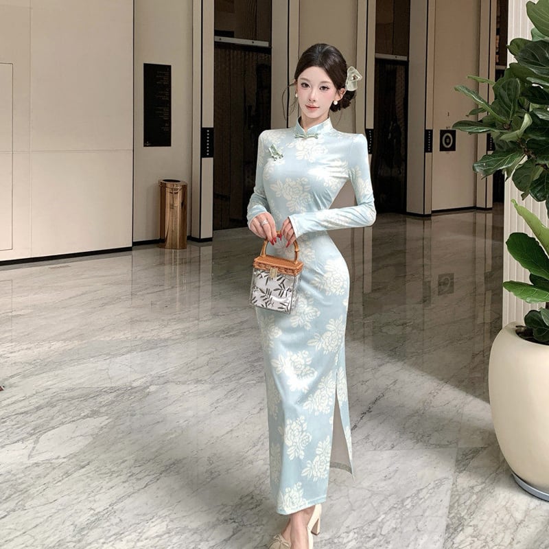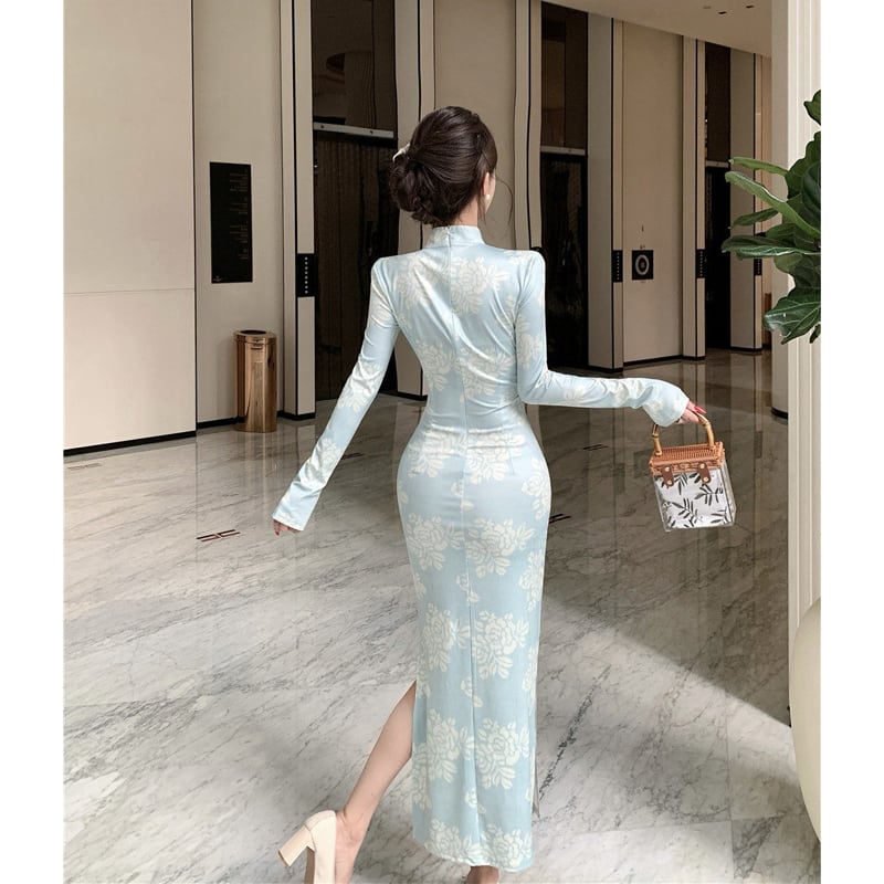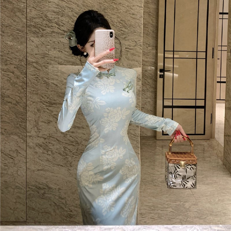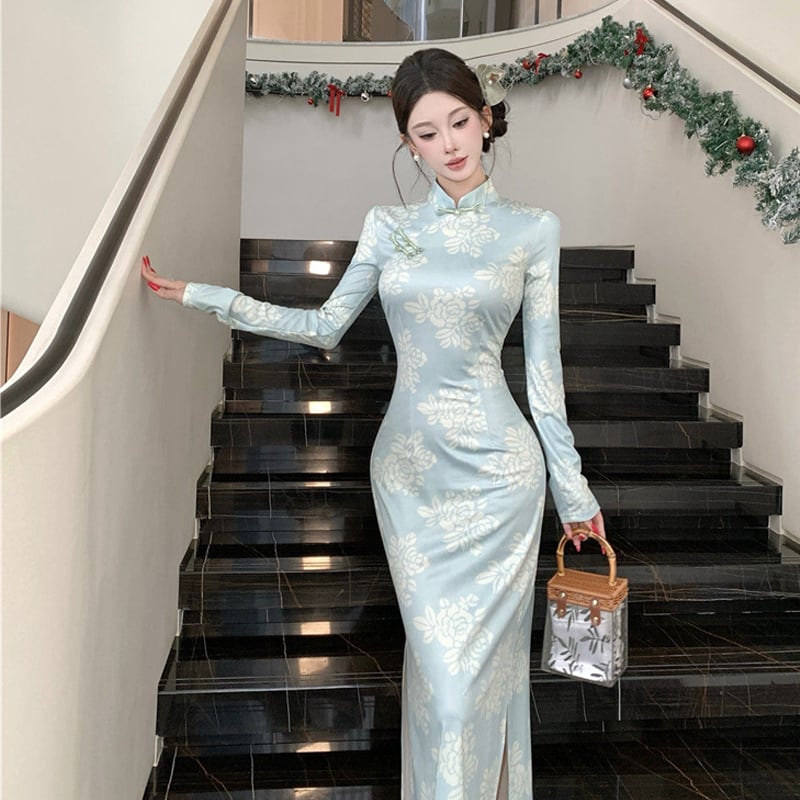 ワンピース チャイナ風 花柄 エレガント 長袖 ライトグリーン S M L