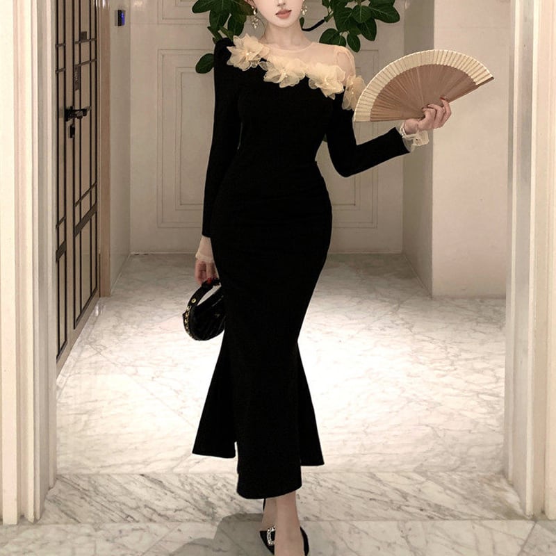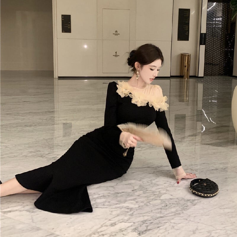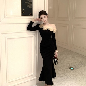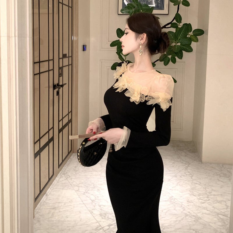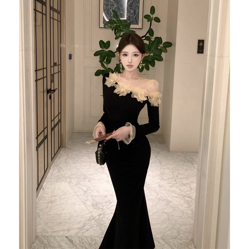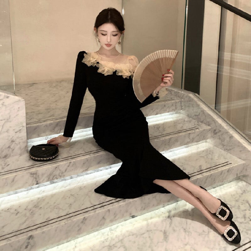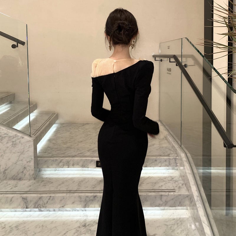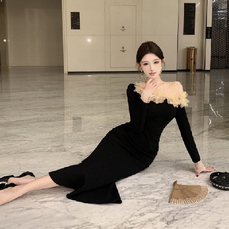 ワンピース デザイン感 メッシュ シルエット 長袖 ブラック S M L