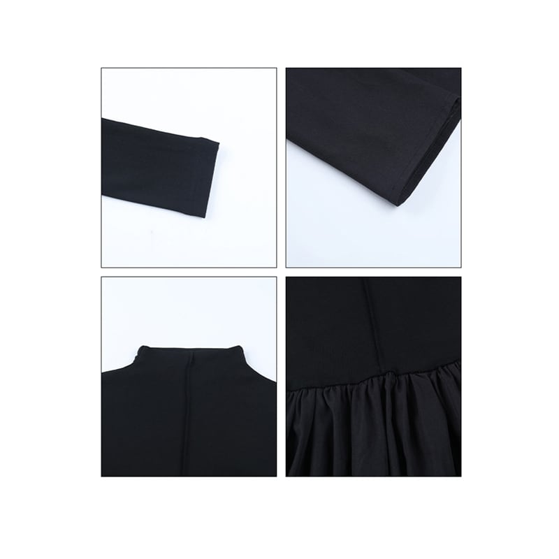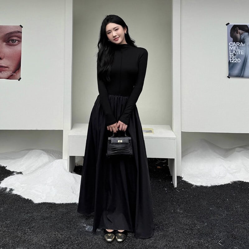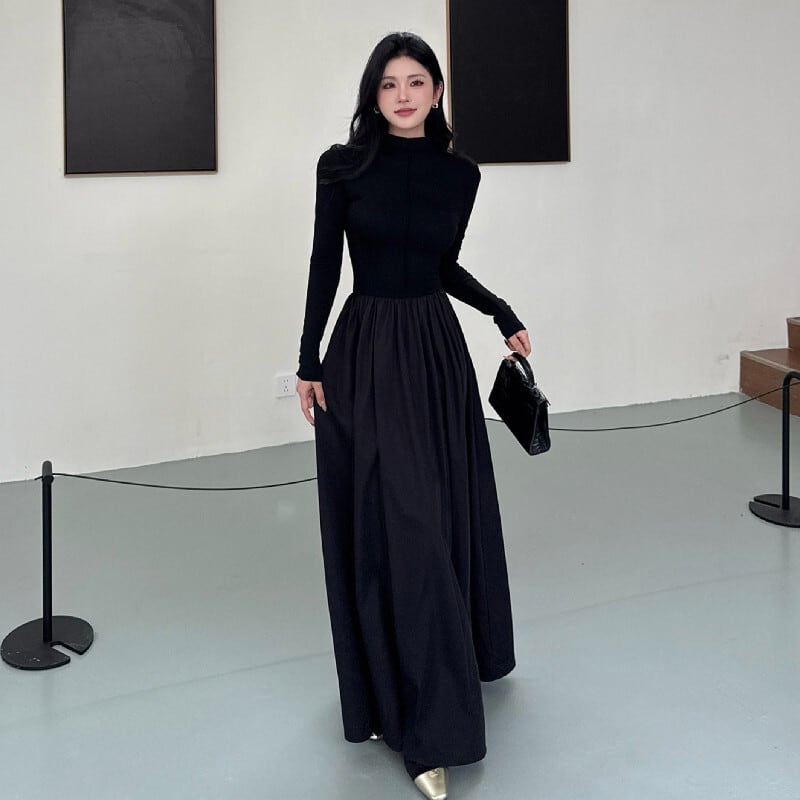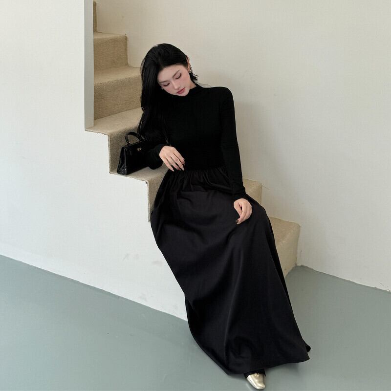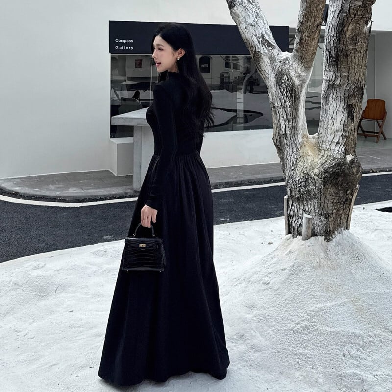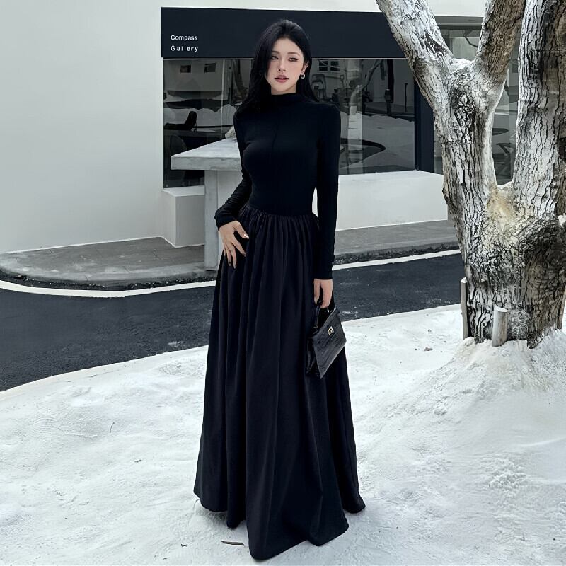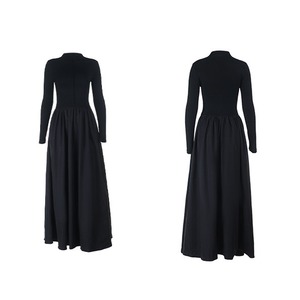ロングワンピース 長袖 レトロ フィットウエスト 無地 ブラック S M L