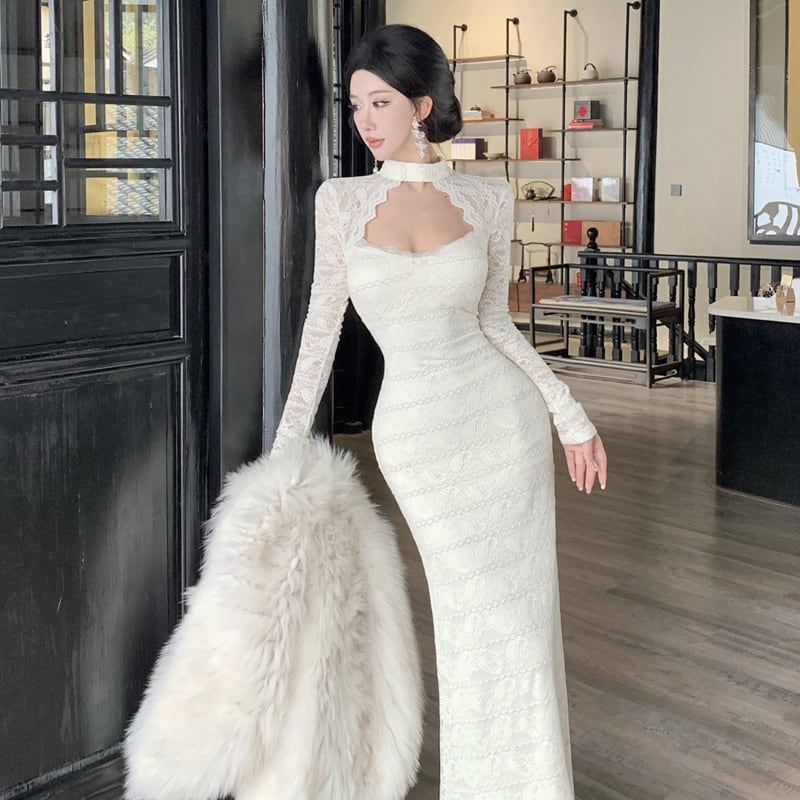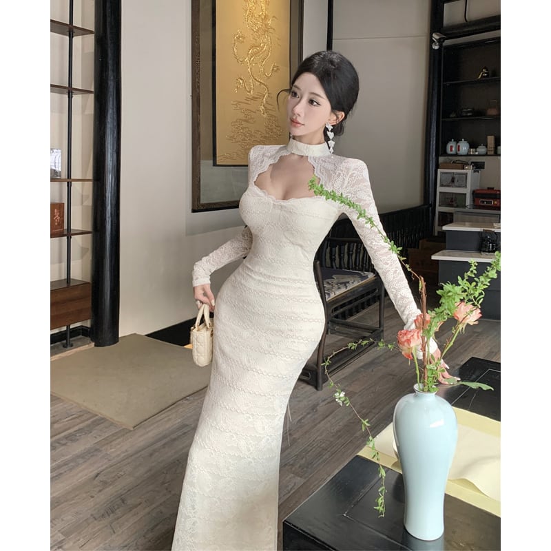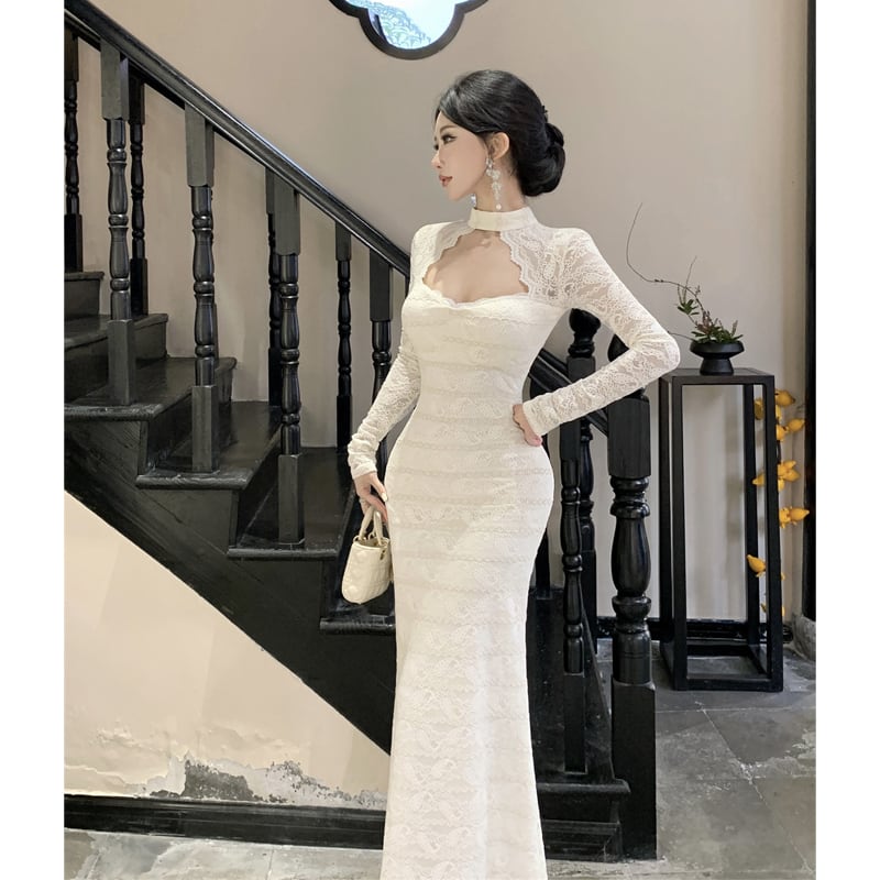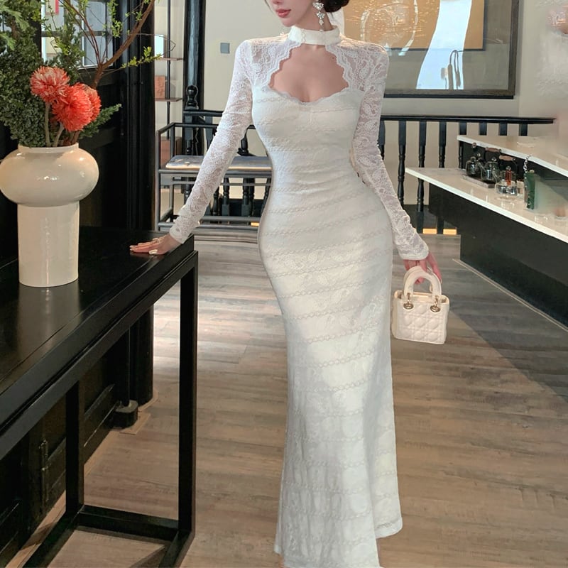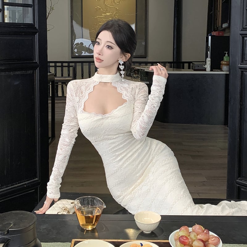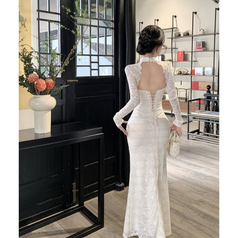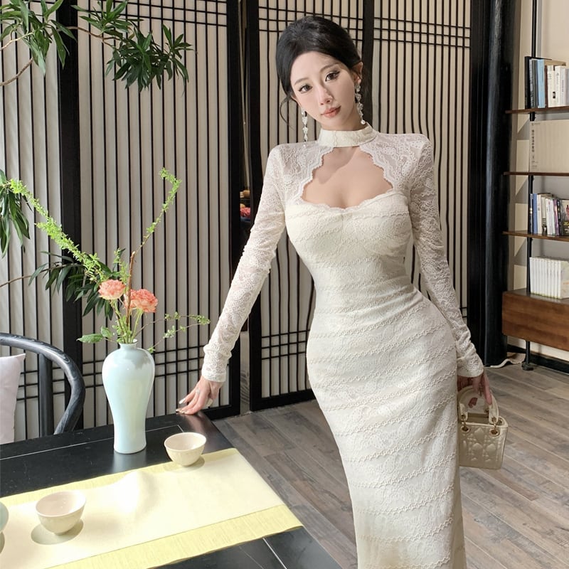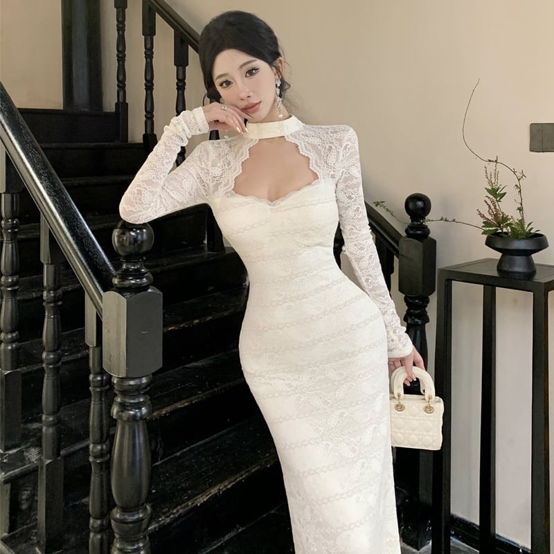ワンピース レース バックリボン 長袖 女っぽさが漂う S M L