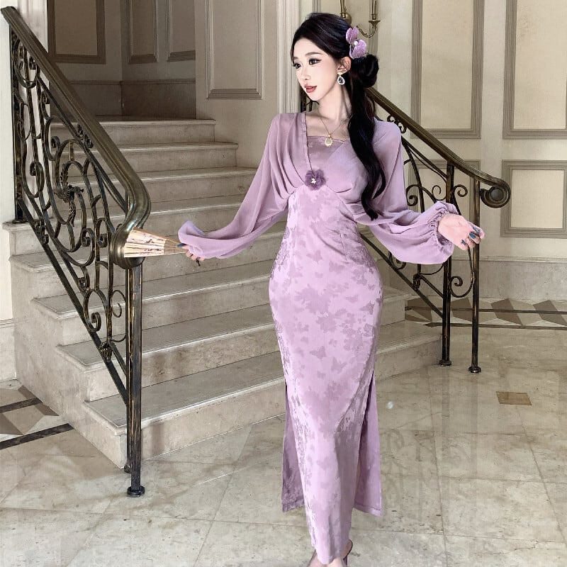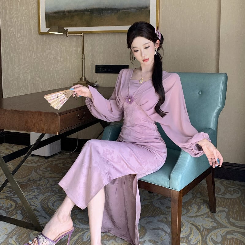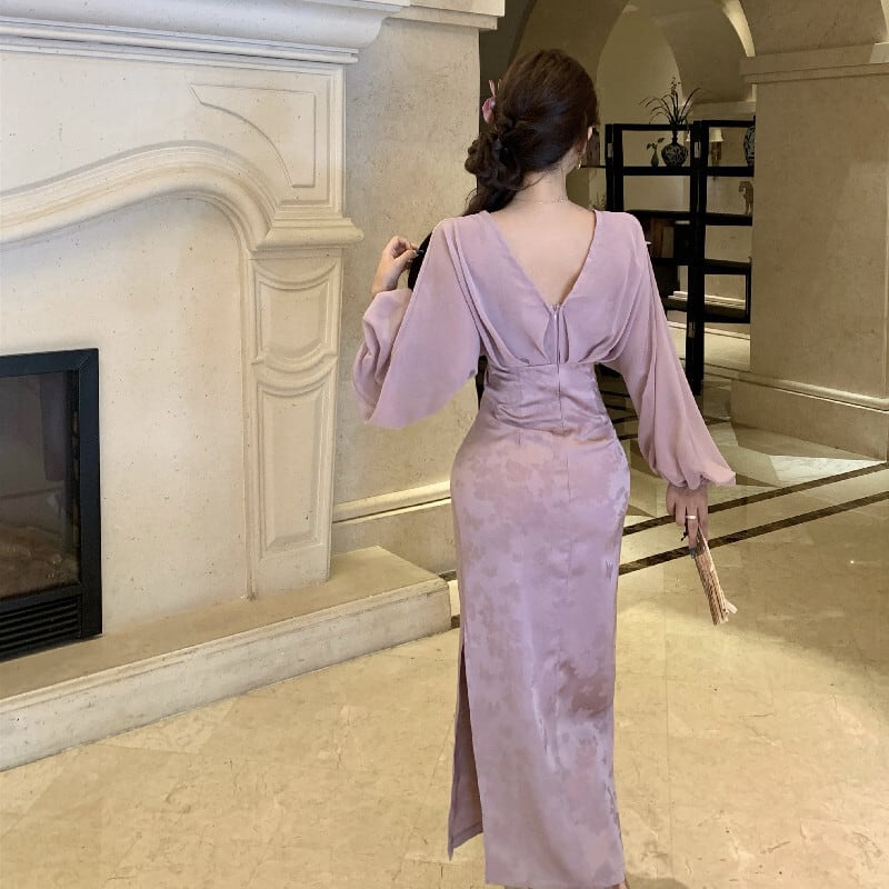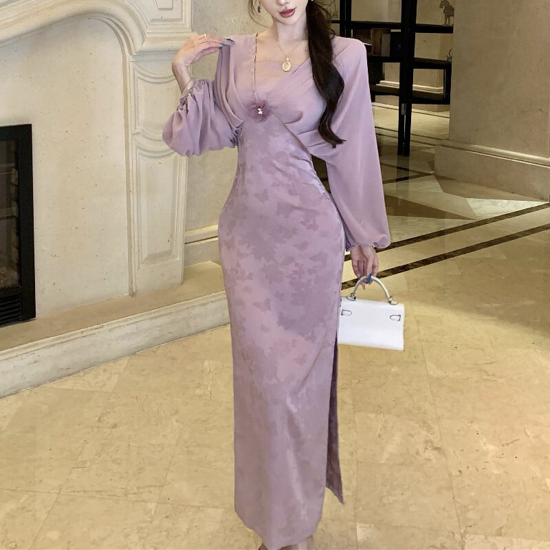 ワンピース ランタンスリーブ スリット 美人度アップ パープル S M L