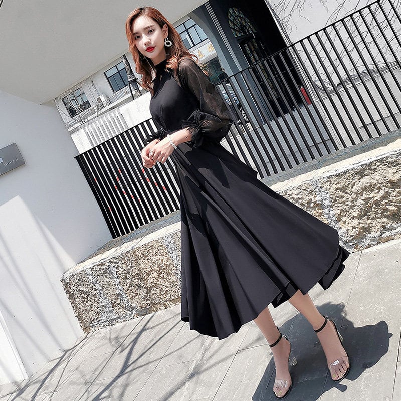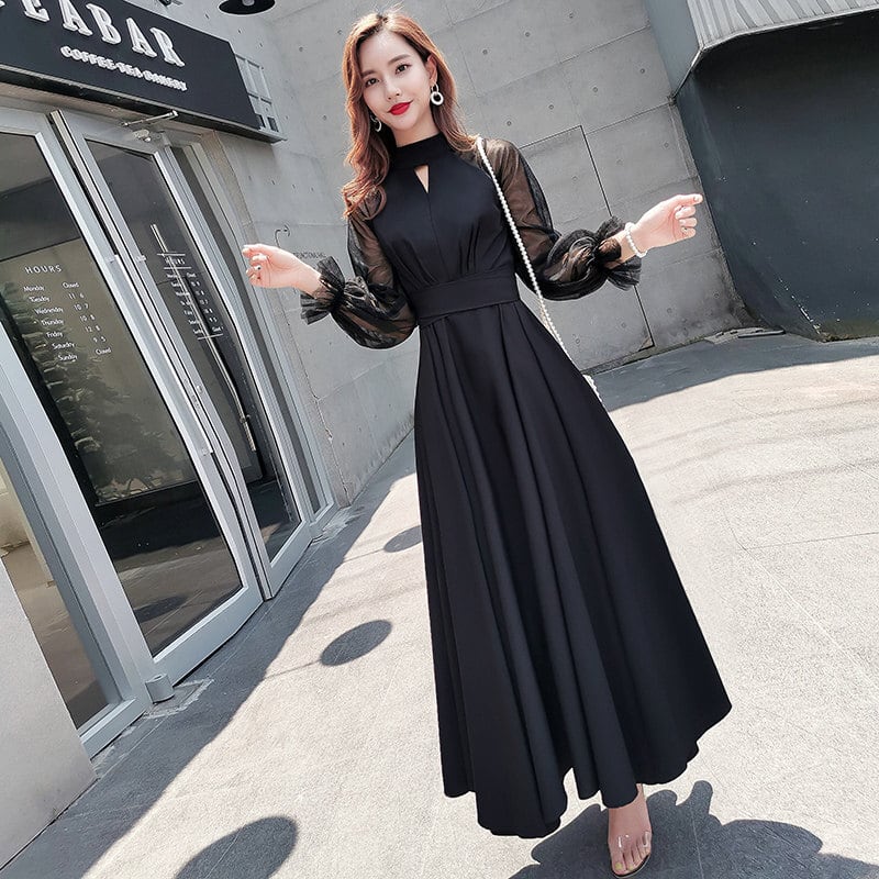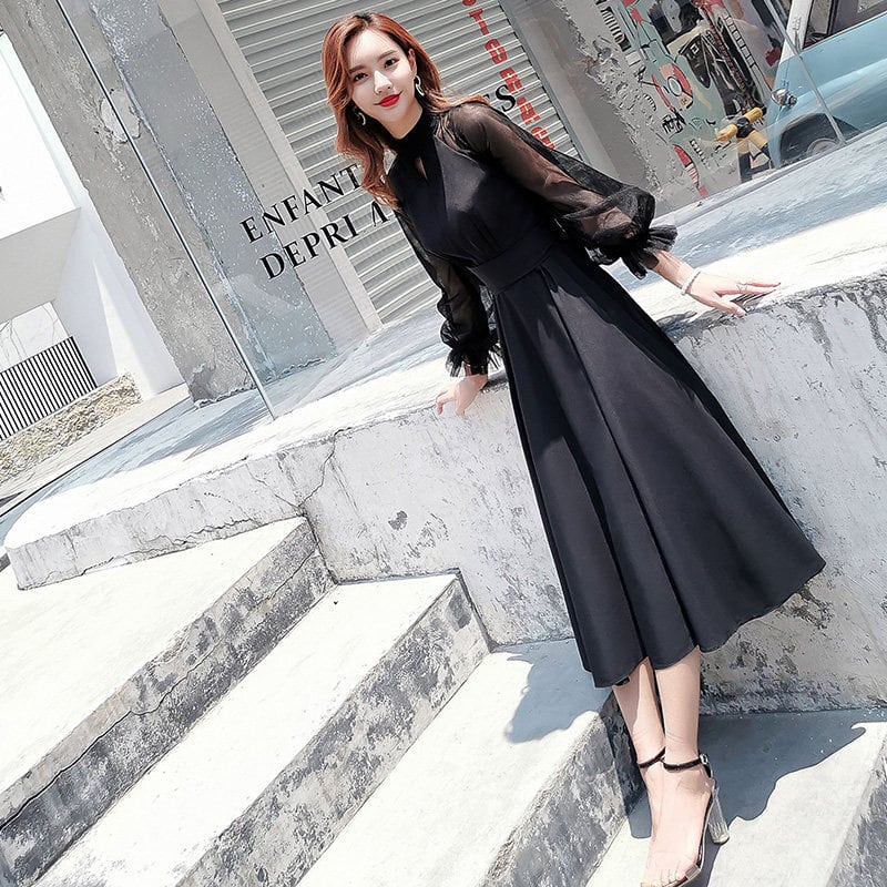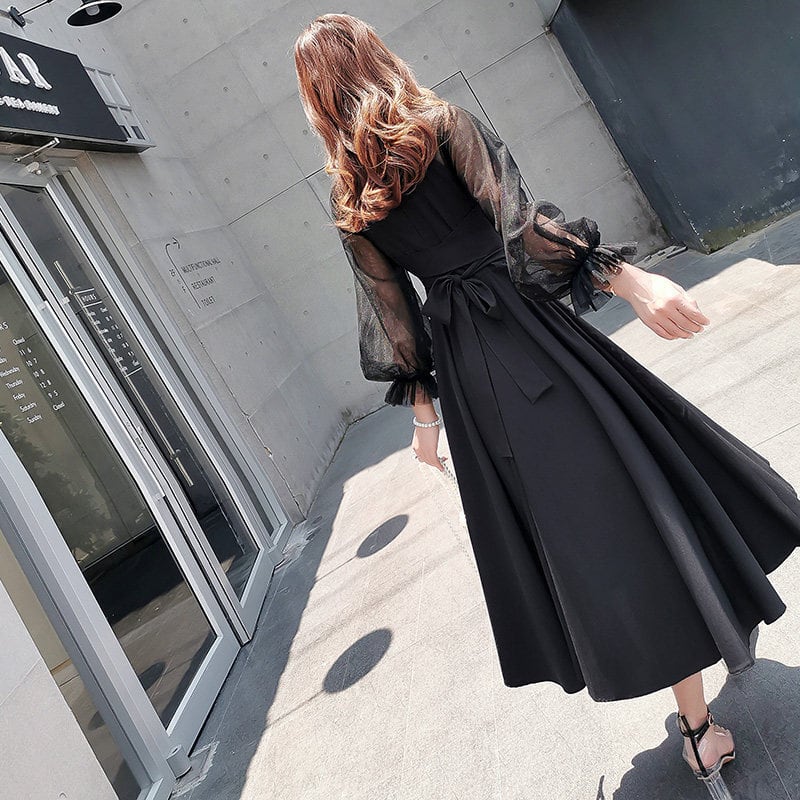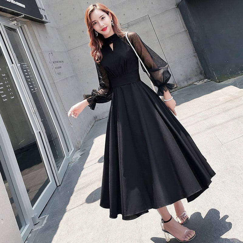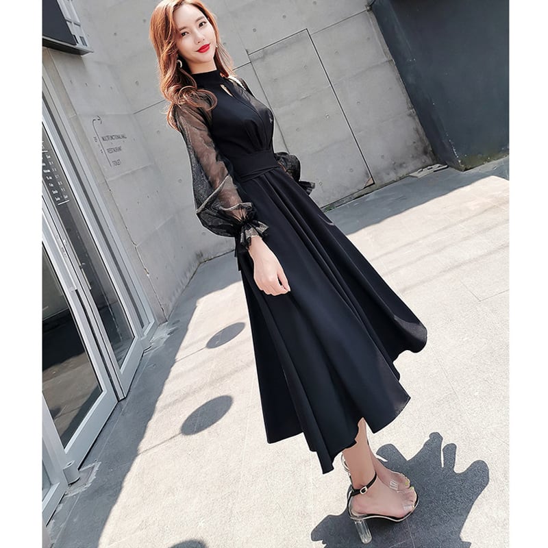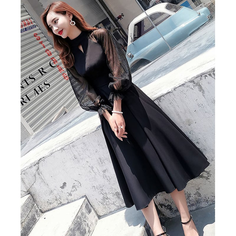 パーティードレス ランタンスリーブ 演奏会 レトロ 気質溢れる ブラック