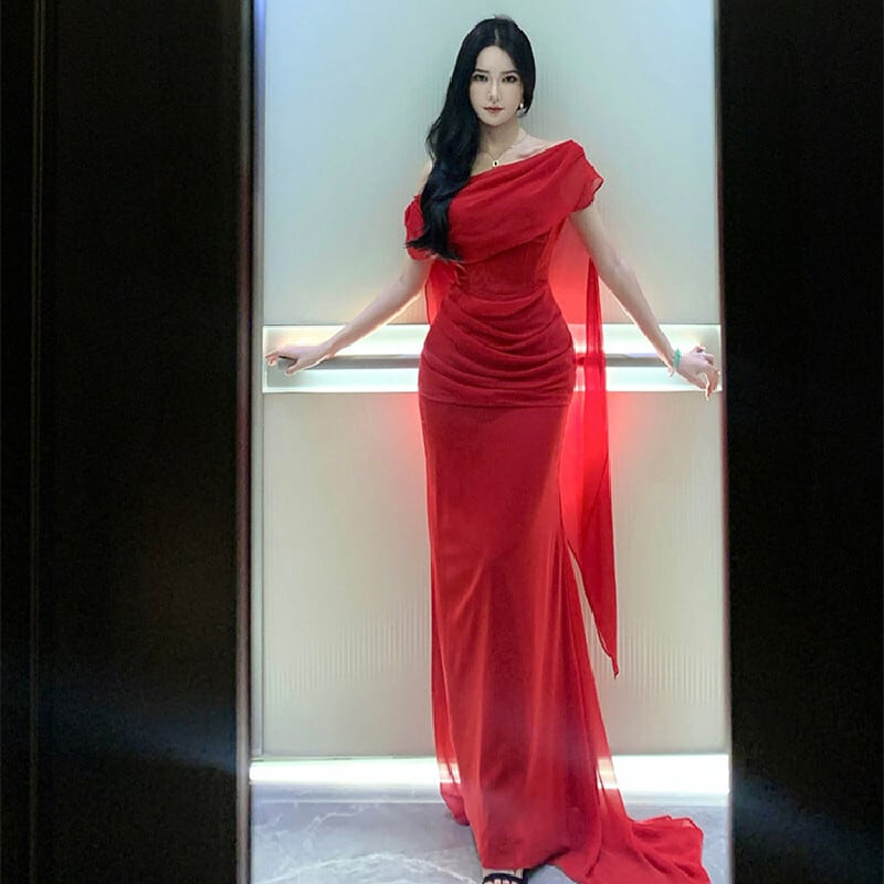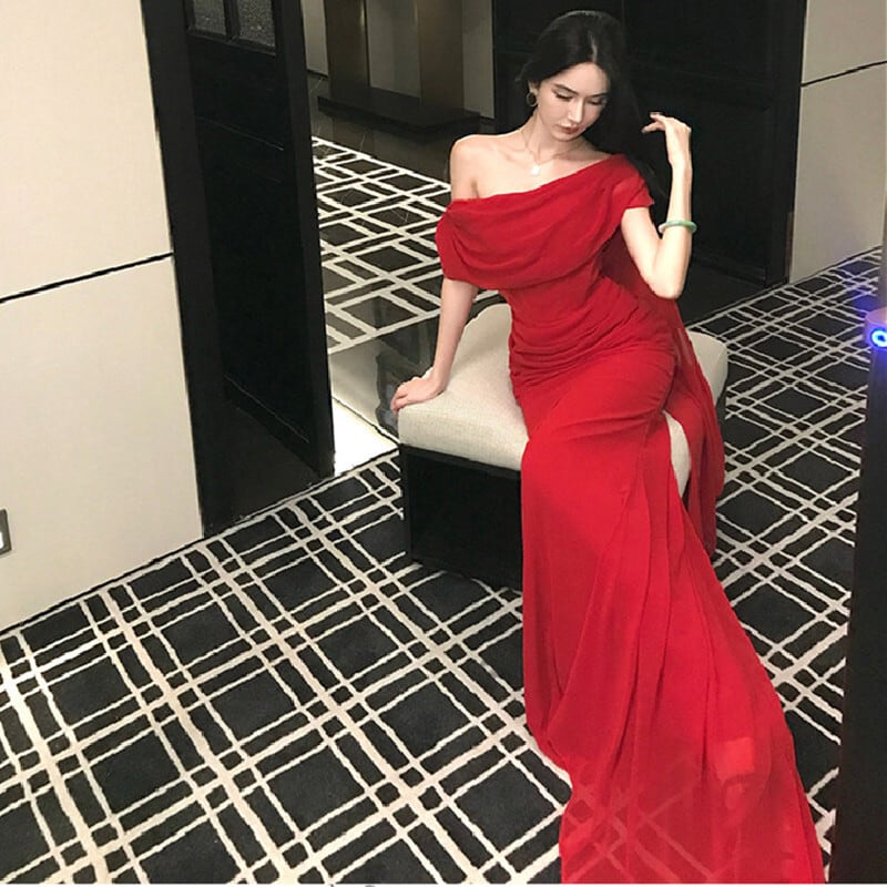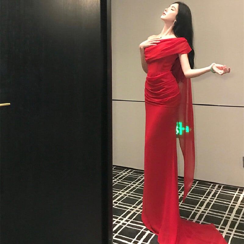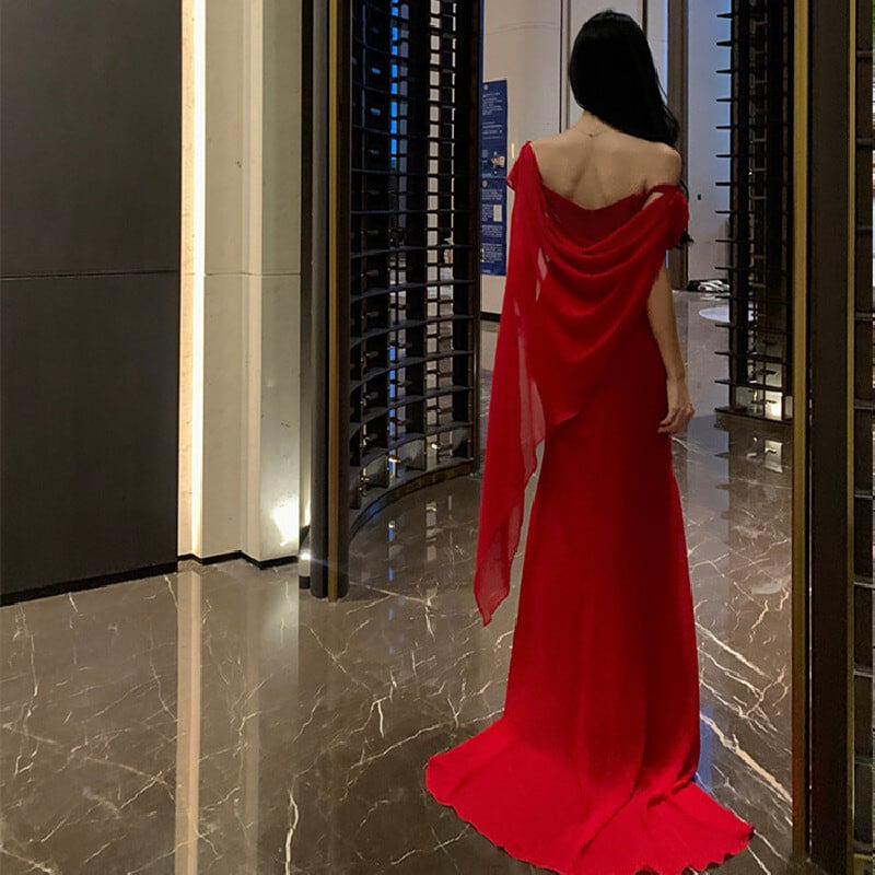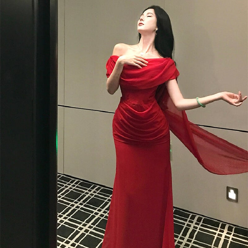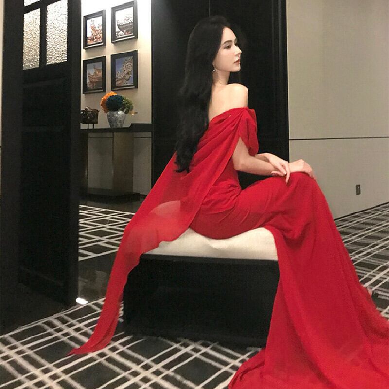 パーティードレス オフショルダー リボン 目を奪われる レッド S M L
