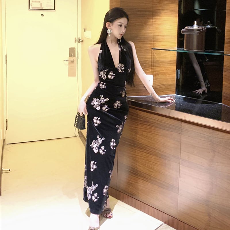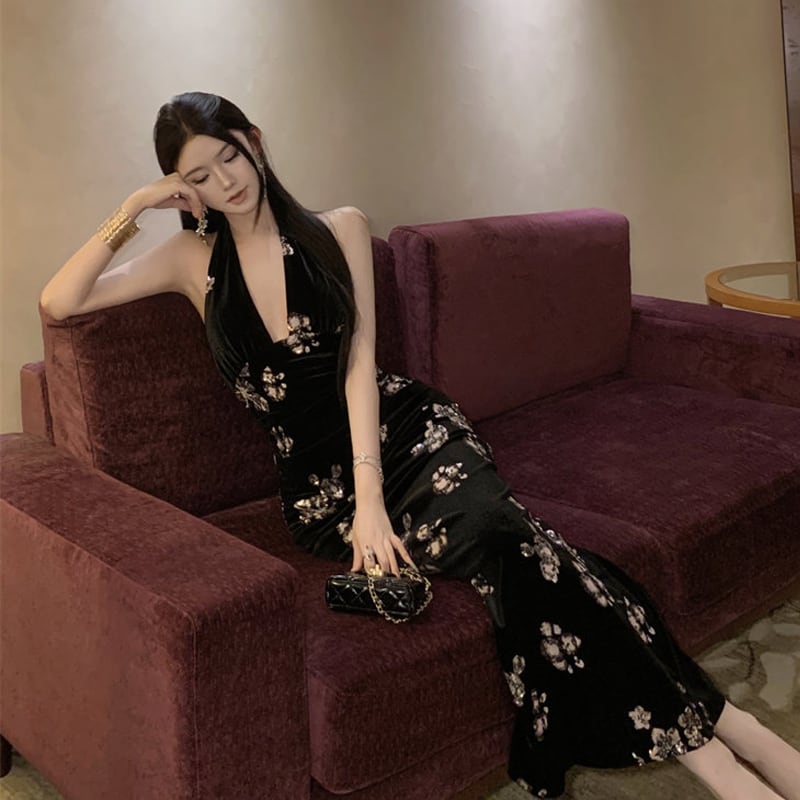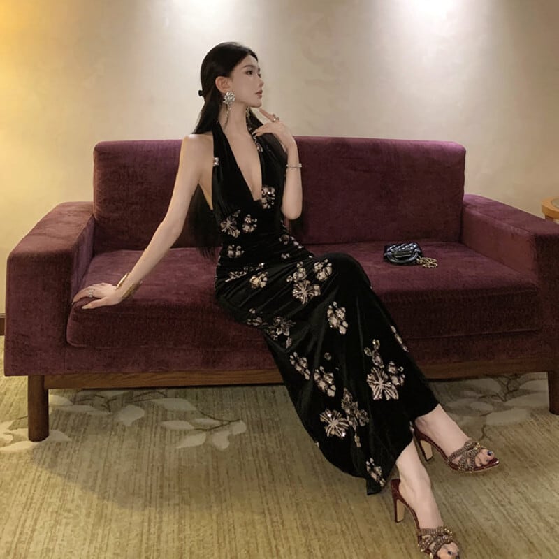 セクシードレス バックレス ベルベット 花柄 シルエット ブラック S M L