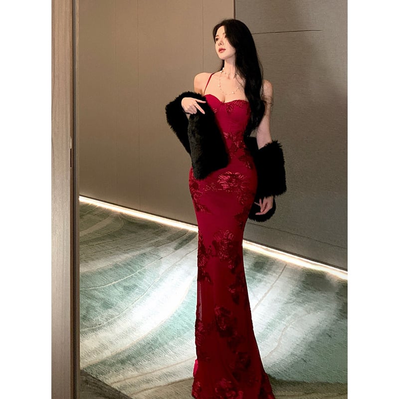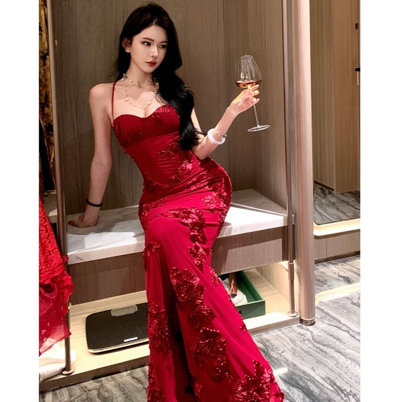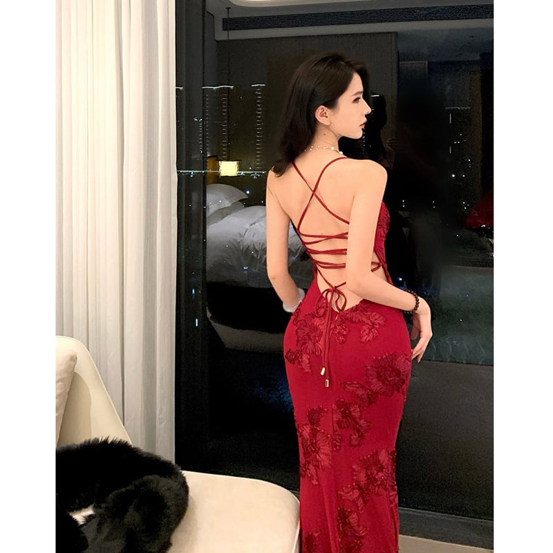 セクシードレス 刺繡 バックリボン 女っぽさが漂う シルエット レッド S M L