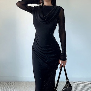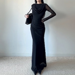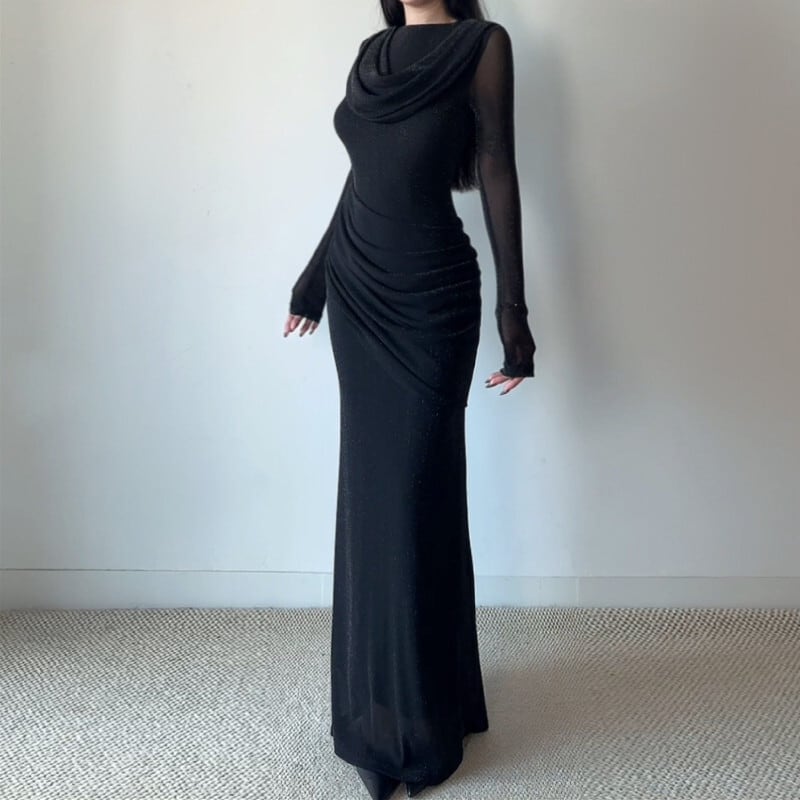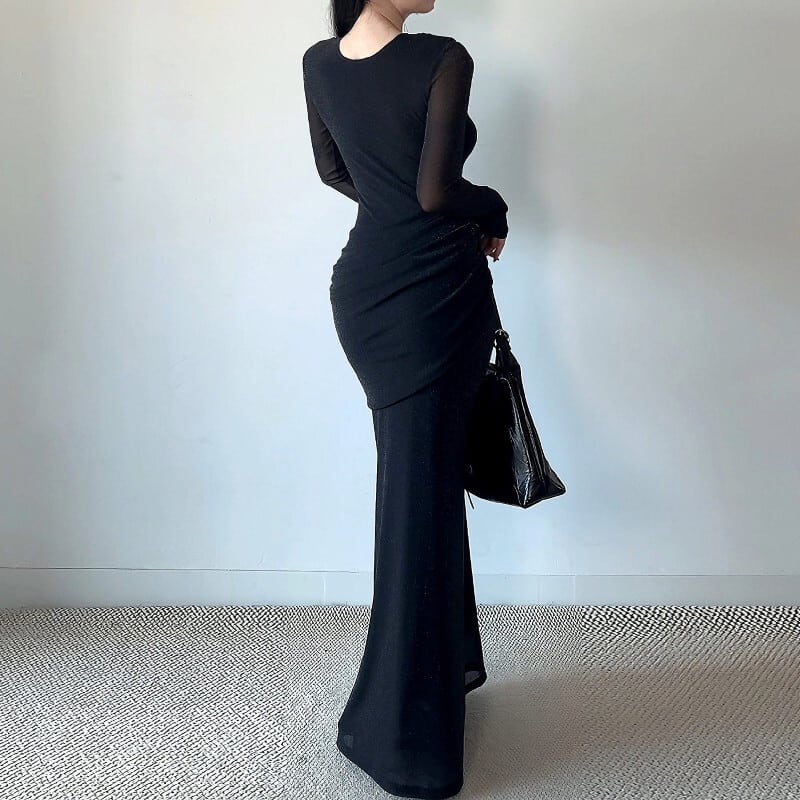 ロングワンピース チュール ネックライン ウエストシェイプ ブラック S M L XL