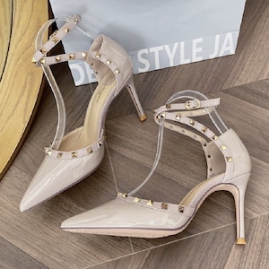シューズ パンプス 2色展開 ポインテッドトゥ クロスストラップ スタッズ付き ブラック ヌード色 8CM/10CM