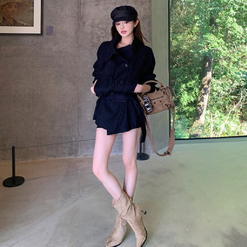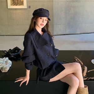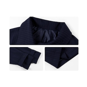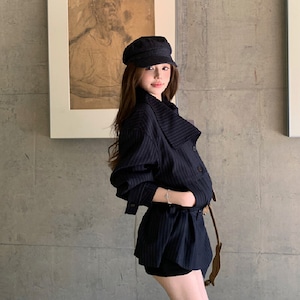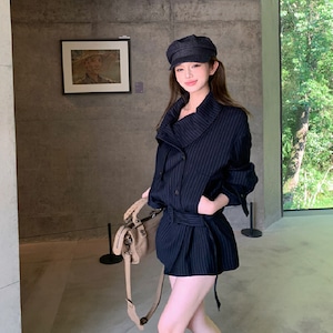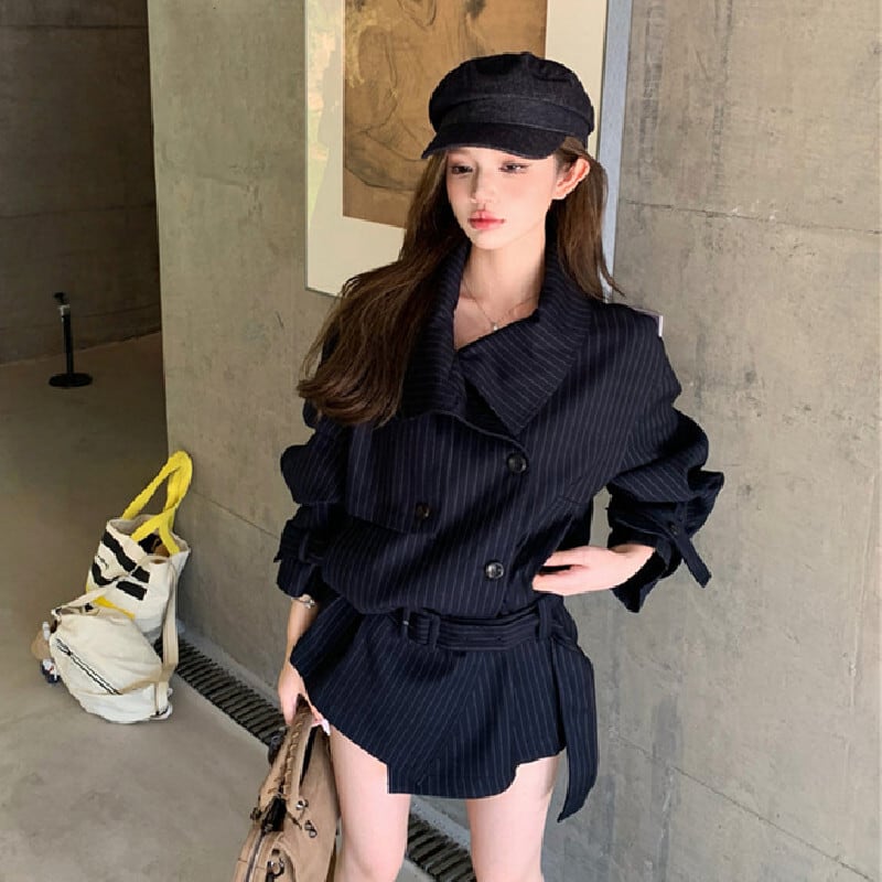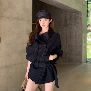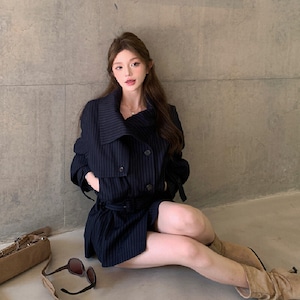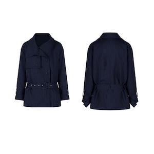 ストライプ柄 翻襟デザイン ショートトレンチコート 大人カジュアル ダークブルー S M L