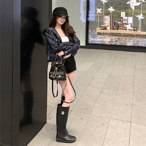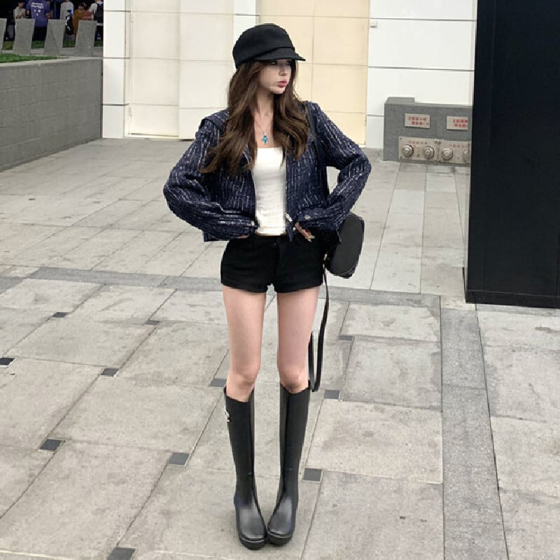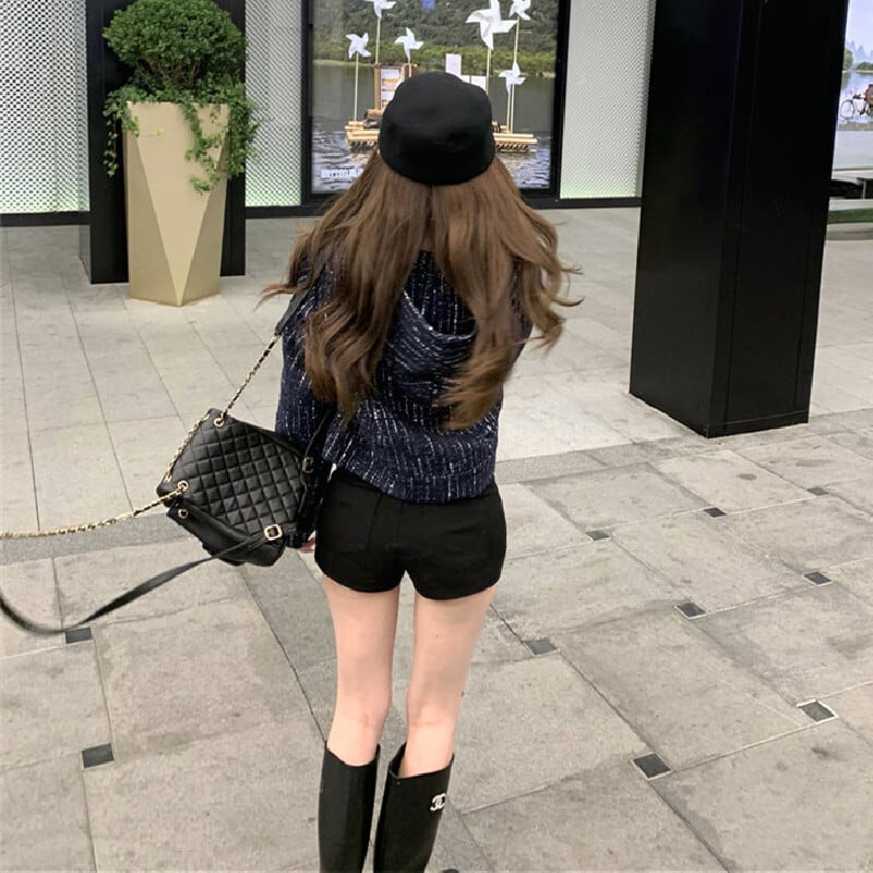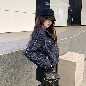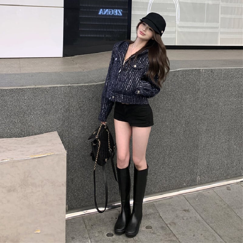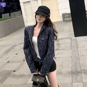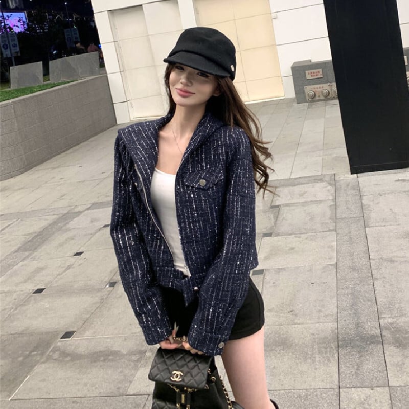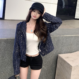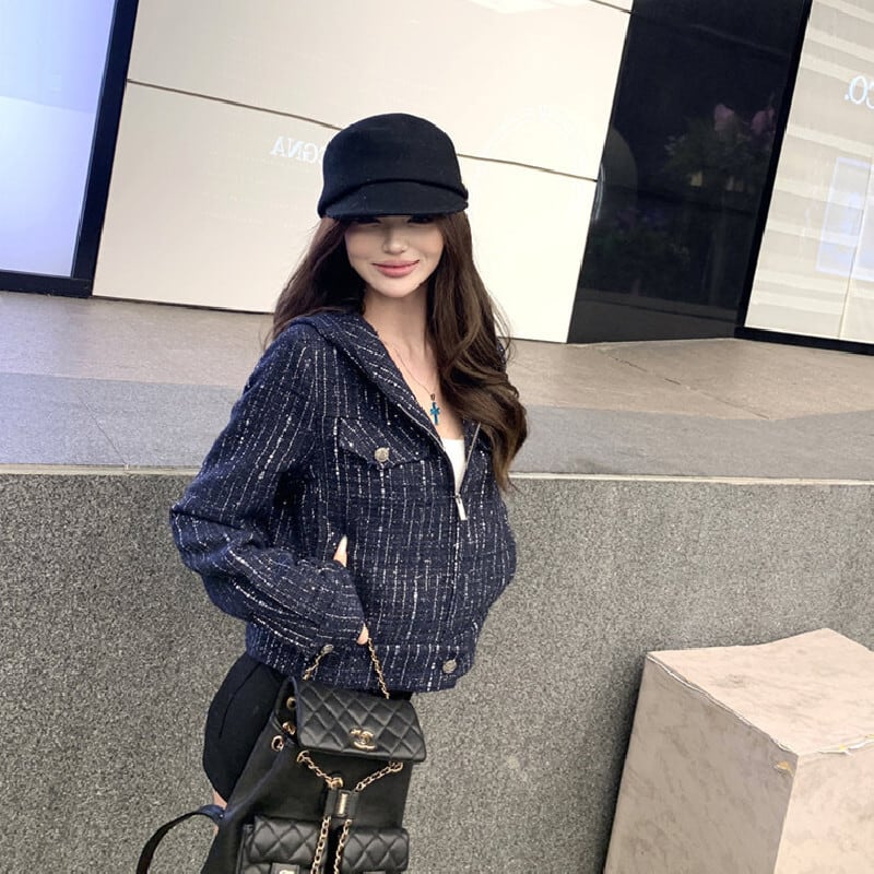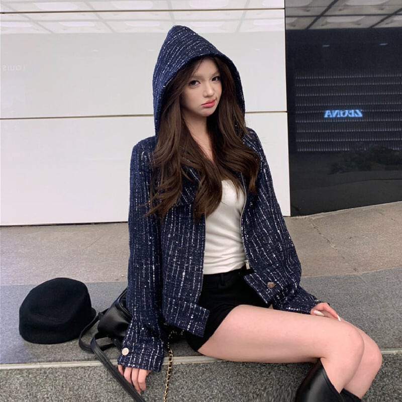 ツイード ショート丈 フード付き 長袖 ジップアップ ジャケット ダークブルー S M L