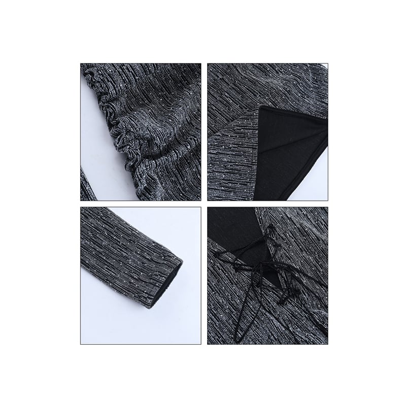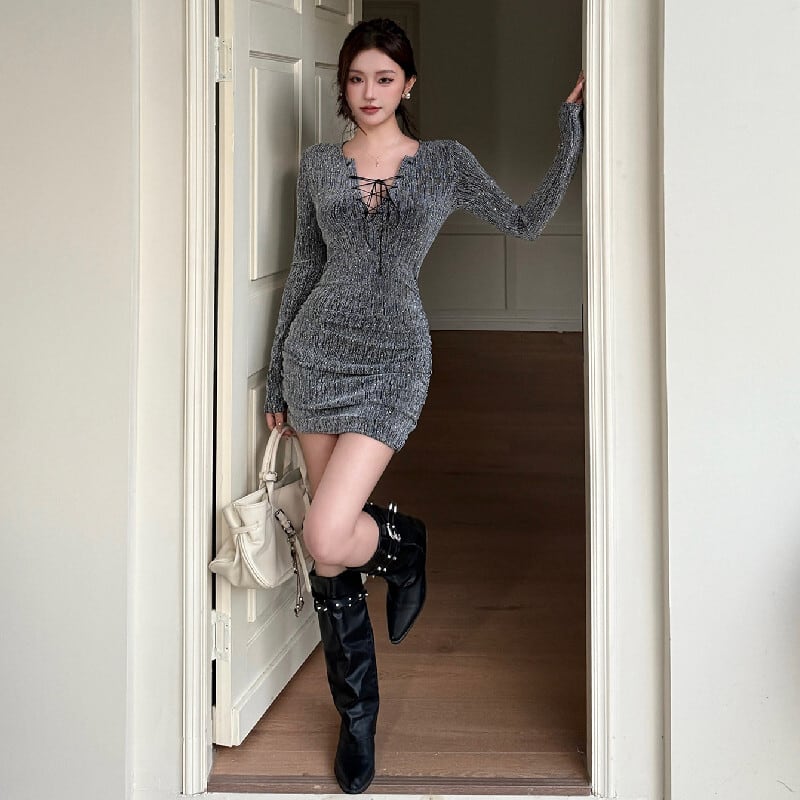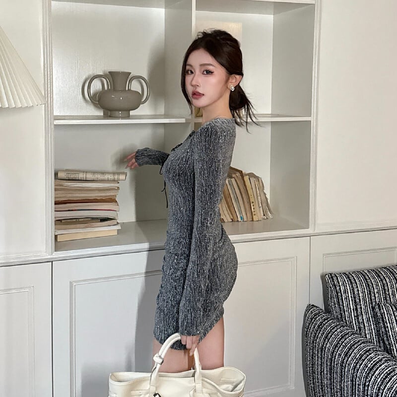 ワンピース リボンタイデザイン ボディコン セクシー 長袖 シルバー色 S M L