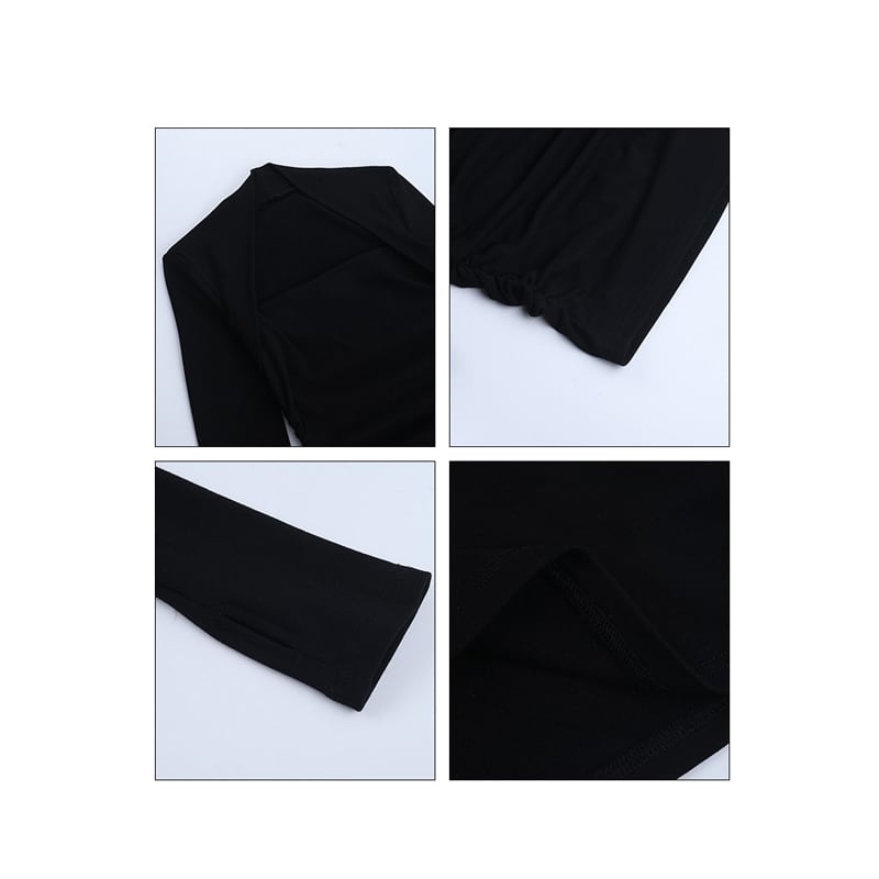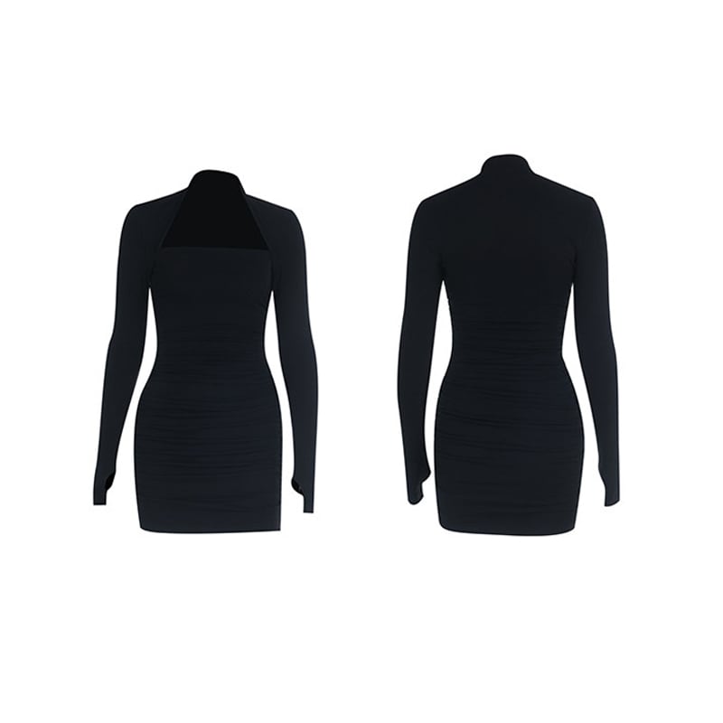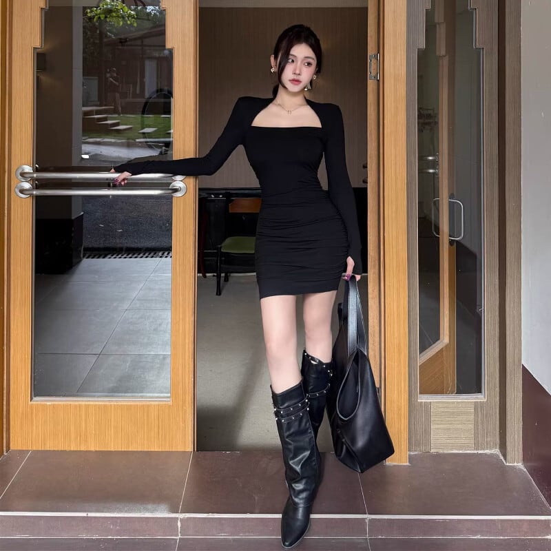 ワンピース セクシー スクエアネック ボディコン 長袖 膝上 ブラック S M L