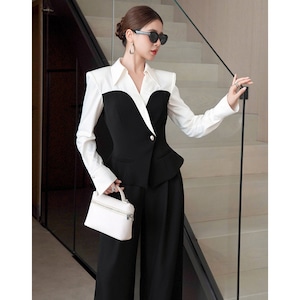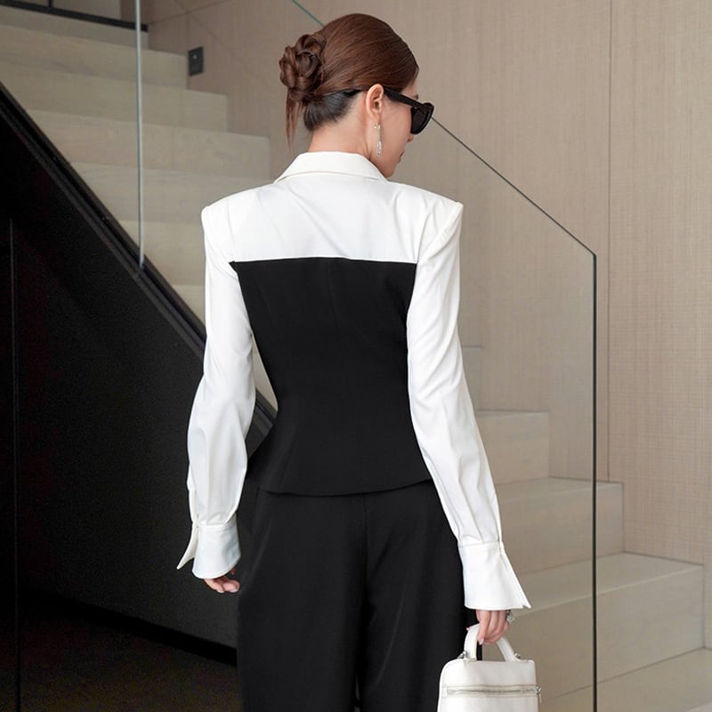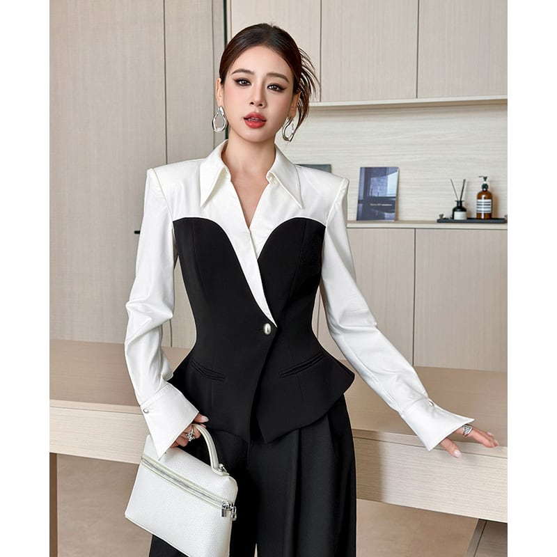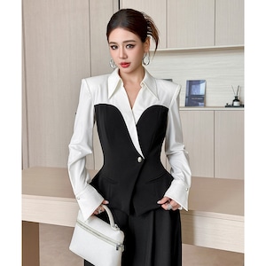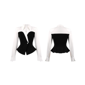 【夕暮薔薇シリーズ】トップス シャツ デザイン感 配色 フィットウエスト ブラック+ホワイト