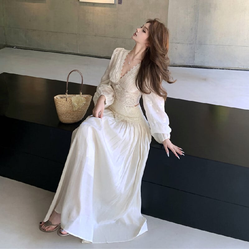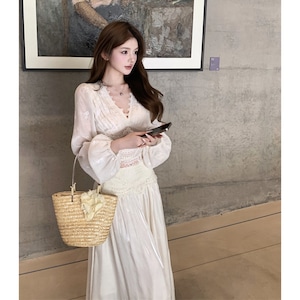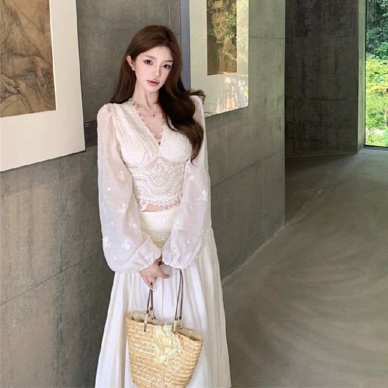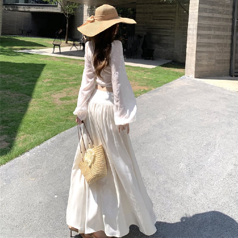 2点セット Vネック 刺繡 トップス + ハイウエスト スカート 爽やか S M L