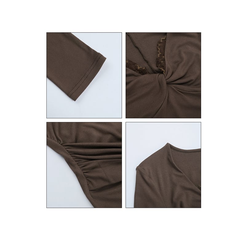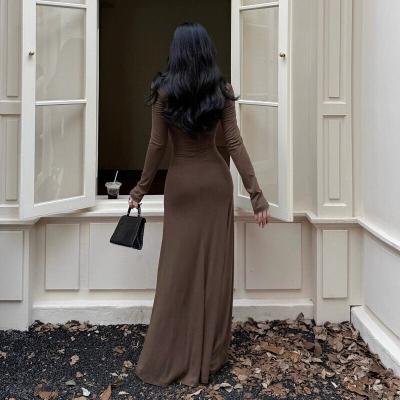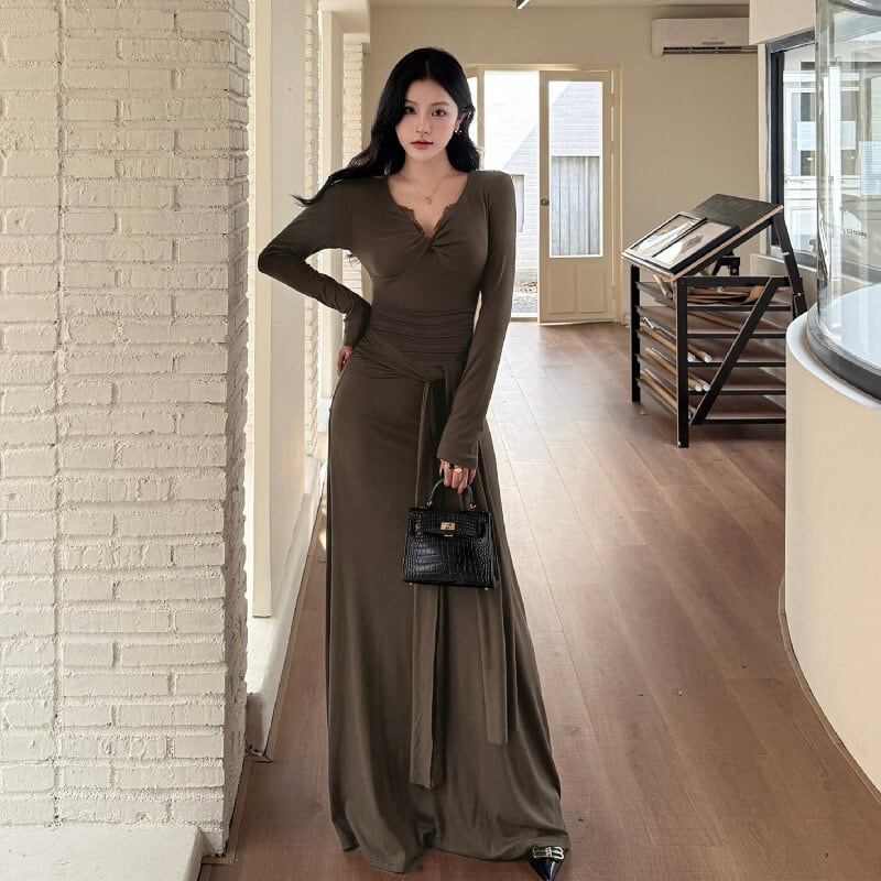 ロングワンピース 長袖 ウエストストラップ 無地 フィットウエスト ブラウン S M L
