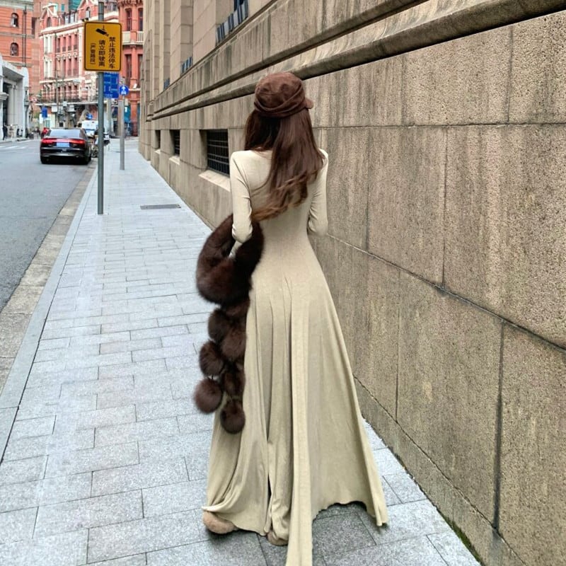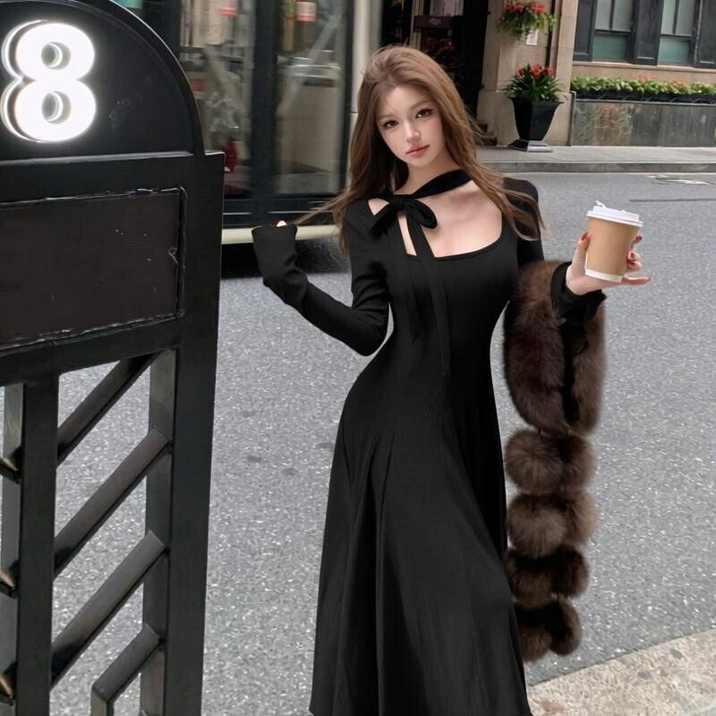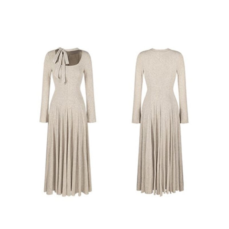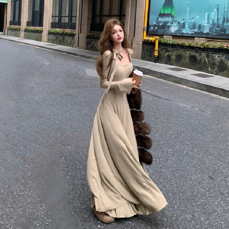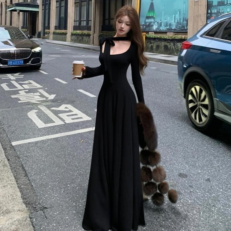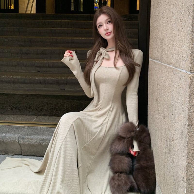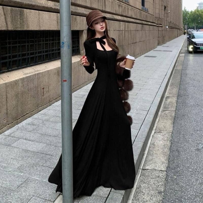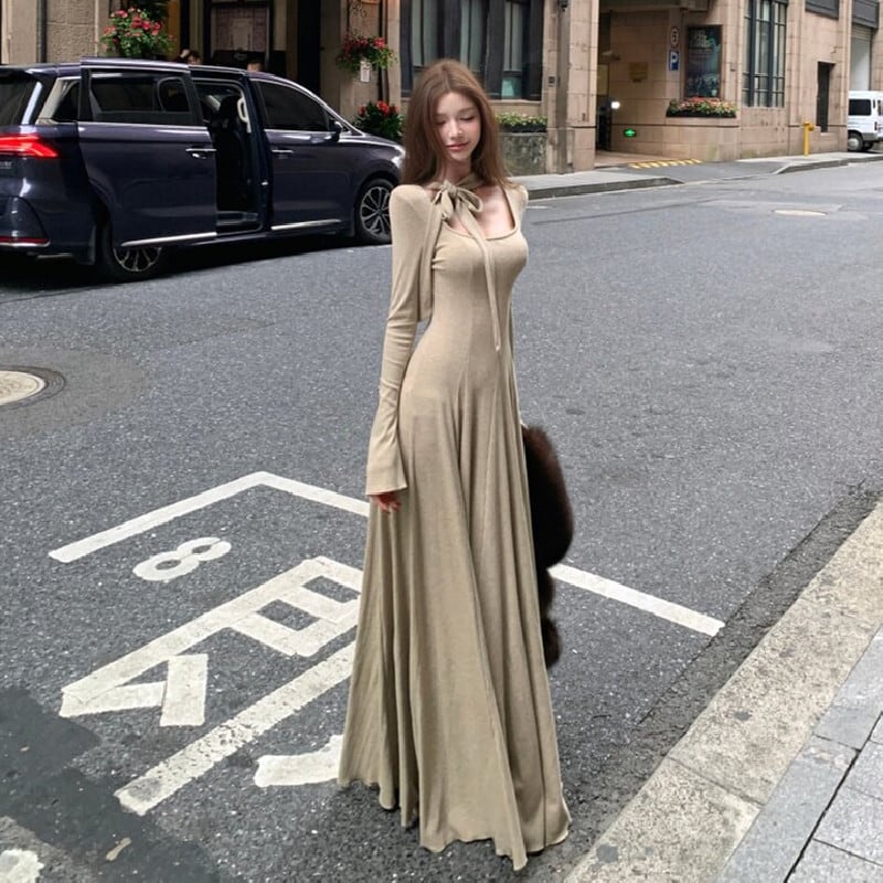 2colors ロングワンピース リボン シンプル ダークベージュ ブラック S M L