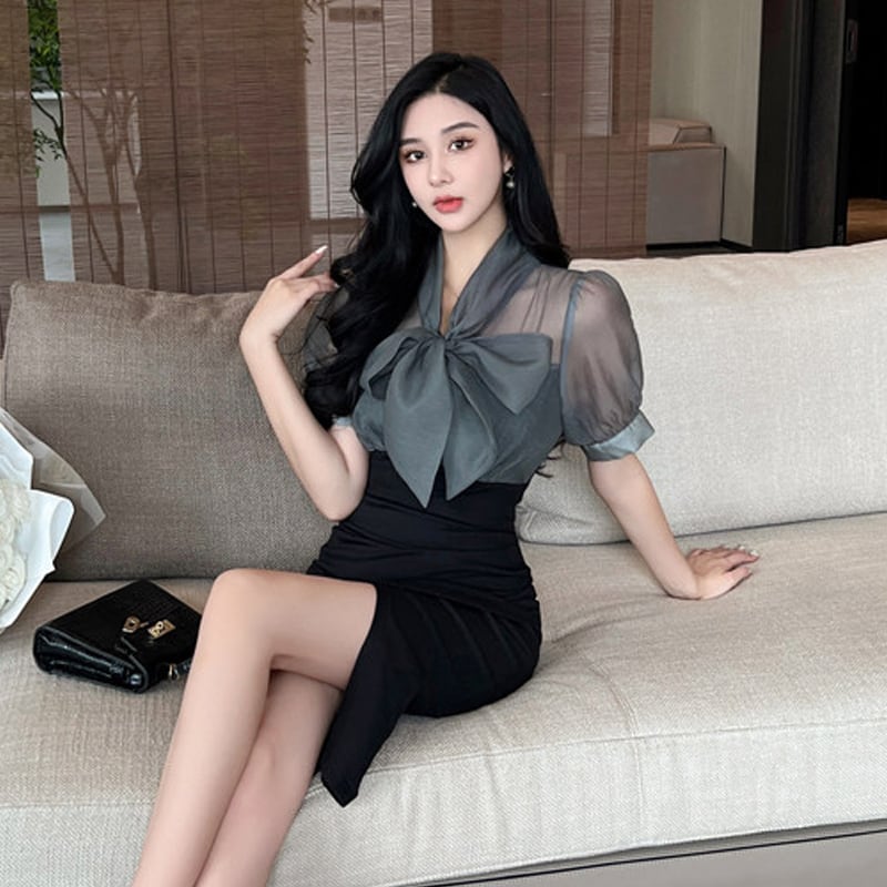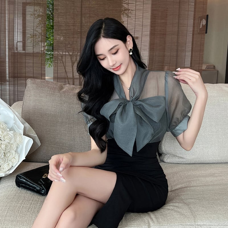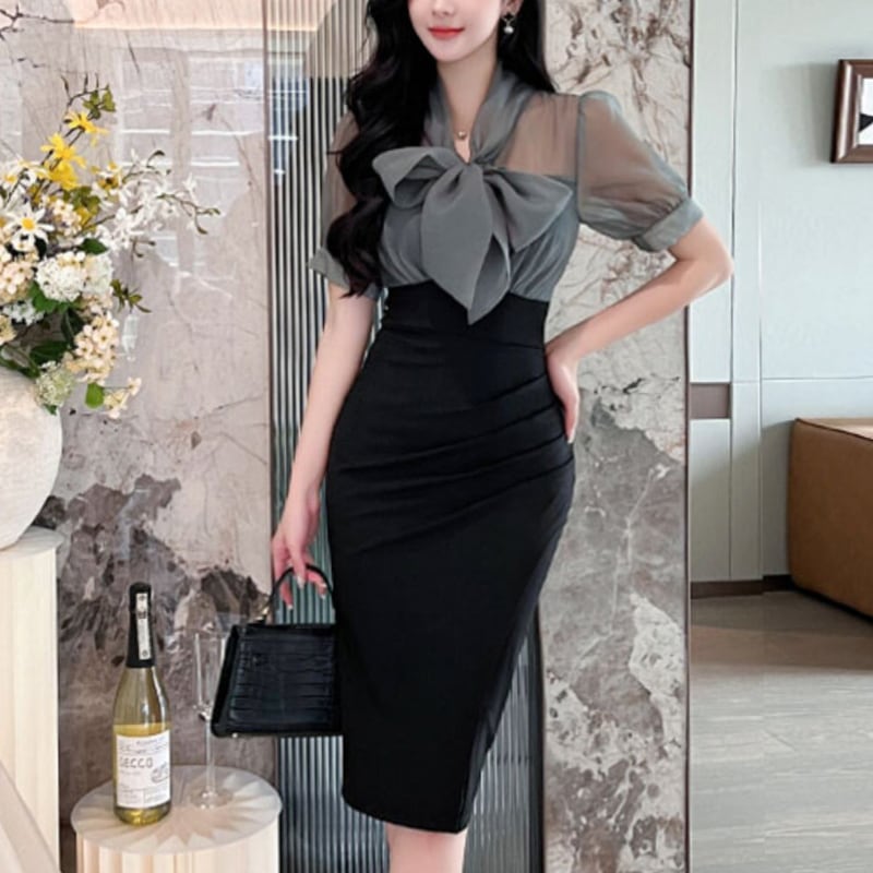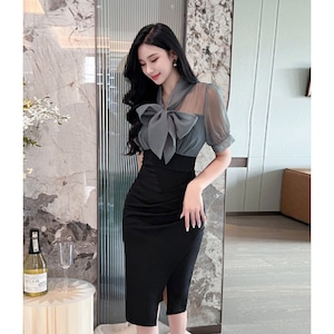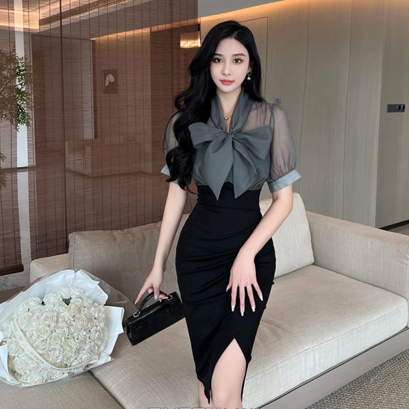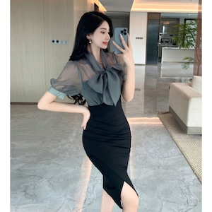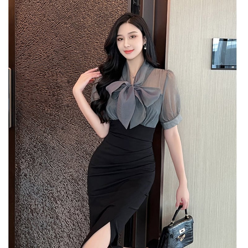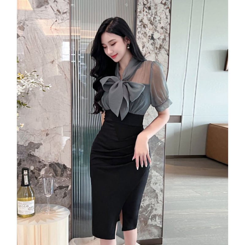 【QUEENシリーズ】ワンピース リボン フィットウエスト スリット ブラック+グレー S M L