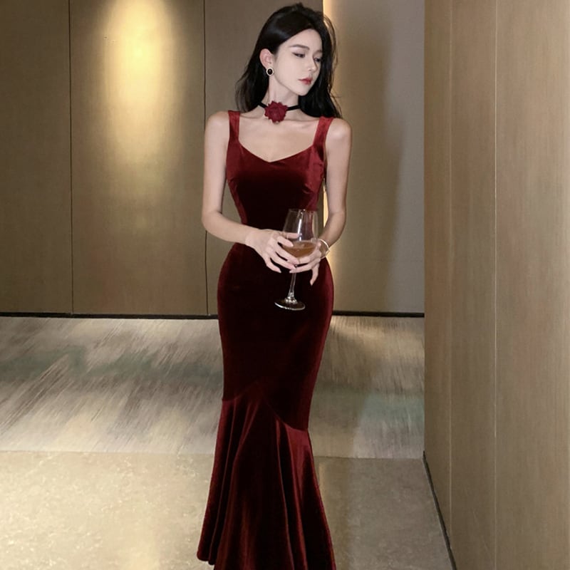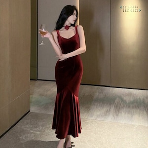ワンピース ベルベット フィッシュテール 美人度アップ ワインレッド S M L