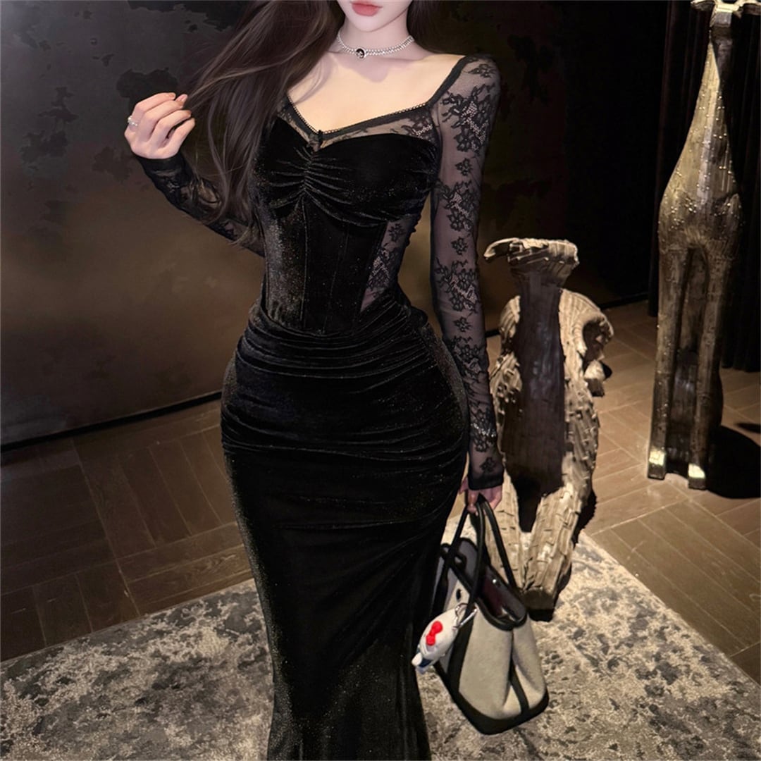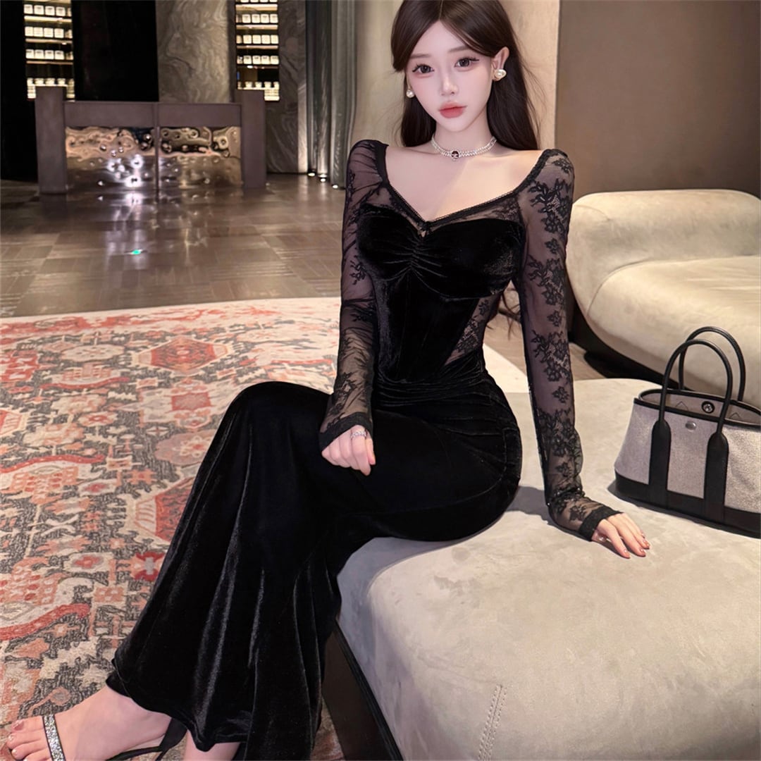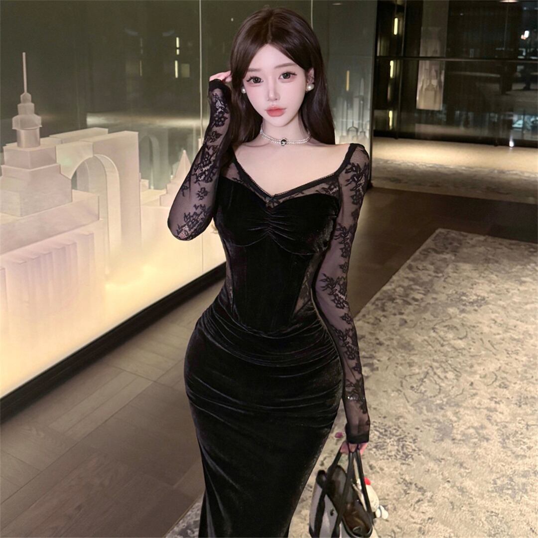 ワンピース ファッション 切り替え レース セクシー ブラック S M L