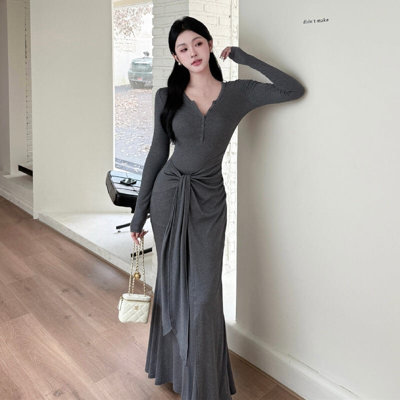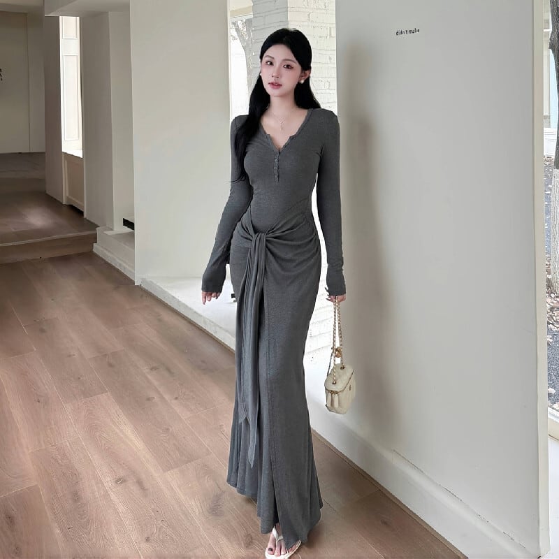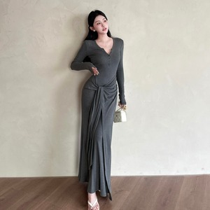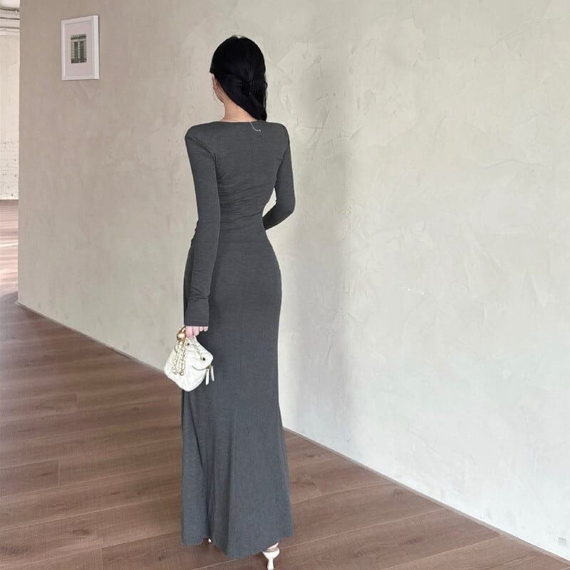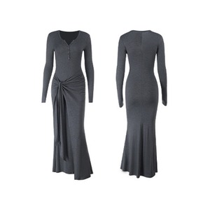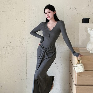 ロングワンピース シンプル 長袖 気質溢れる ダークグレー S M L