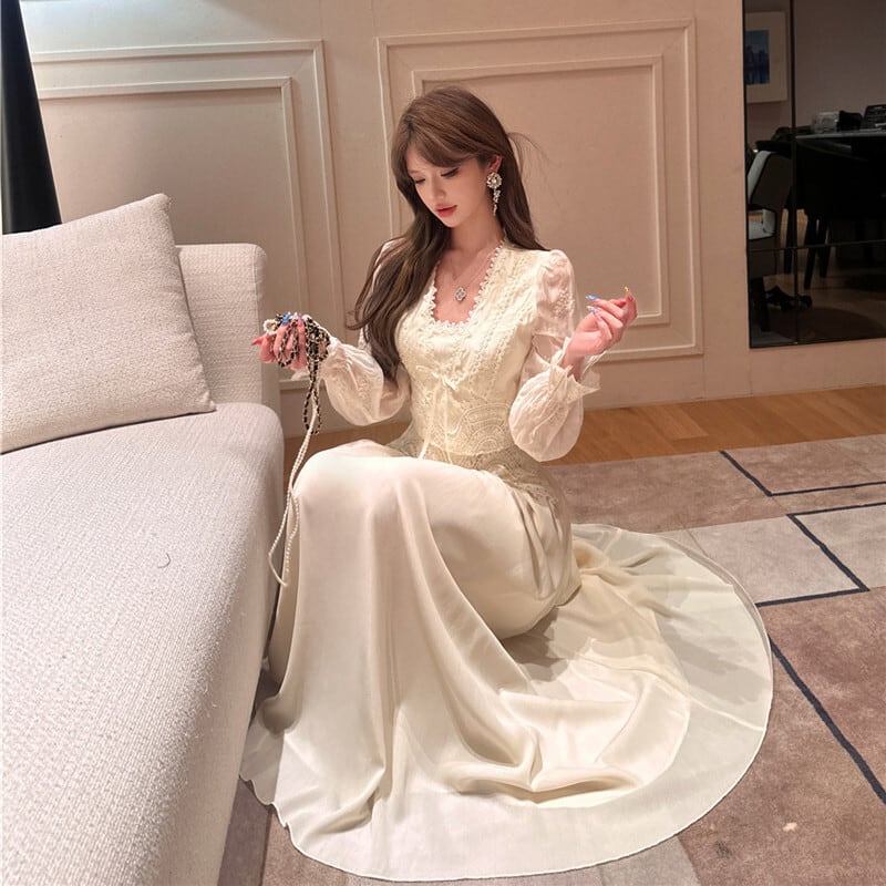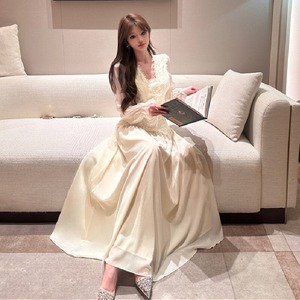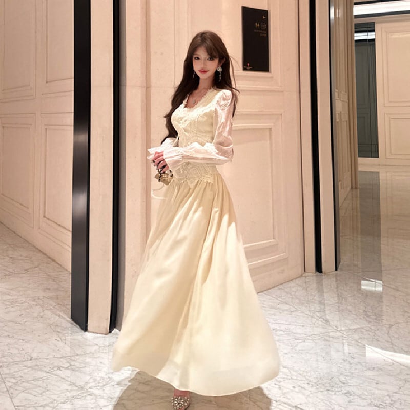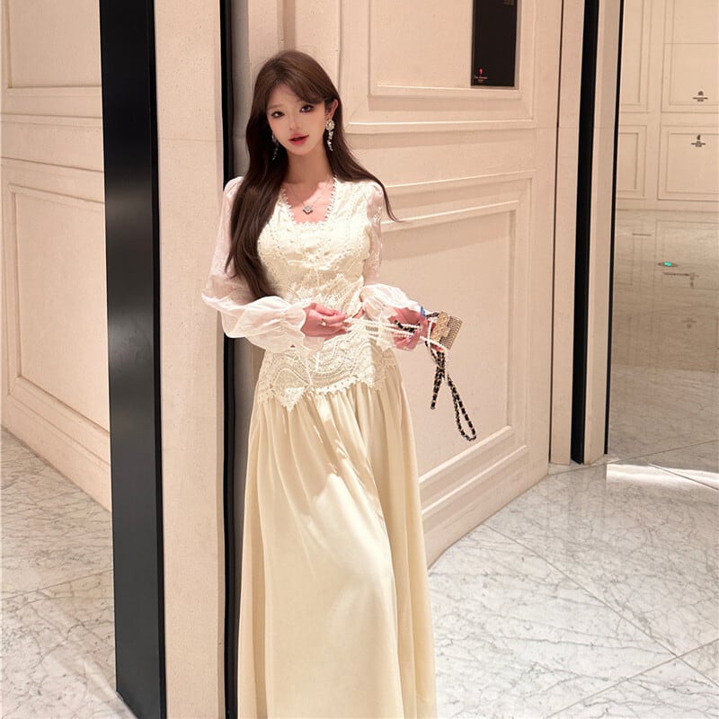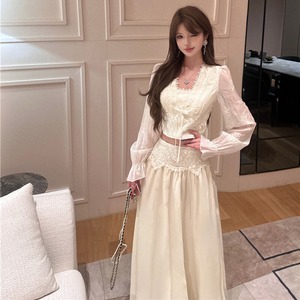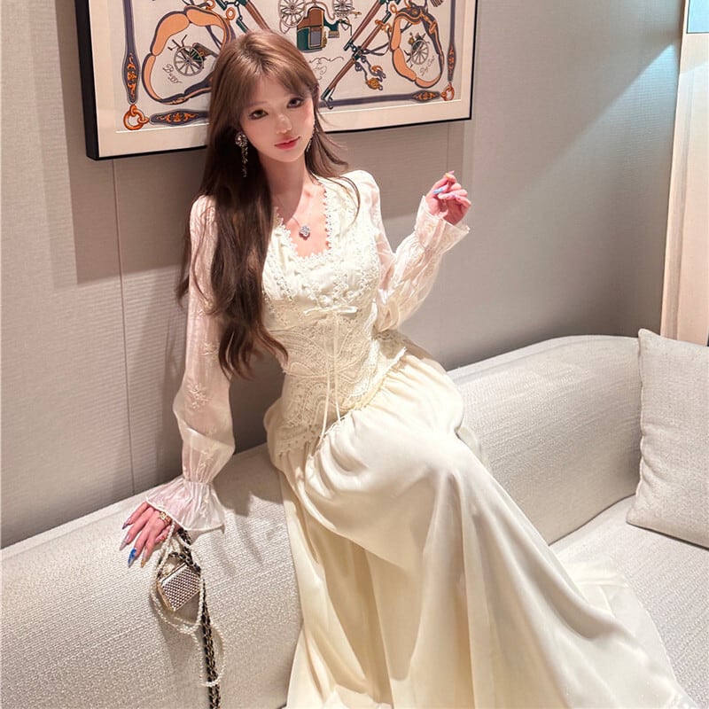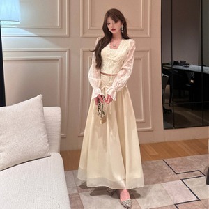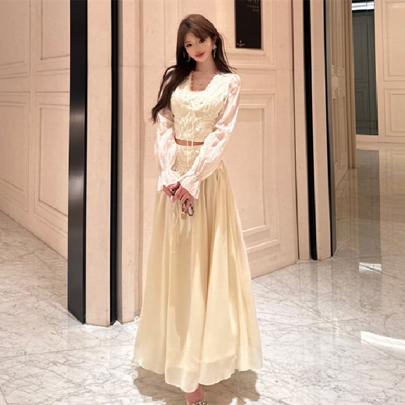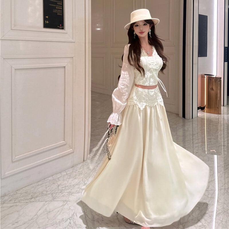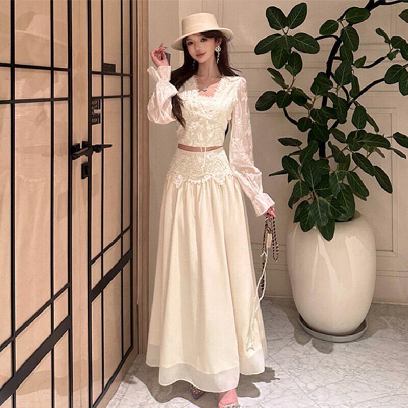 セットアップ 刺繡 レース トップス+ハイウエスト スカート ベージュ S M L