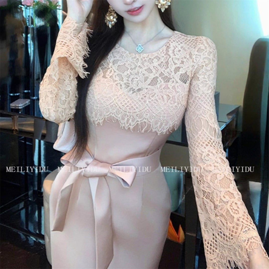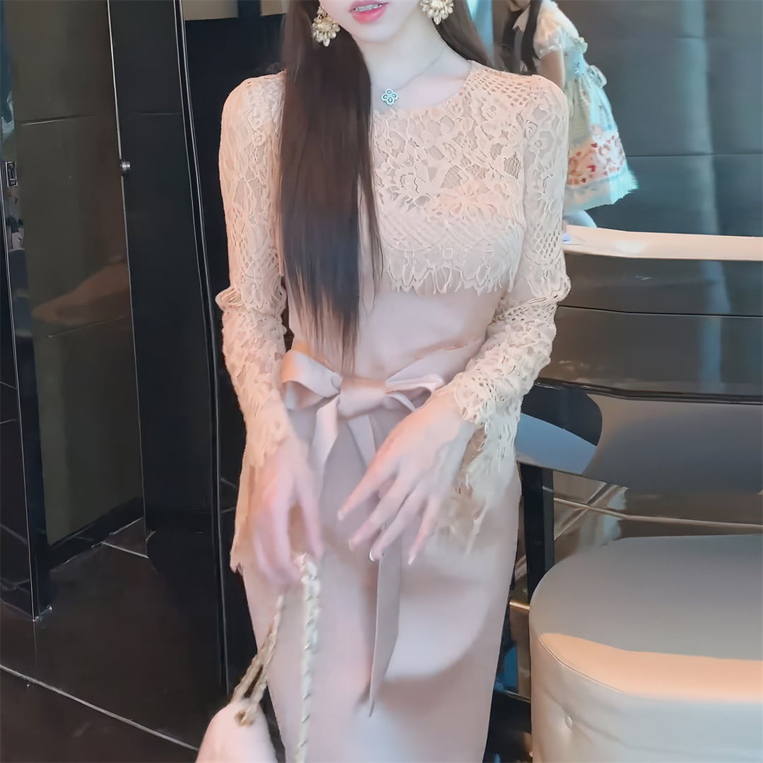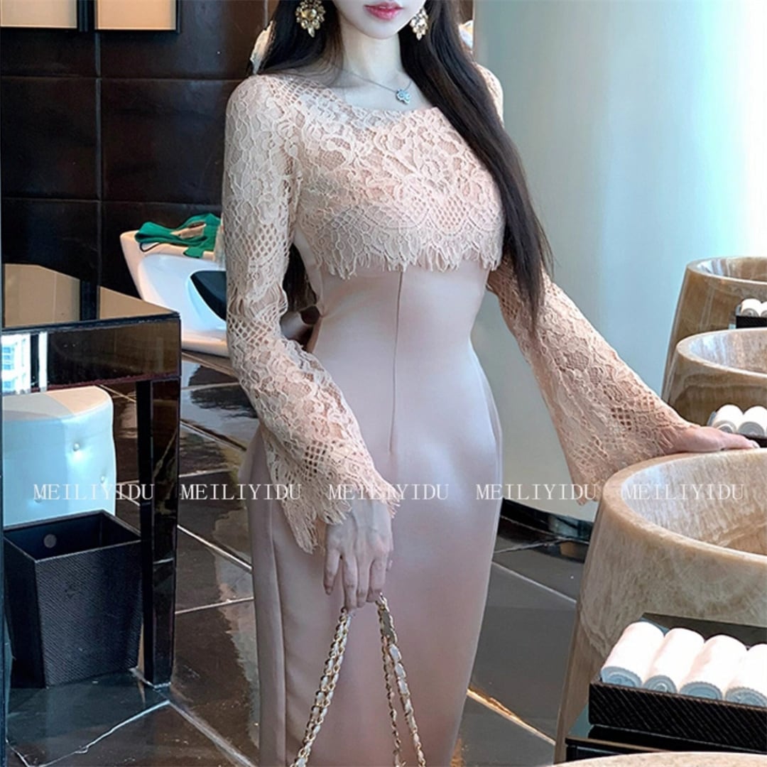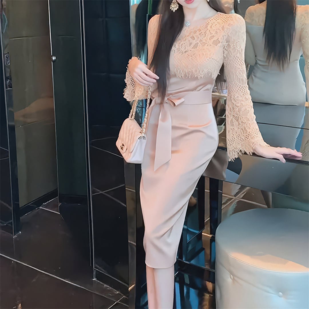 ワンピース 優雅 細見え 切り替え レース 曲線美 ピンク S M L XL