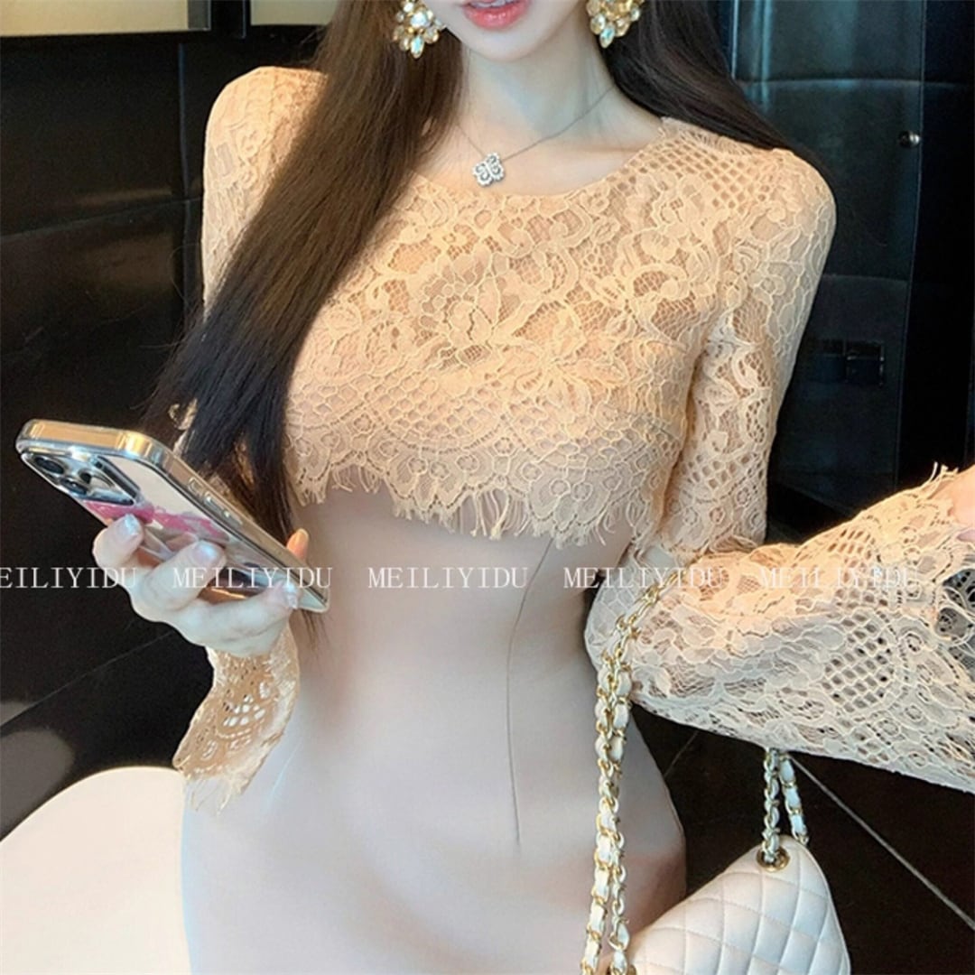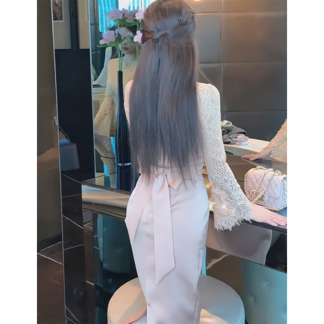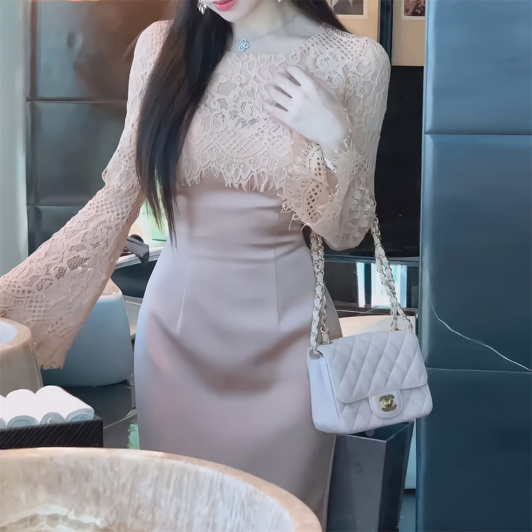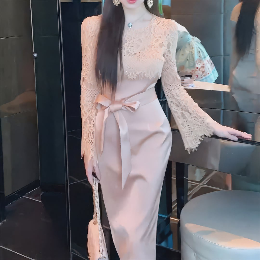 ワンピース 優雅 細見え 切り替え レース 曲線美 ピンク S M L XL
