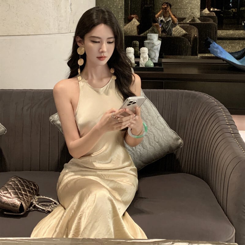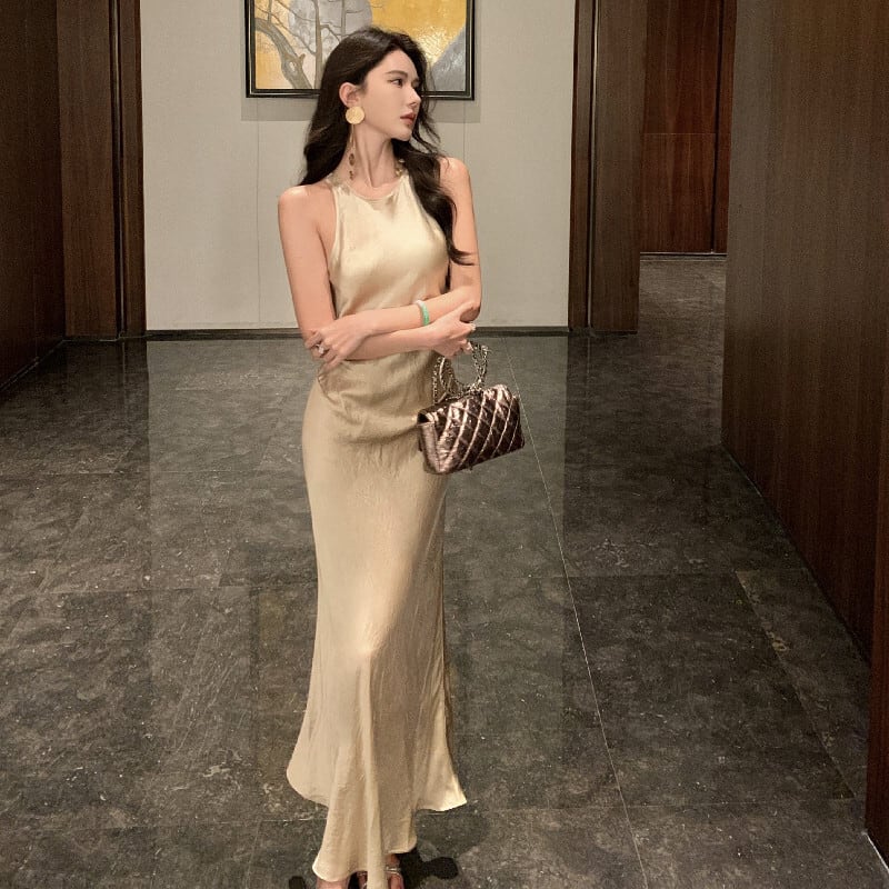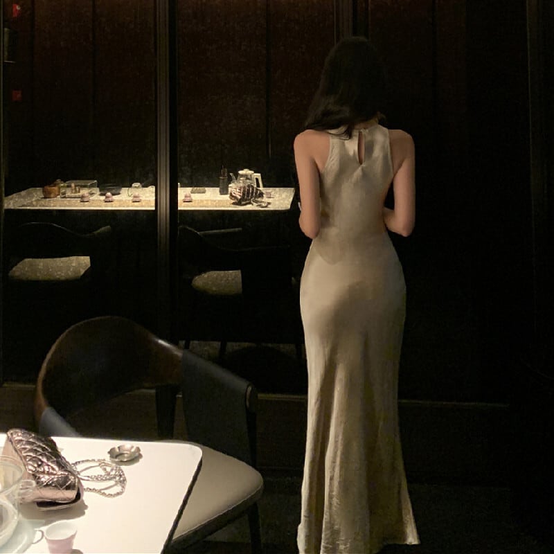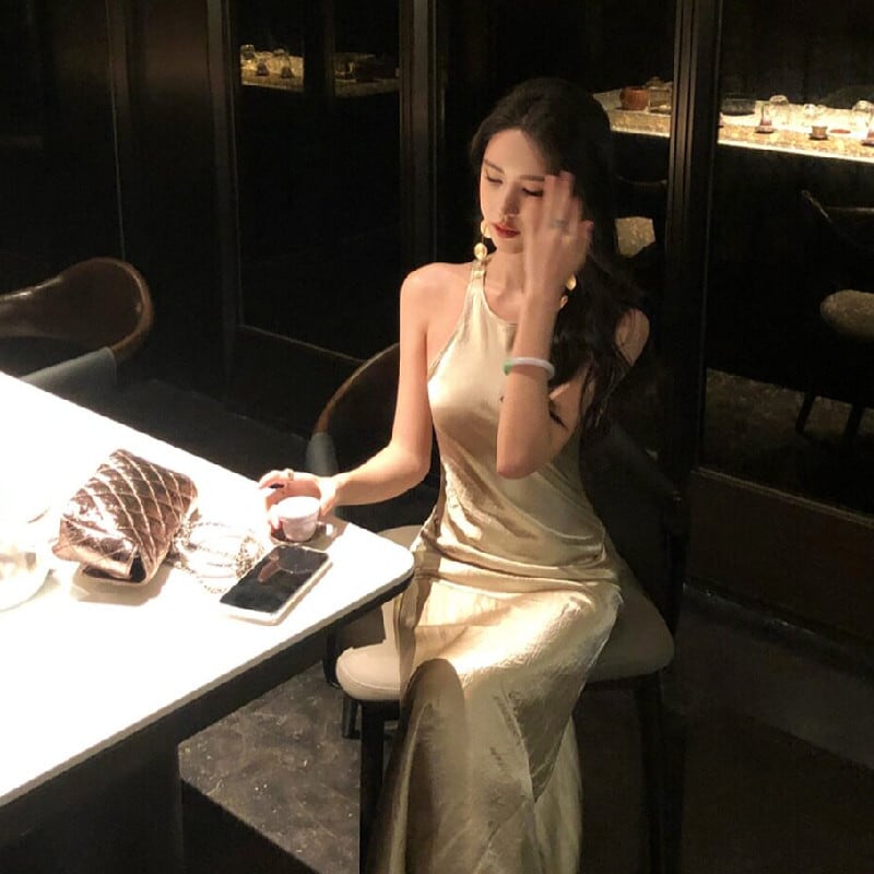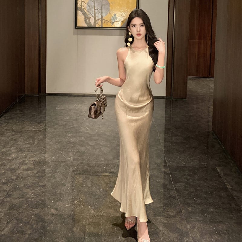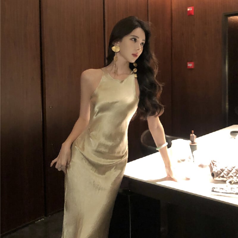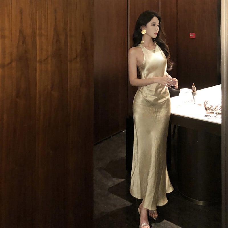 ワンピース ノースリーブ 美人度アップ パーティー シャンパン色 S M L