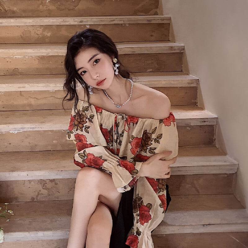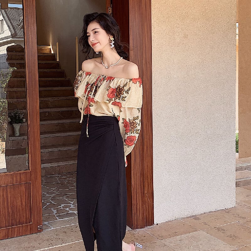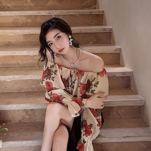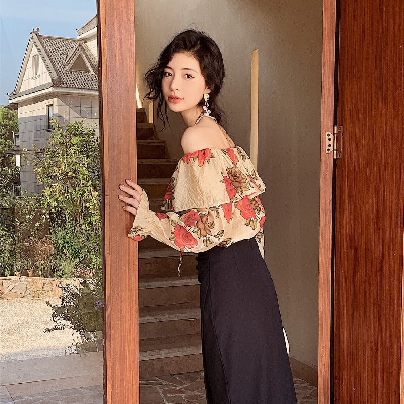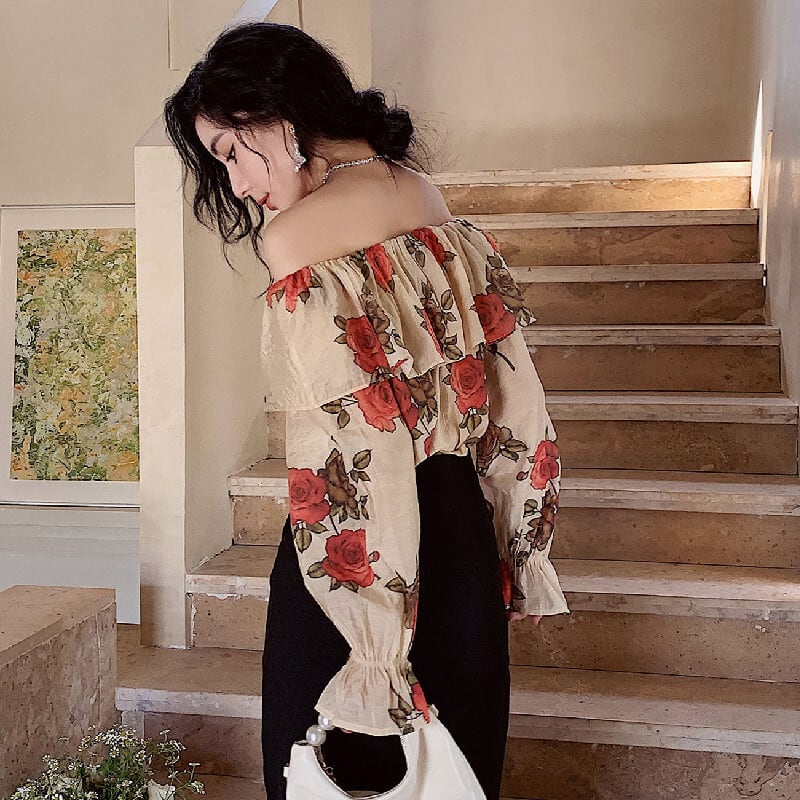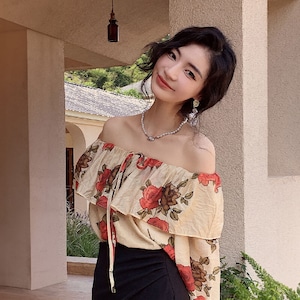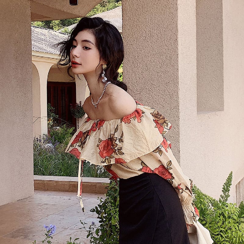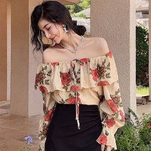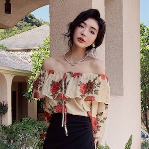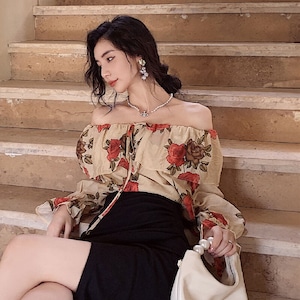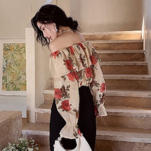 トップス ブラウス オフショルダー 花柄 レトロ 視線集中 S M L