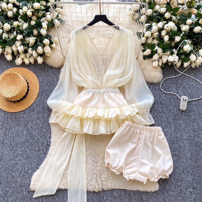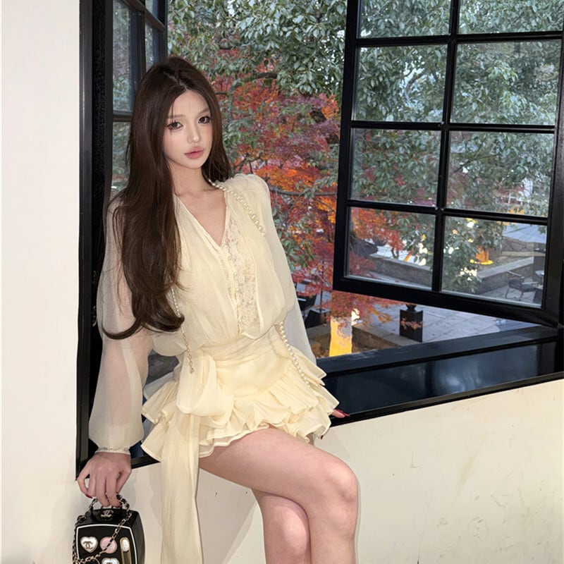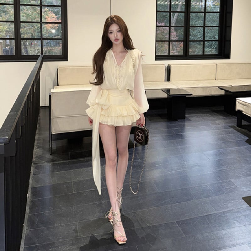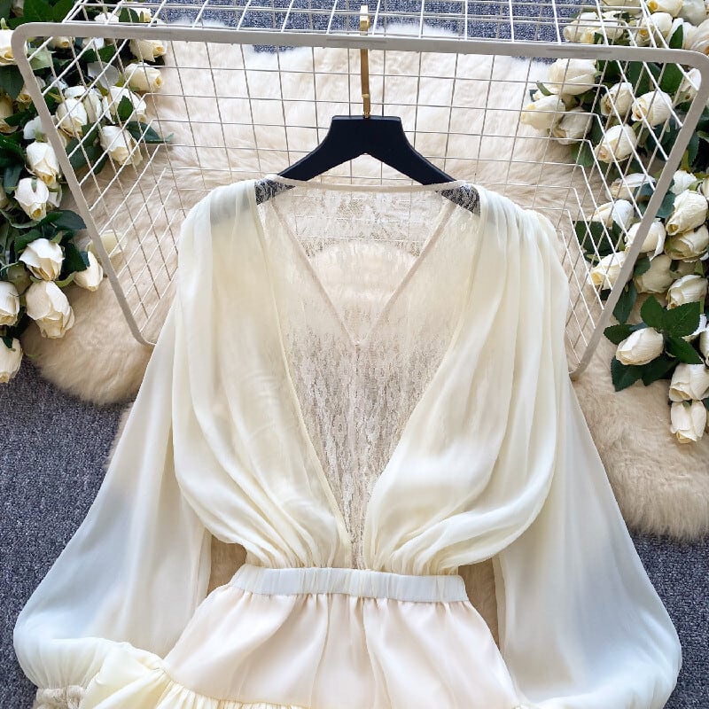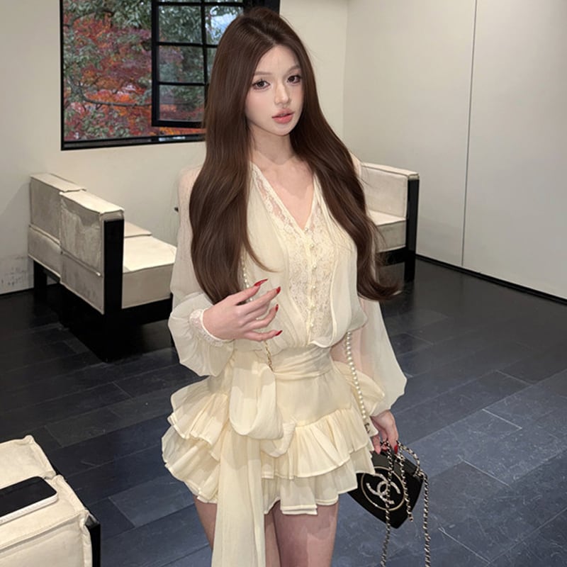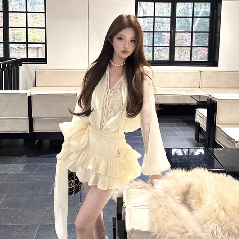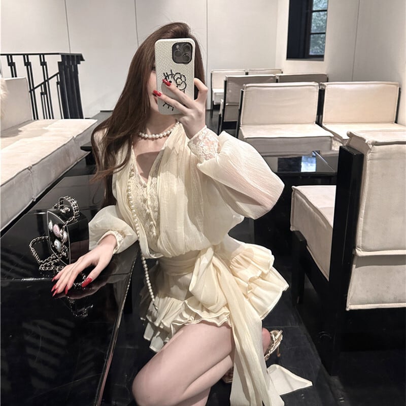 レース リボン スウィート ティアードワンピース デザイン感 ベージュ