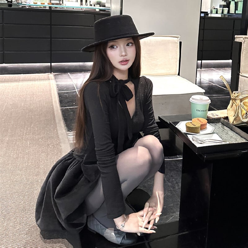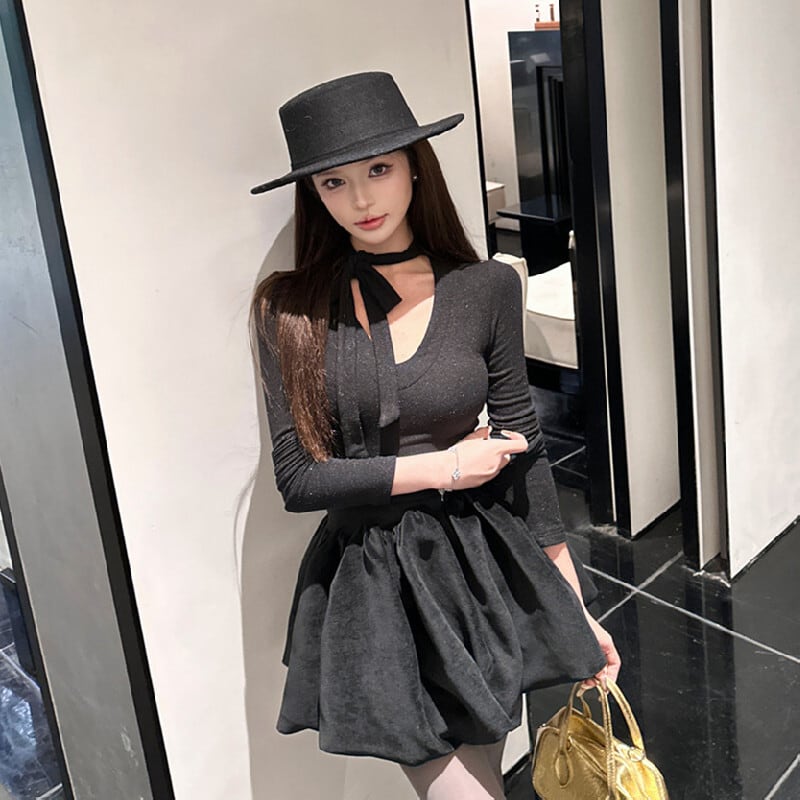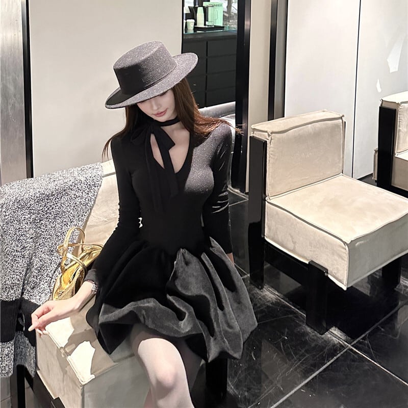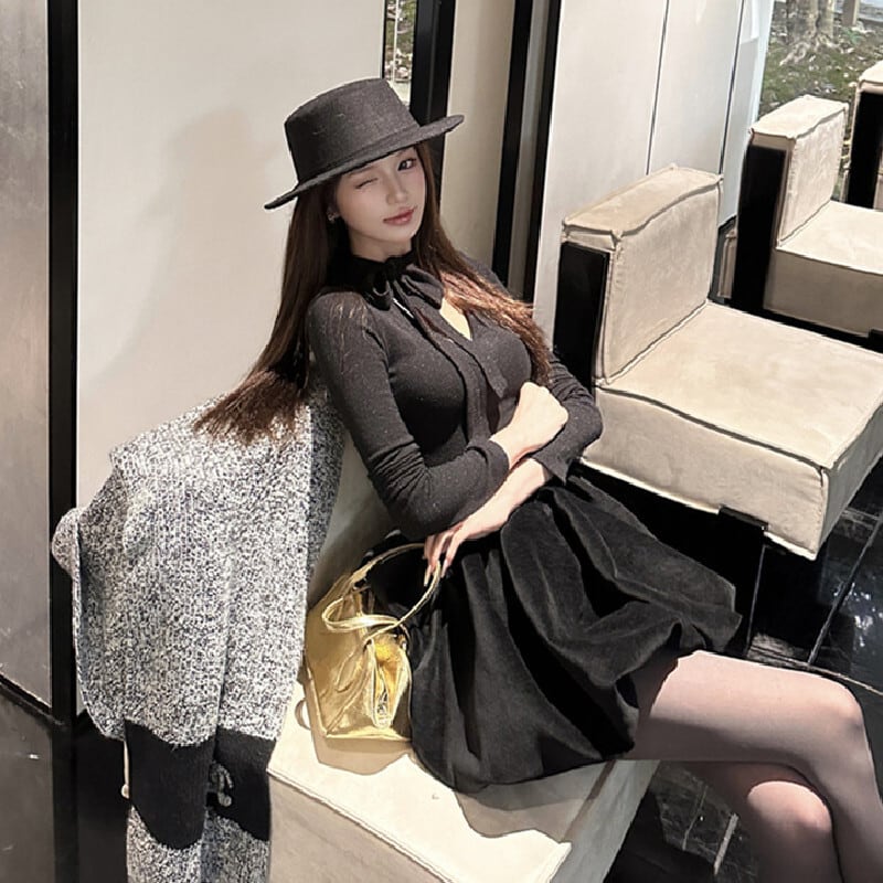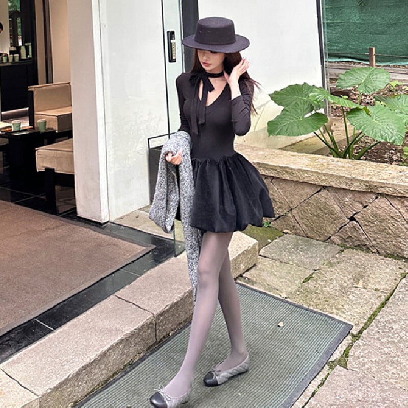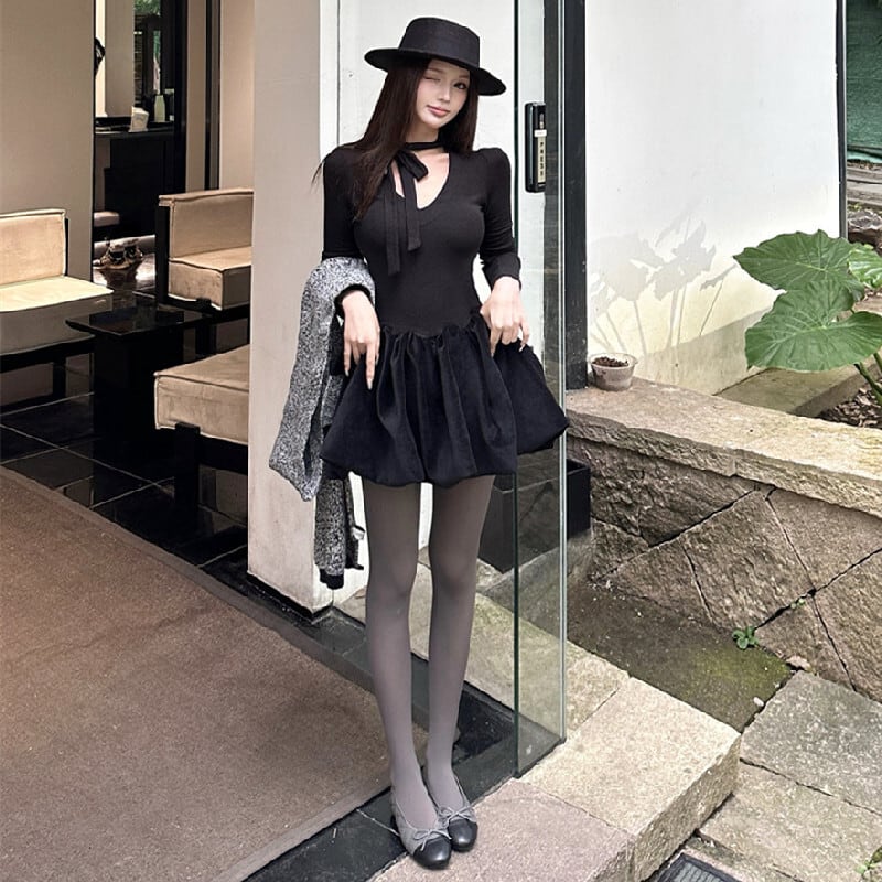 ニット ウエストシェイプ ブラック バルーンミニワンピース S M L