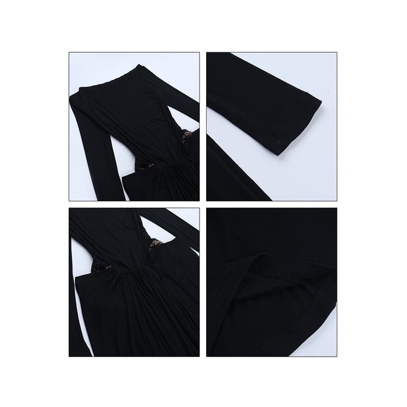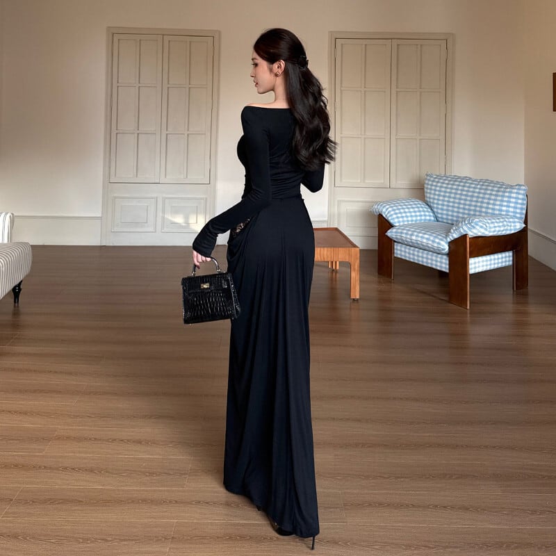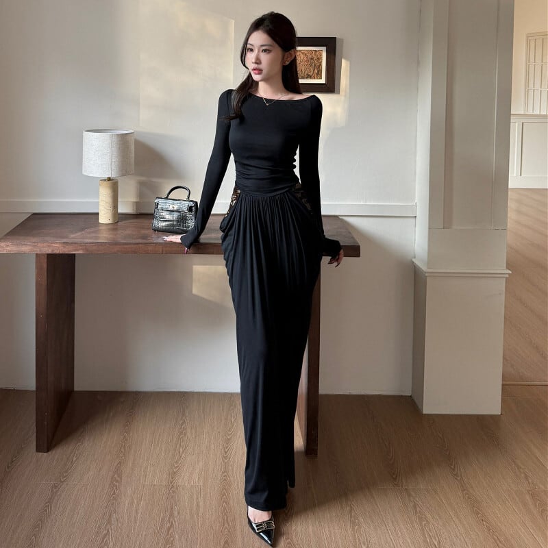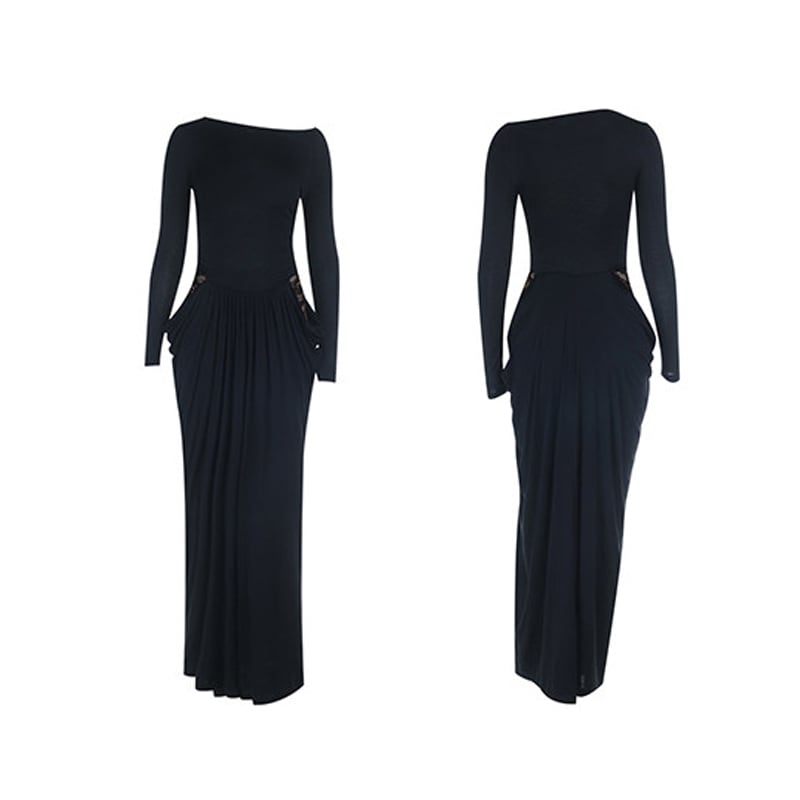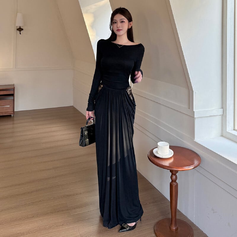 ロングワンピース レース フィットウエスト 長袖 ブラック S M L