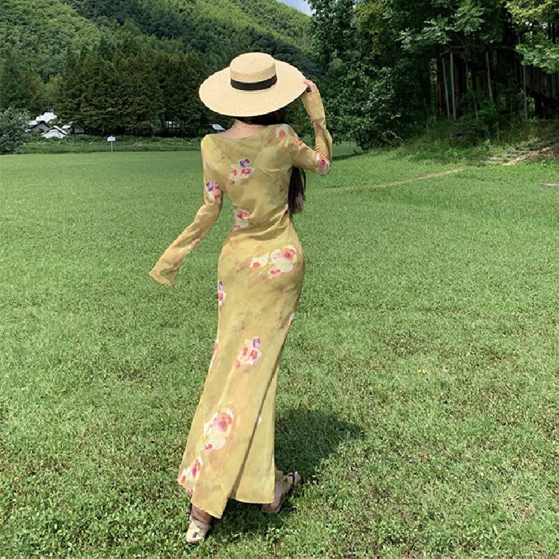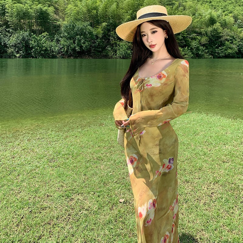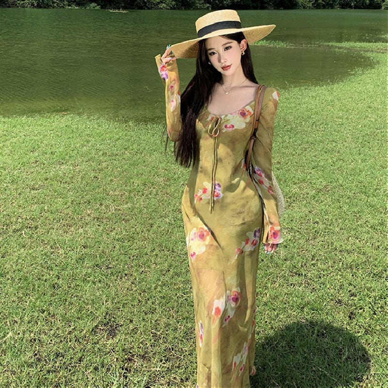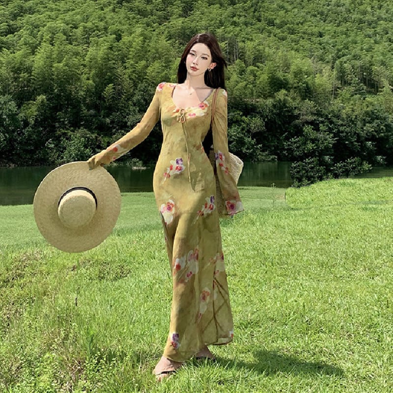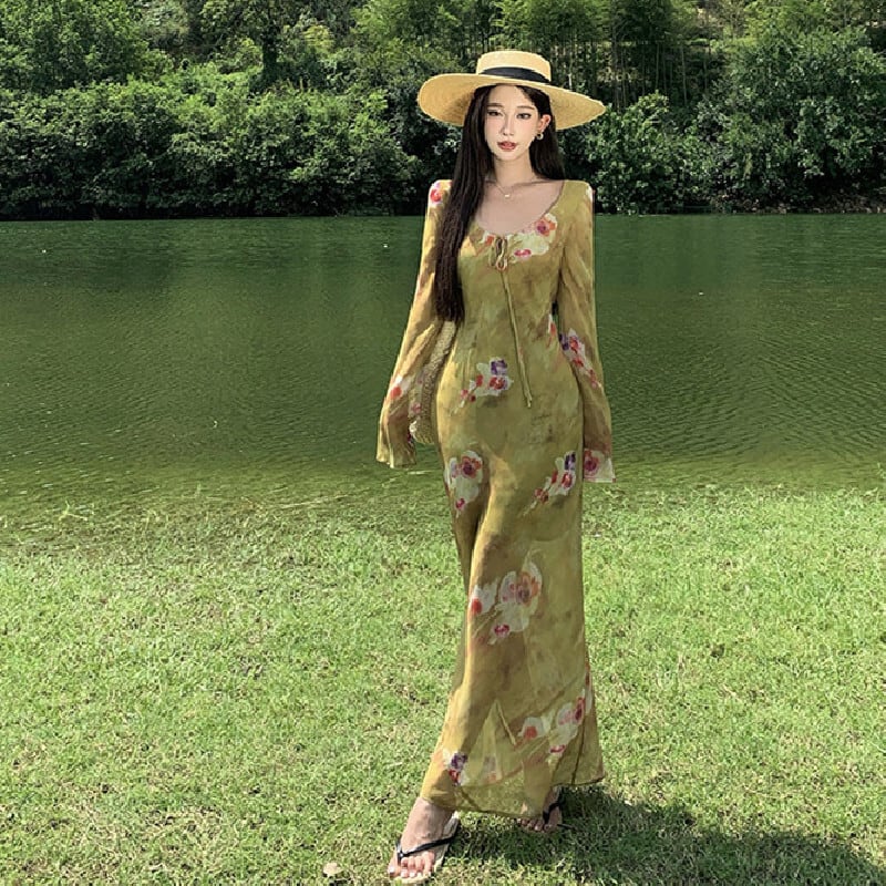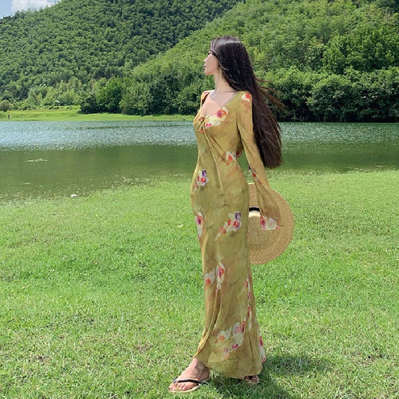 【SummerVacationシリーズ】ワンピース プリント レトロ リゾート風 グリーン S M L