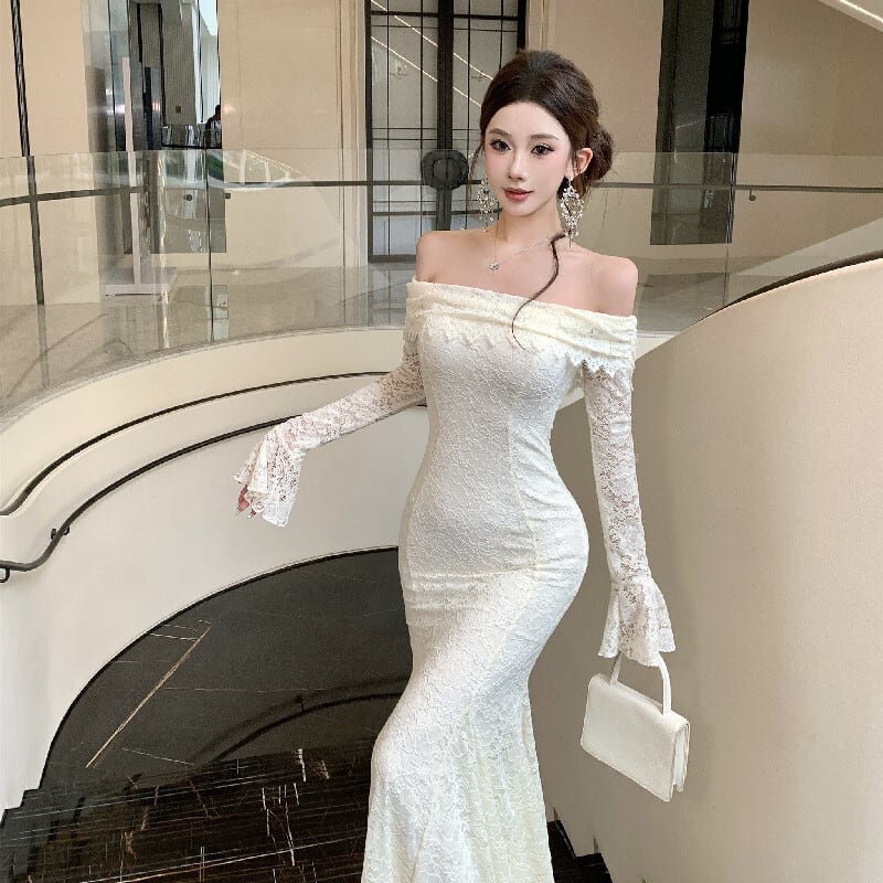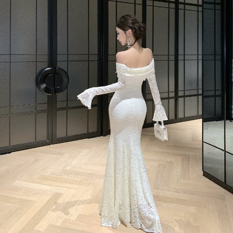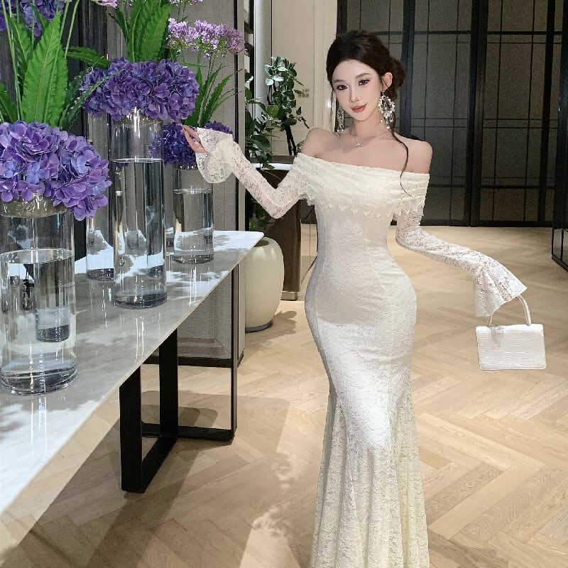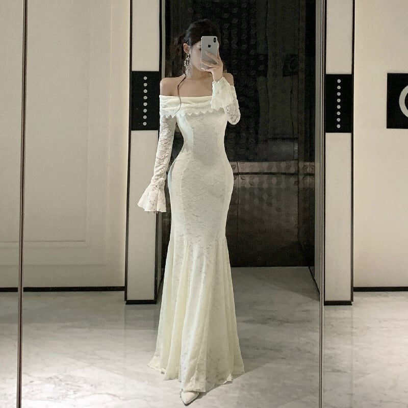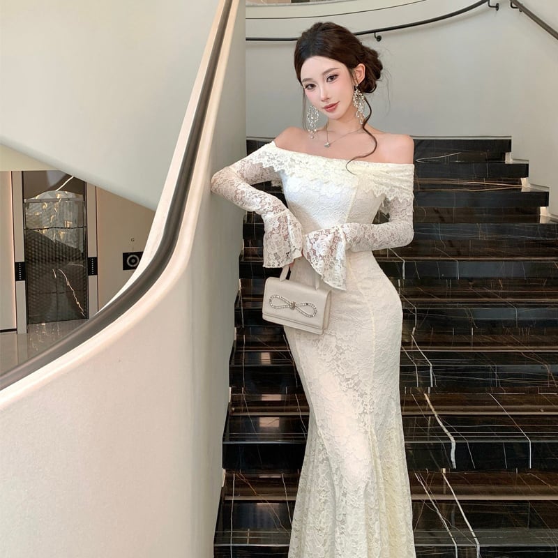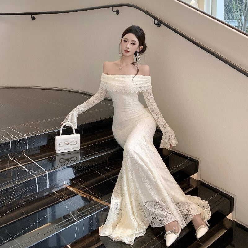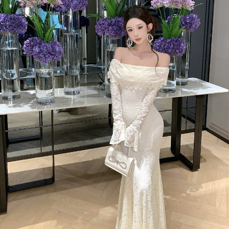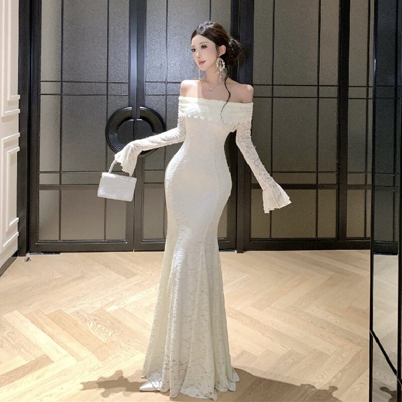 ワンピース レース ボートネックデザイン ロング丈 魅せられる ライトベージュ S M L