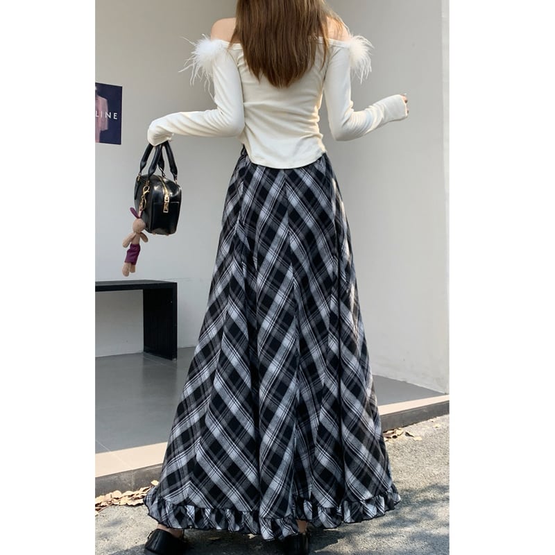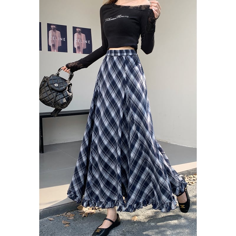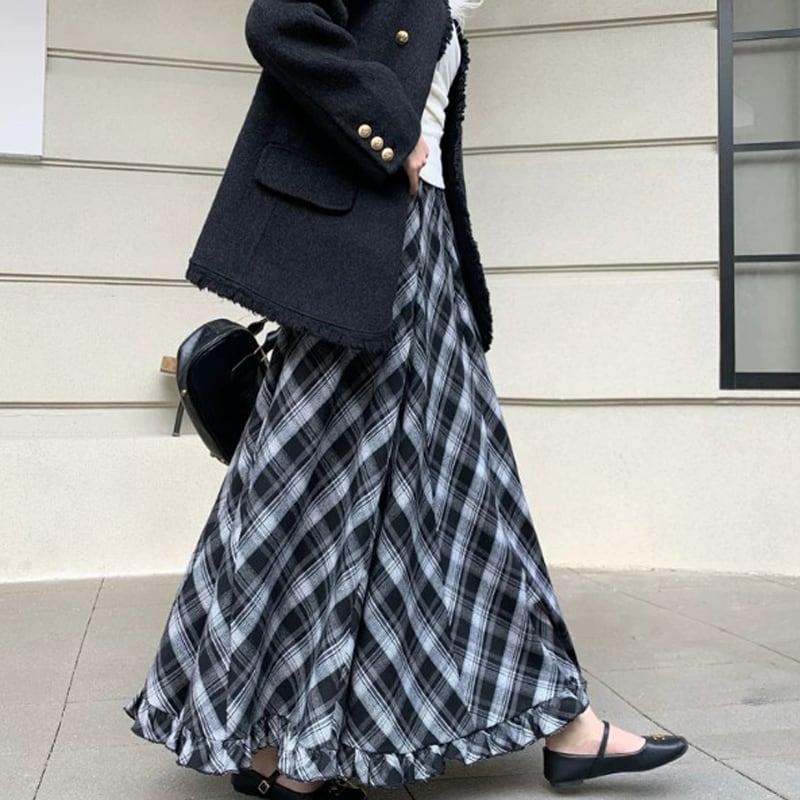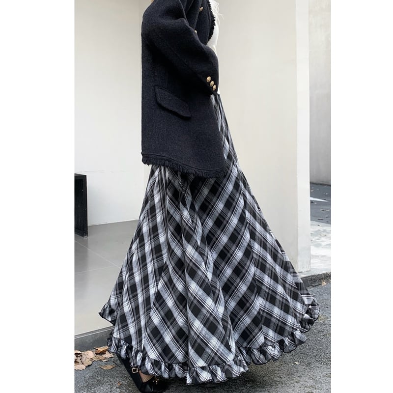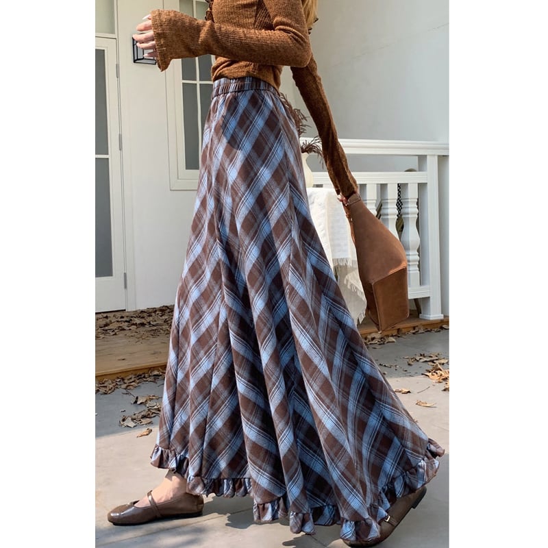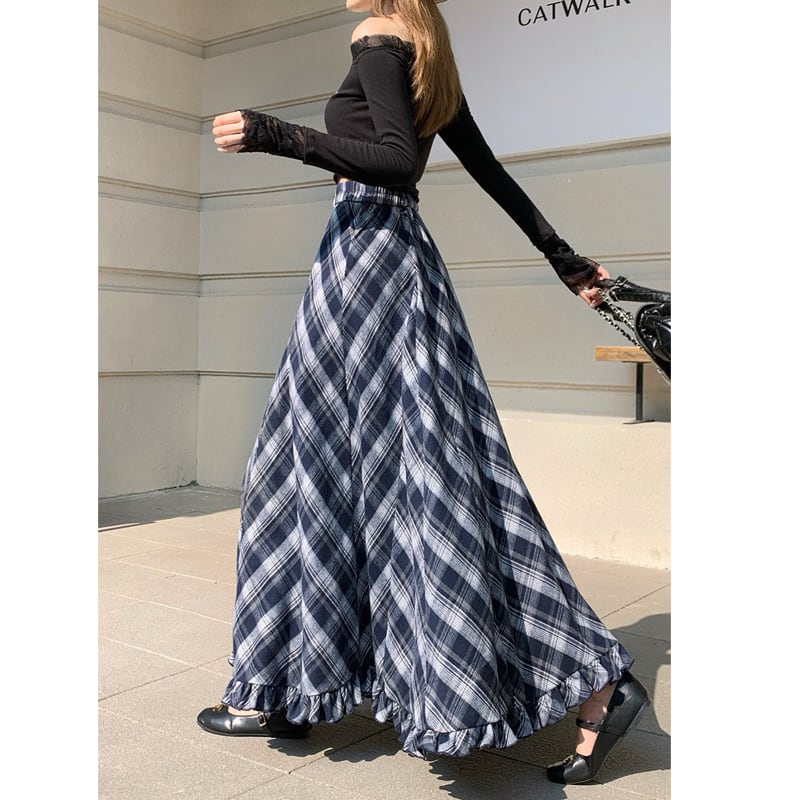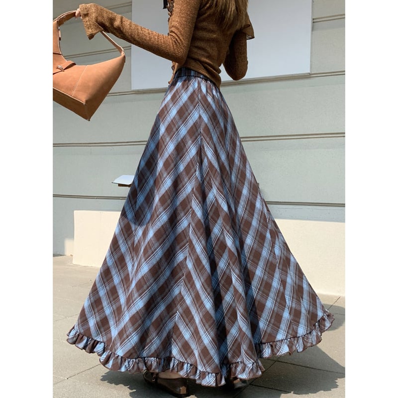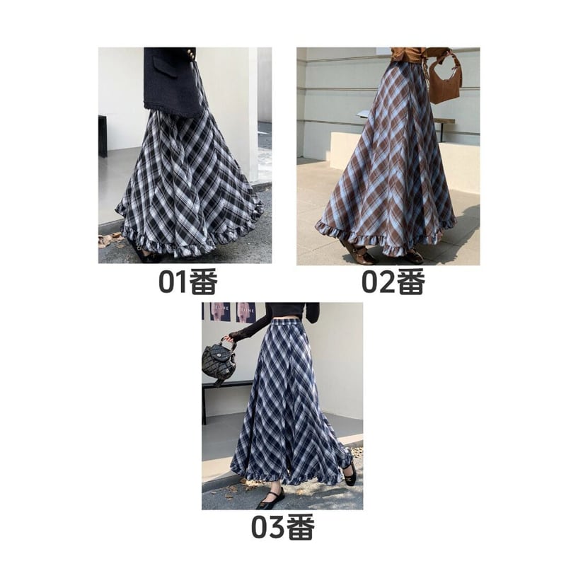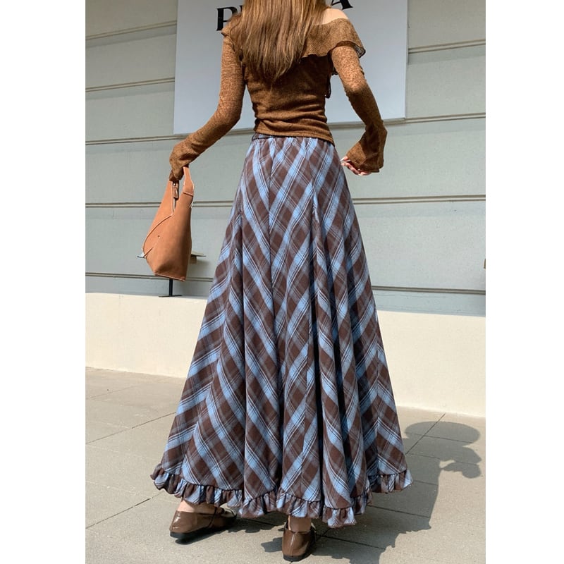 3colors ボトムス スカート ウエストゴム チェック柄 ペプラム ブルー