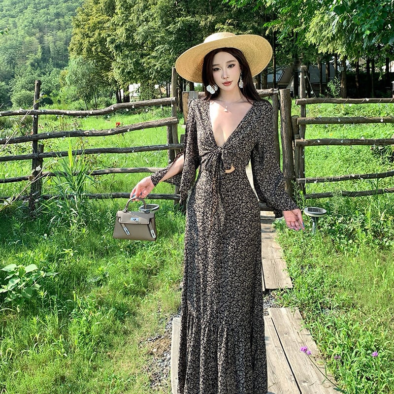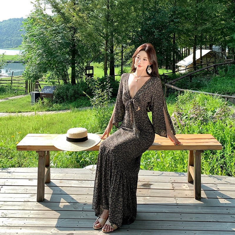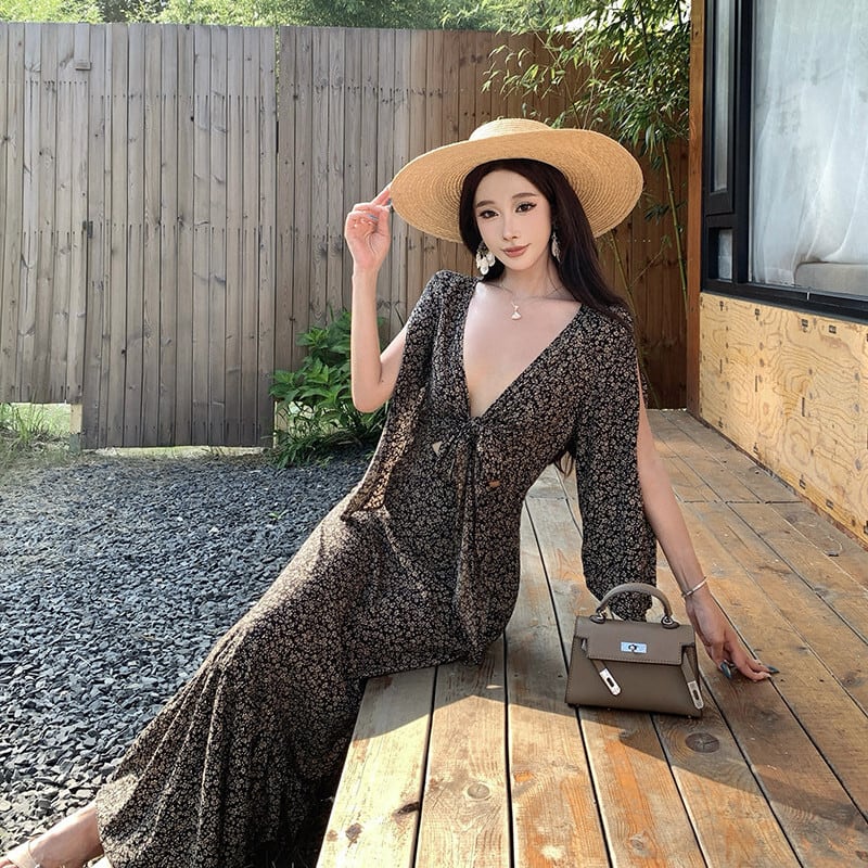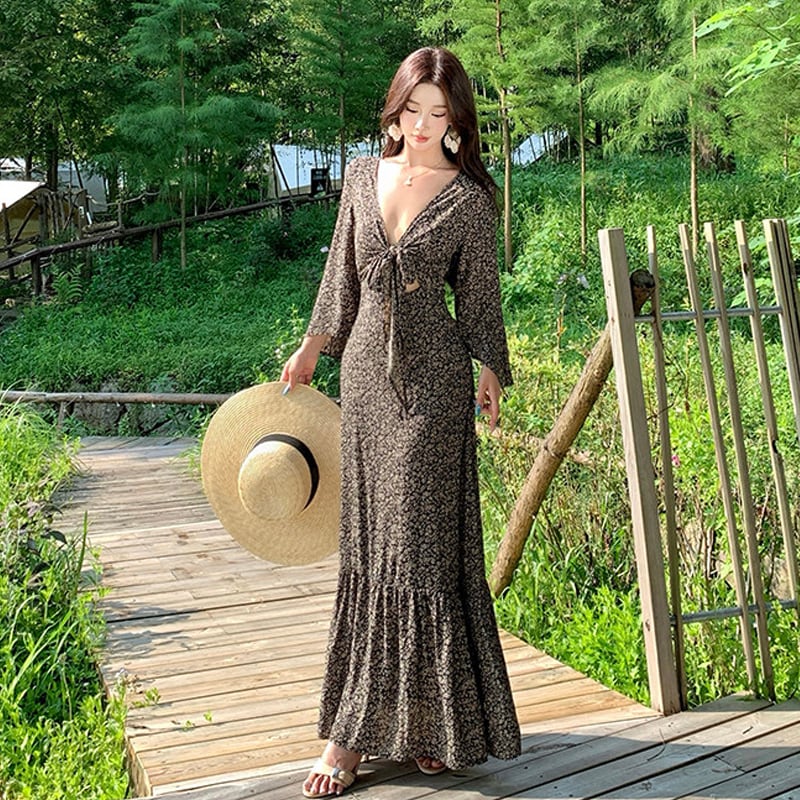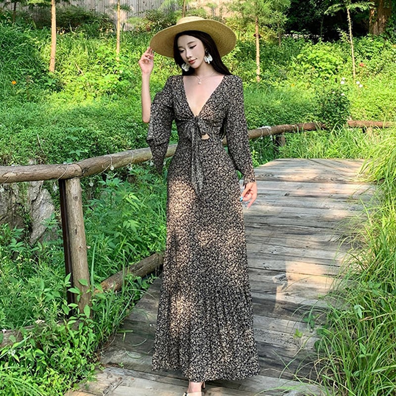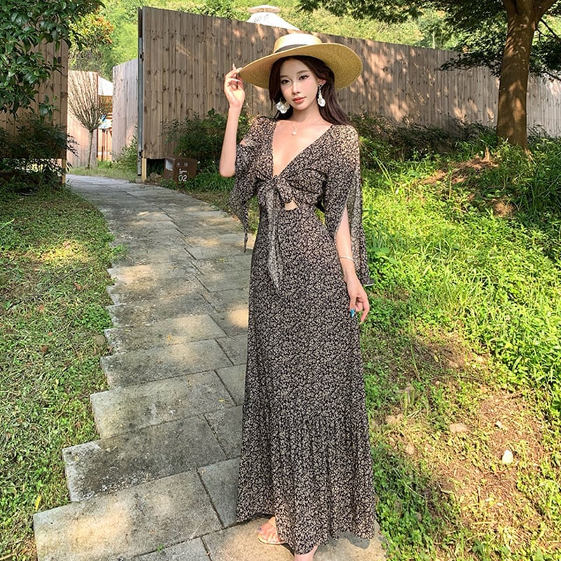 【SummerVacationシリーズ】ワンピース 花柄 Vネック リボンタイ 抜け感デザイン S M L