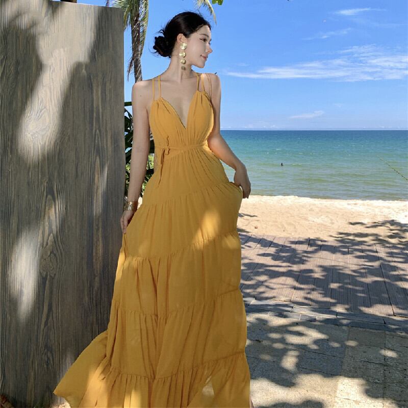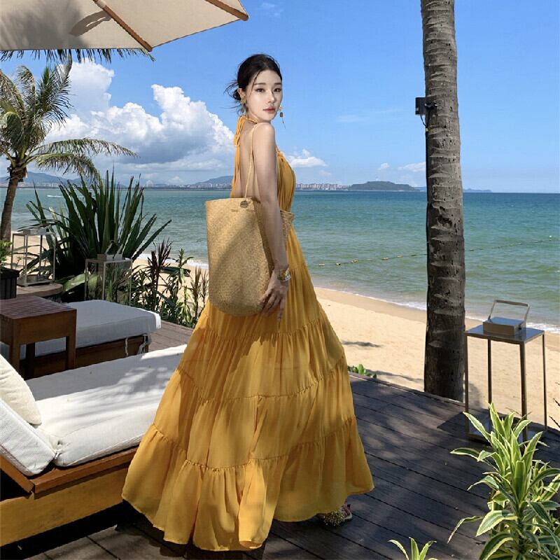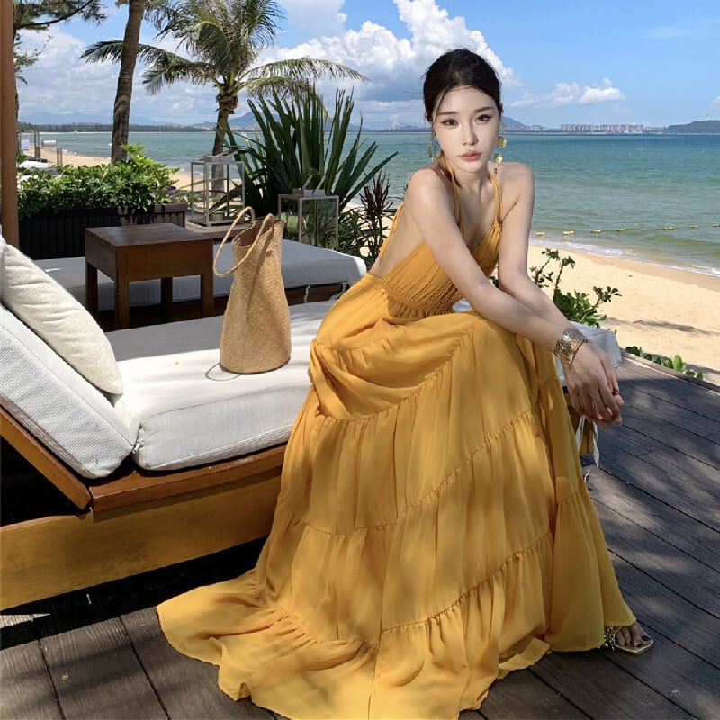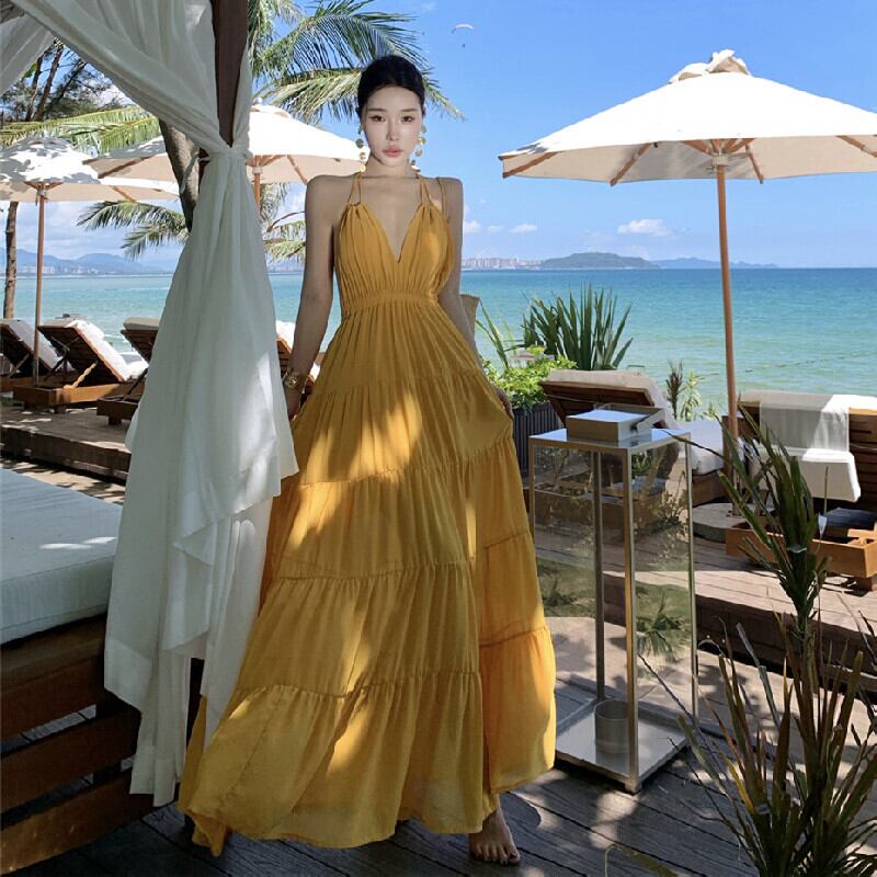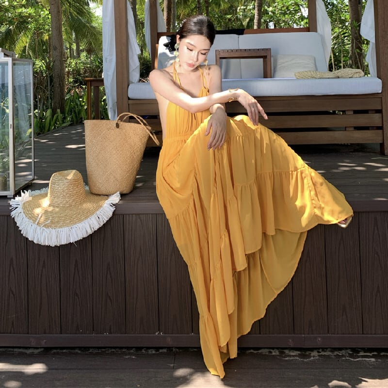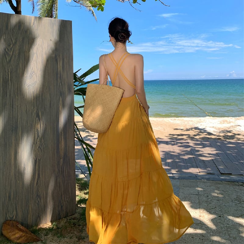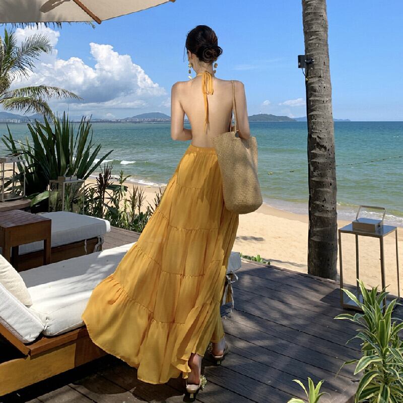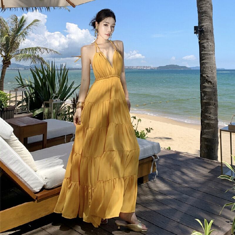 【SummerVacationシリーズ】ワンピース バックレス 無地 リゾートライク イエロー S M L