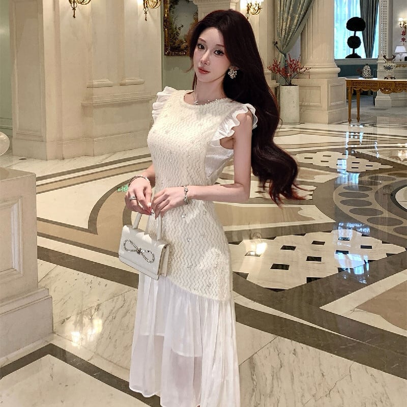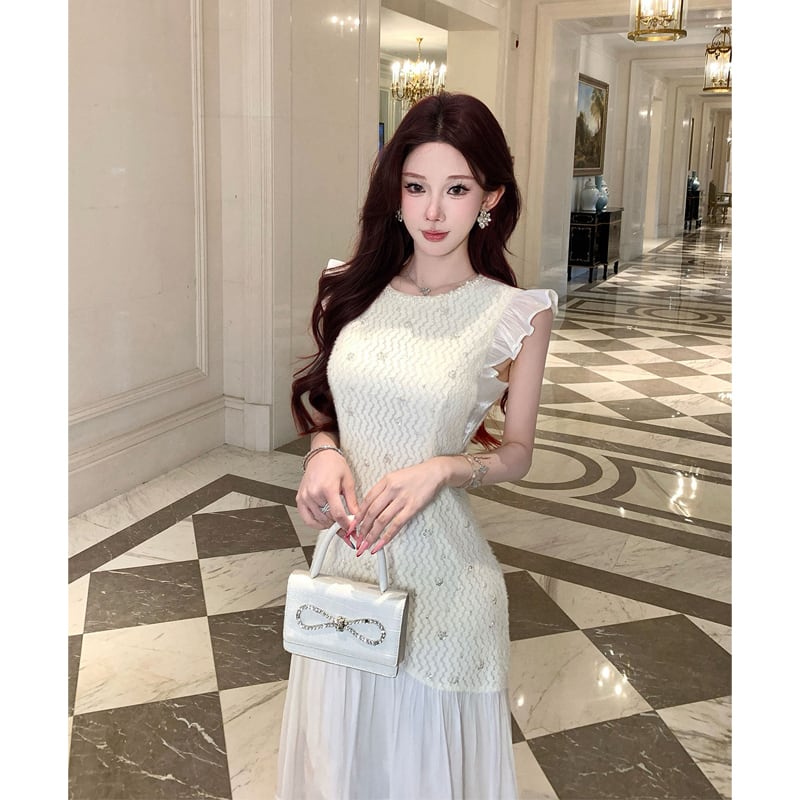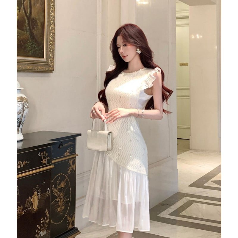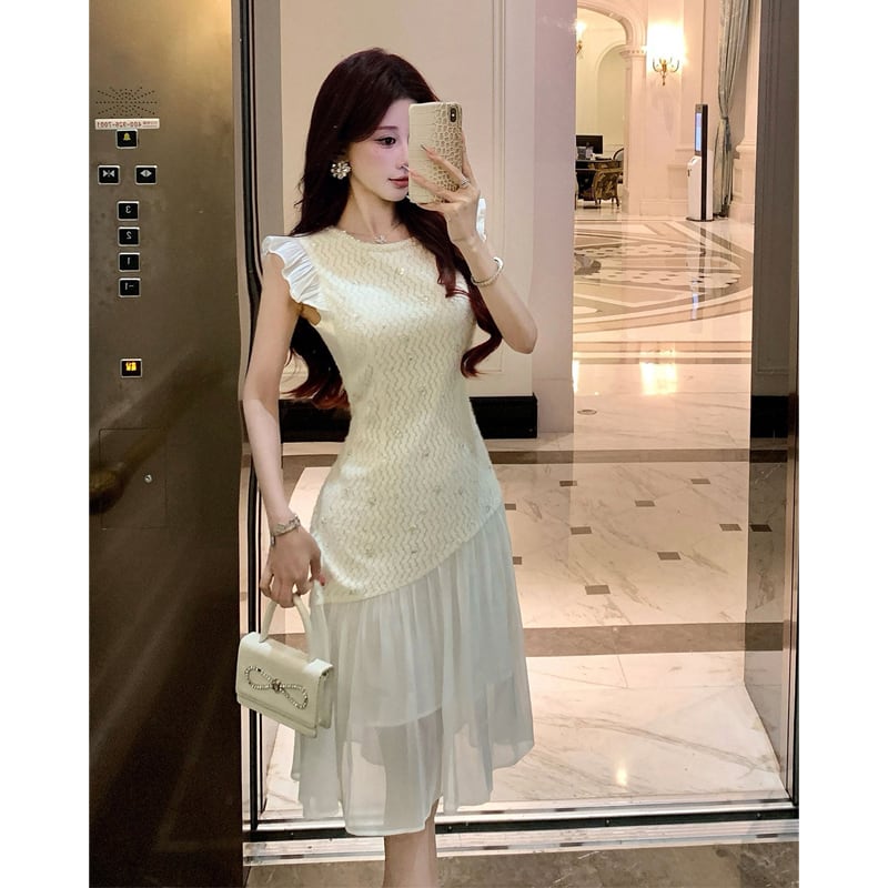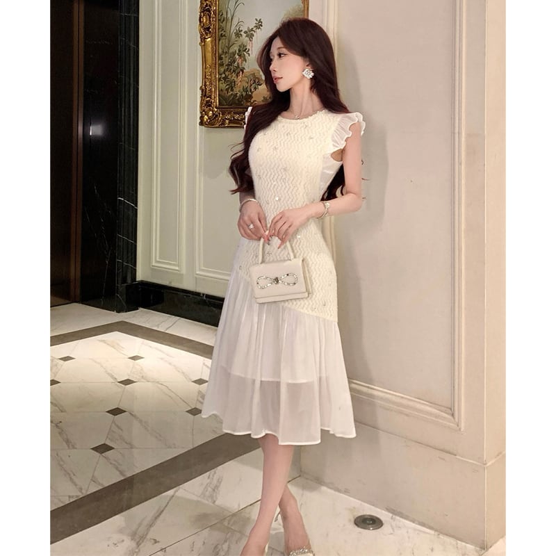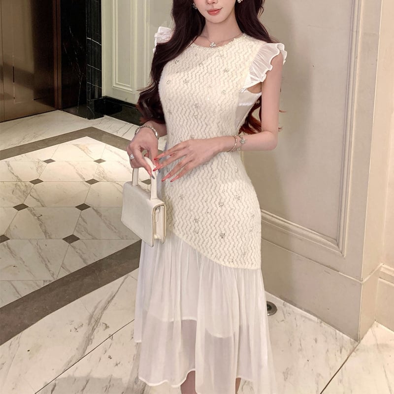 ワンピース フリル袖 メッシュ エレガント スパンコール ライトベージュ S M L